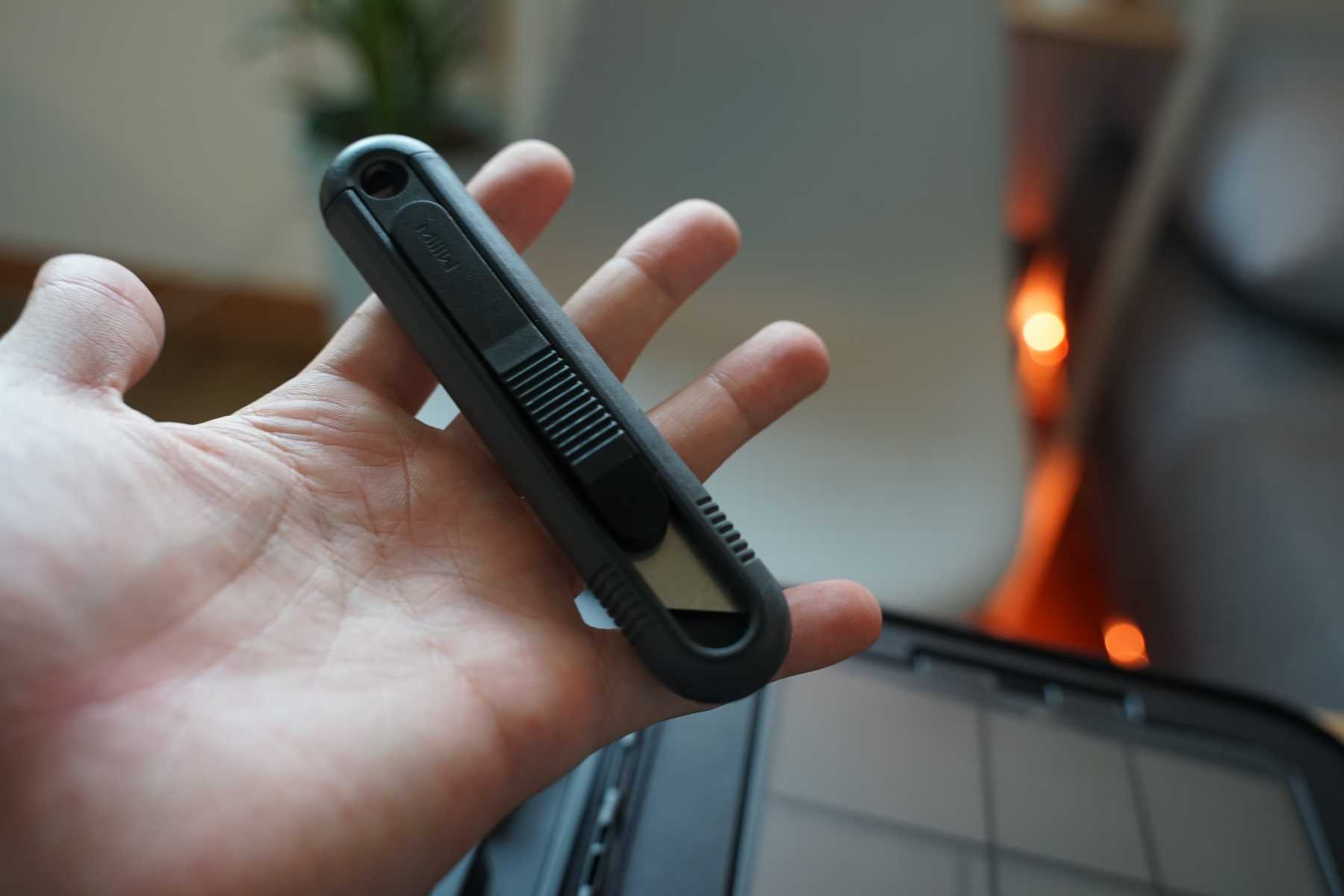 그래서 제가 지금 언박싱 영상을 찍을 때는 다 이 나이프로 사용을 하고 있는데요. 이 나이프가 또 특이한게 뭐냐면 그냥 우리가 일반적으로 쓰는 커터칼은 이렇게 드르륵 올리고, 드르륵 내리는 방식이잖아요.
