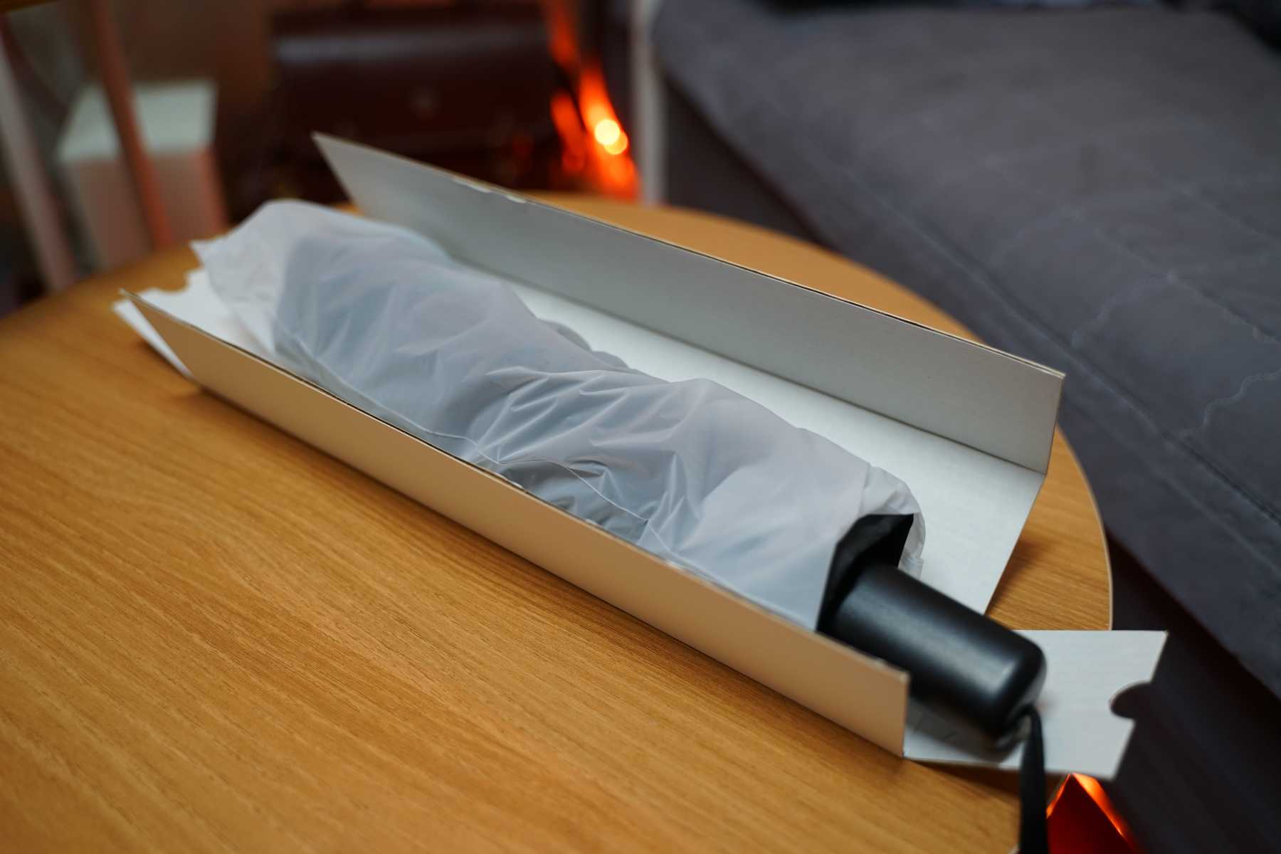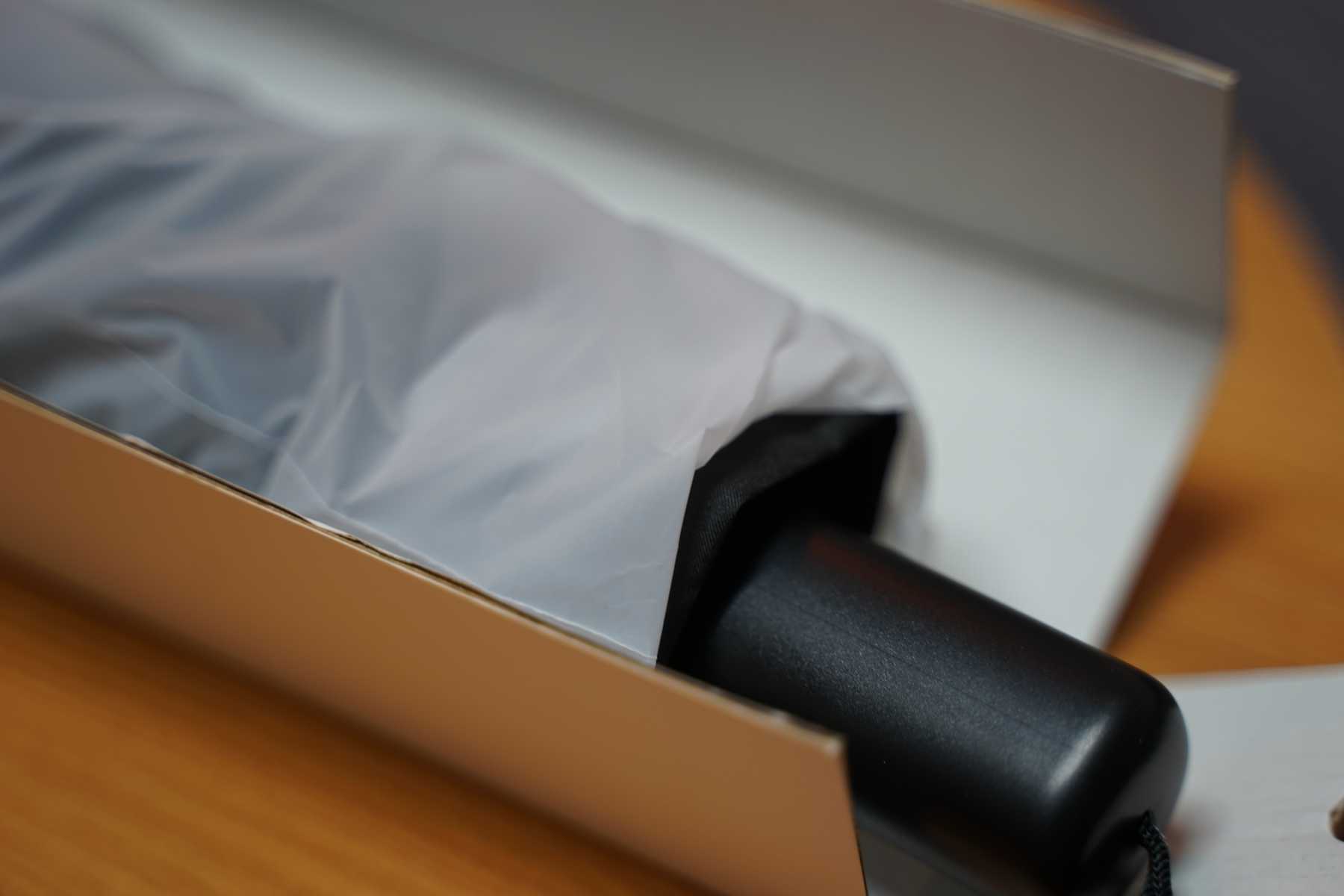 우산이 이렇게 비닐에 싸여 있습니다. 이렇게 생겼어요. 이렇게만 보면은 그냥 평범한 3단 우산처럼 생겼습니다 뭐 그렇게 특별해 보이지는 않아요.