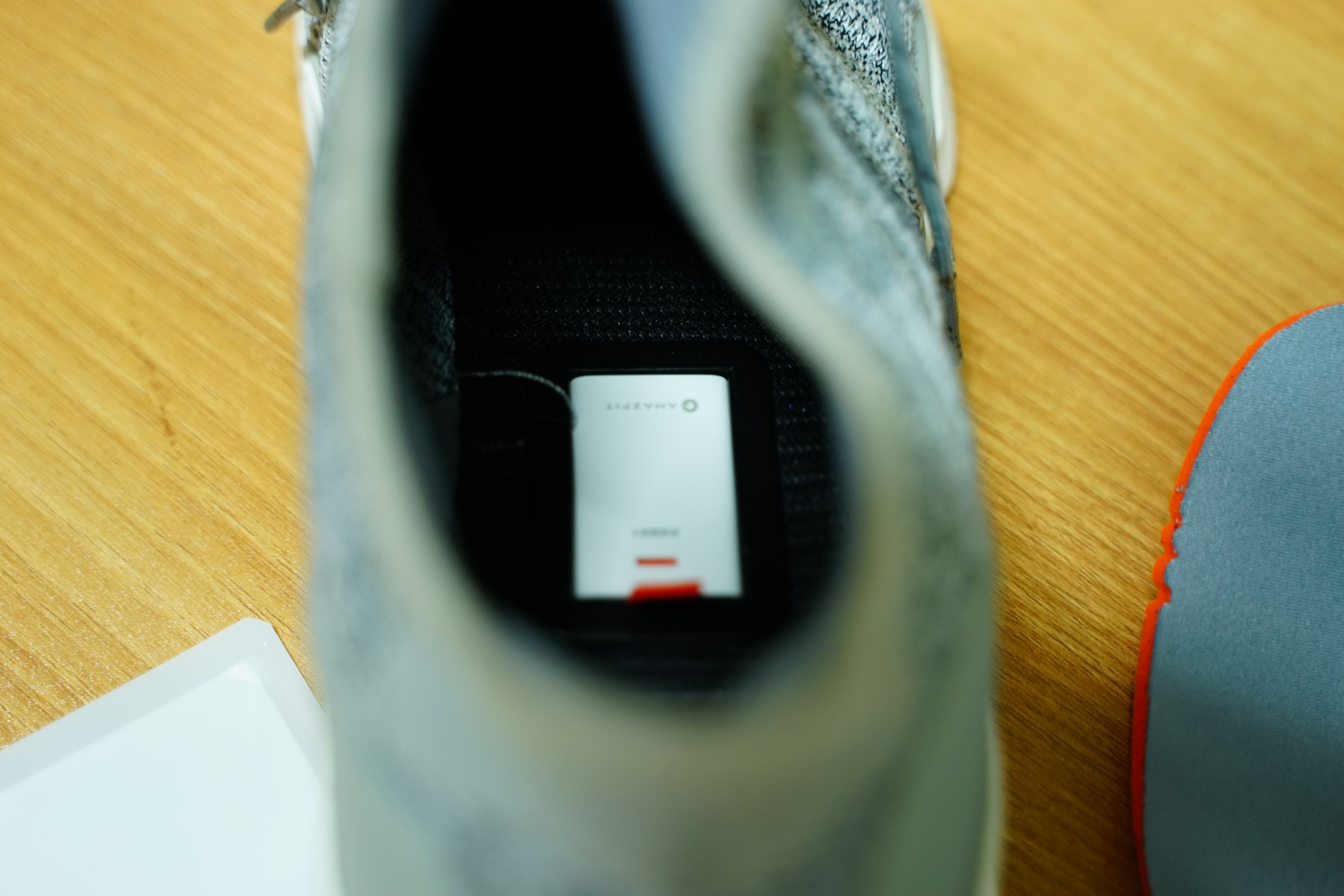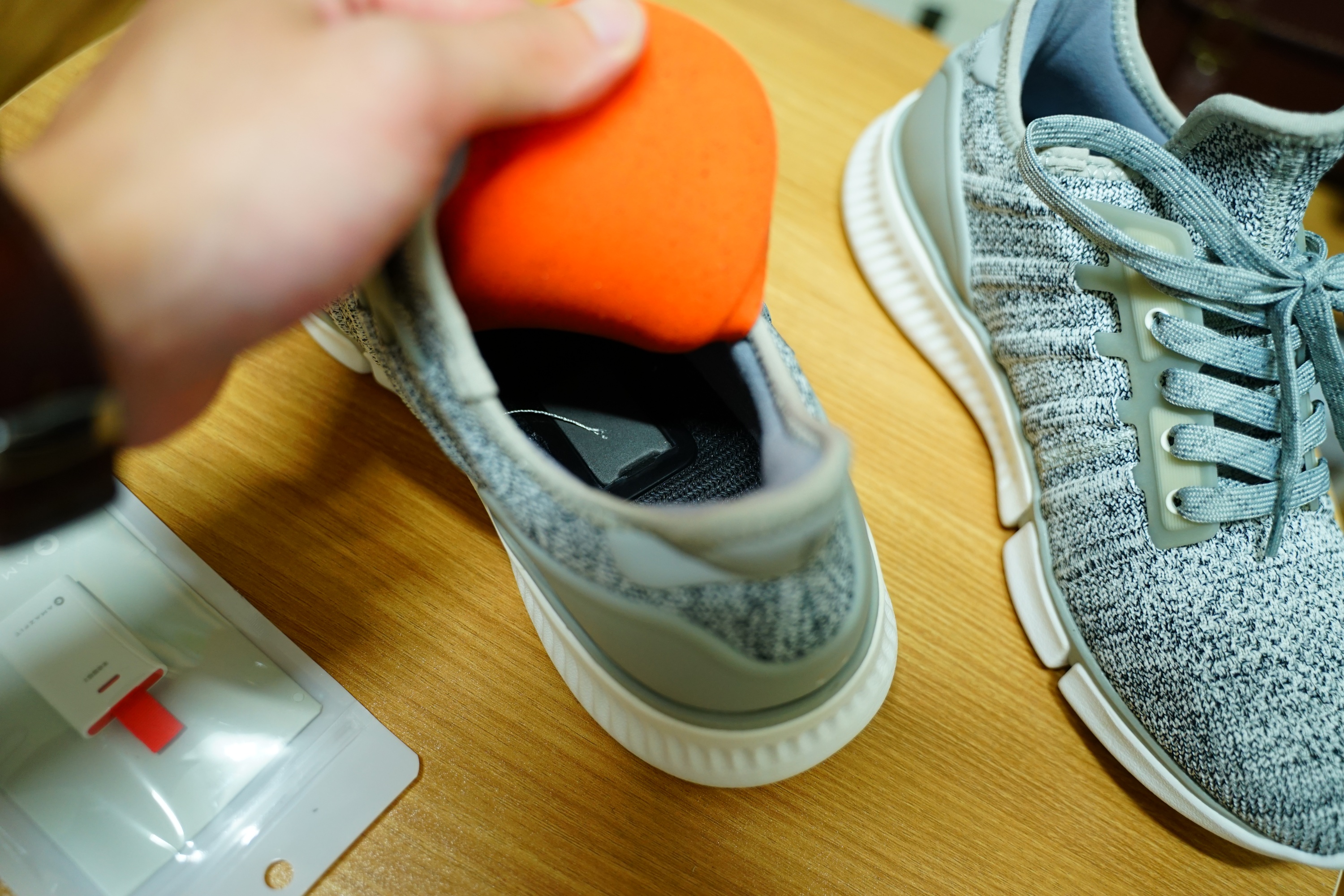 신발 깔창을 들어 올리면 저런 식으로 홈이 파여져 있고, 임시로 플라스틱이 들어가 있는데, 저걸 빼고 칩을 넣으면 됩니다.