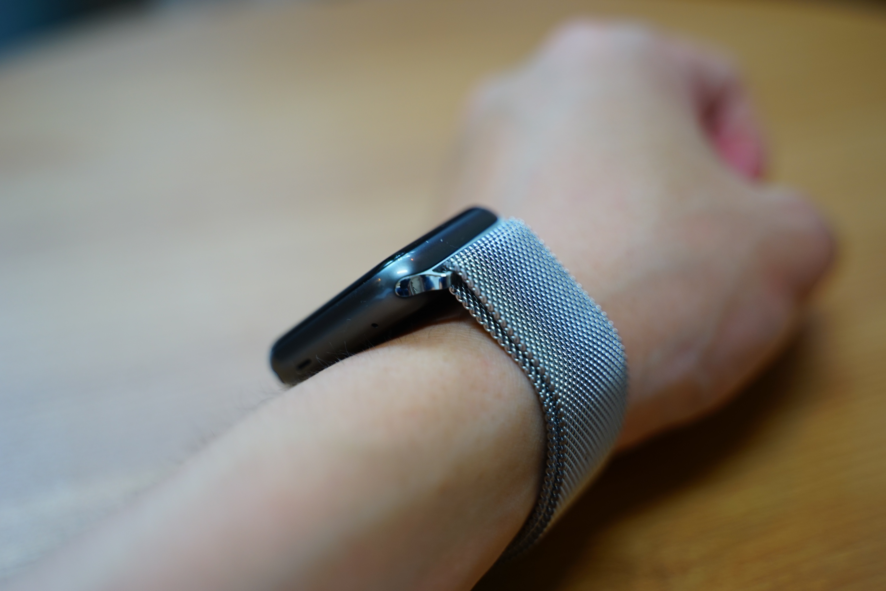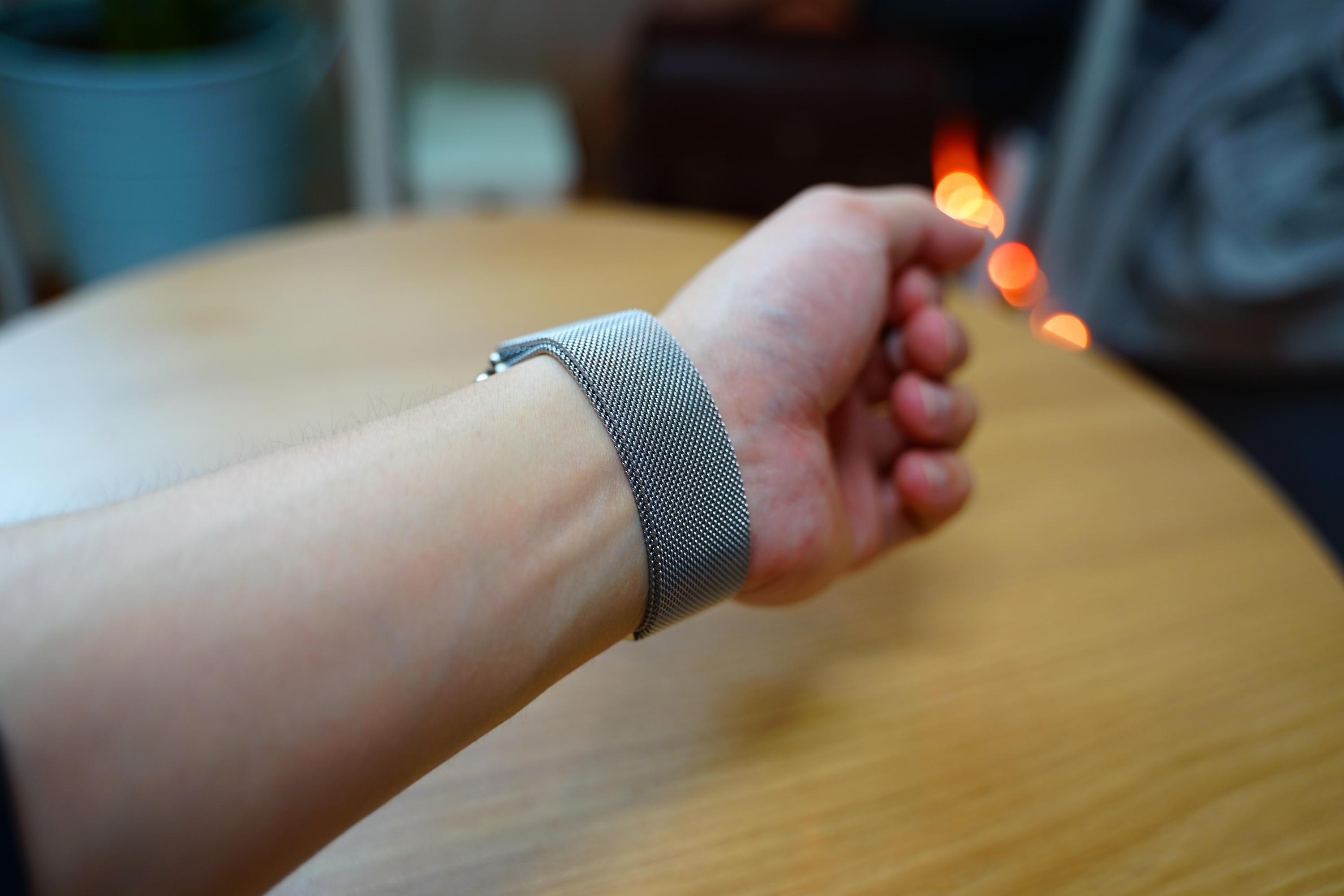 아무래도 다른 가죽밴드나 이런 것들은 최소단위 때문에 어느 정도 손목과의 간격이 있기 마련인데, 이 밀레니즈루프는 그냥 손목에 딱 맞을 때까지 줄을 쫙 땡겨서 자석으로 그냥 붙여주기만 하면 되니까 손목 사이즈가 어떻든지간에 자기 손목에 정말 딱 맞출 수 있다는 장점이 있는 것 같습니다.