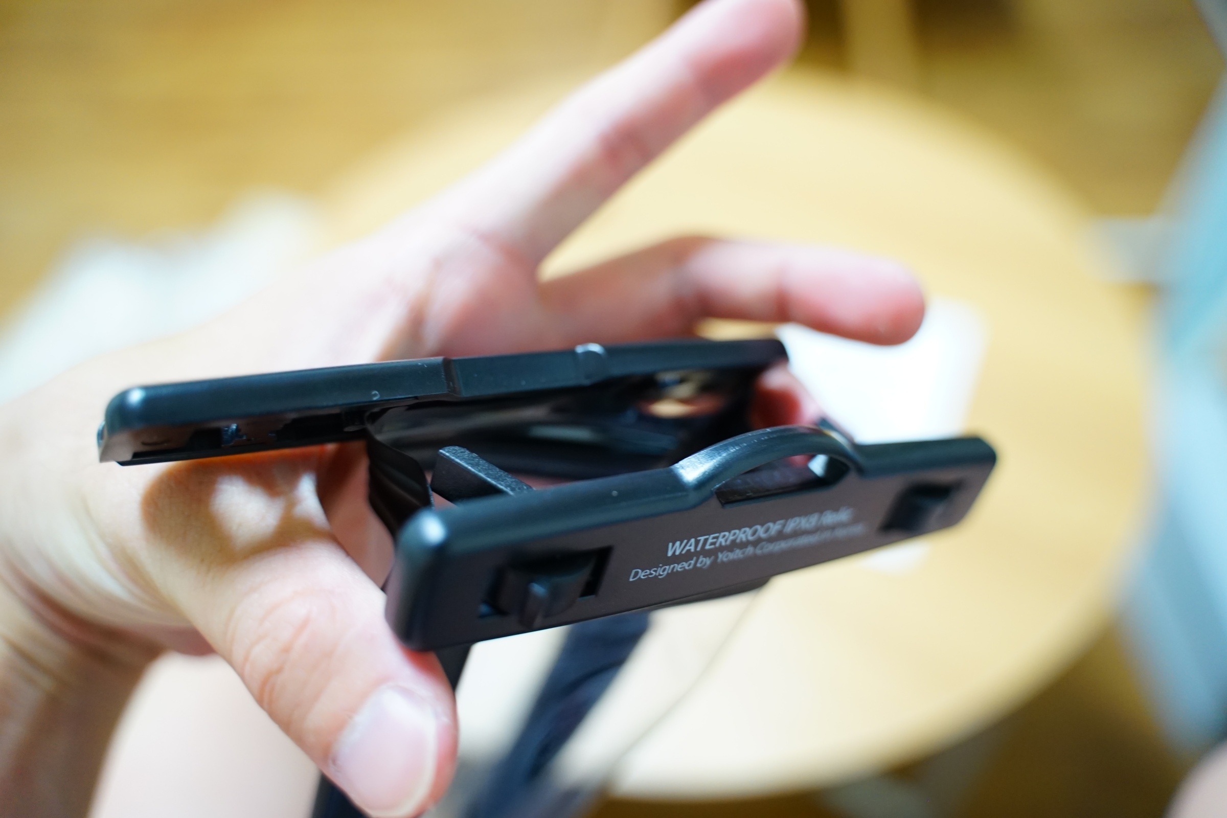 스마트폰을 넣고 잠글 때엔 저 잠금장치를 이용해서 고정하면 됩니다. 상당히 단단하게 잠겨서 안으로 물이 들어갈 염려는 안 해도 될 것 같습니다.