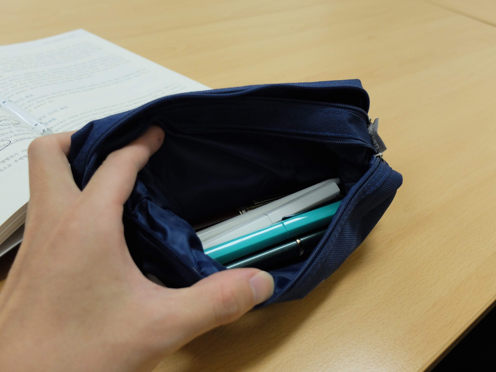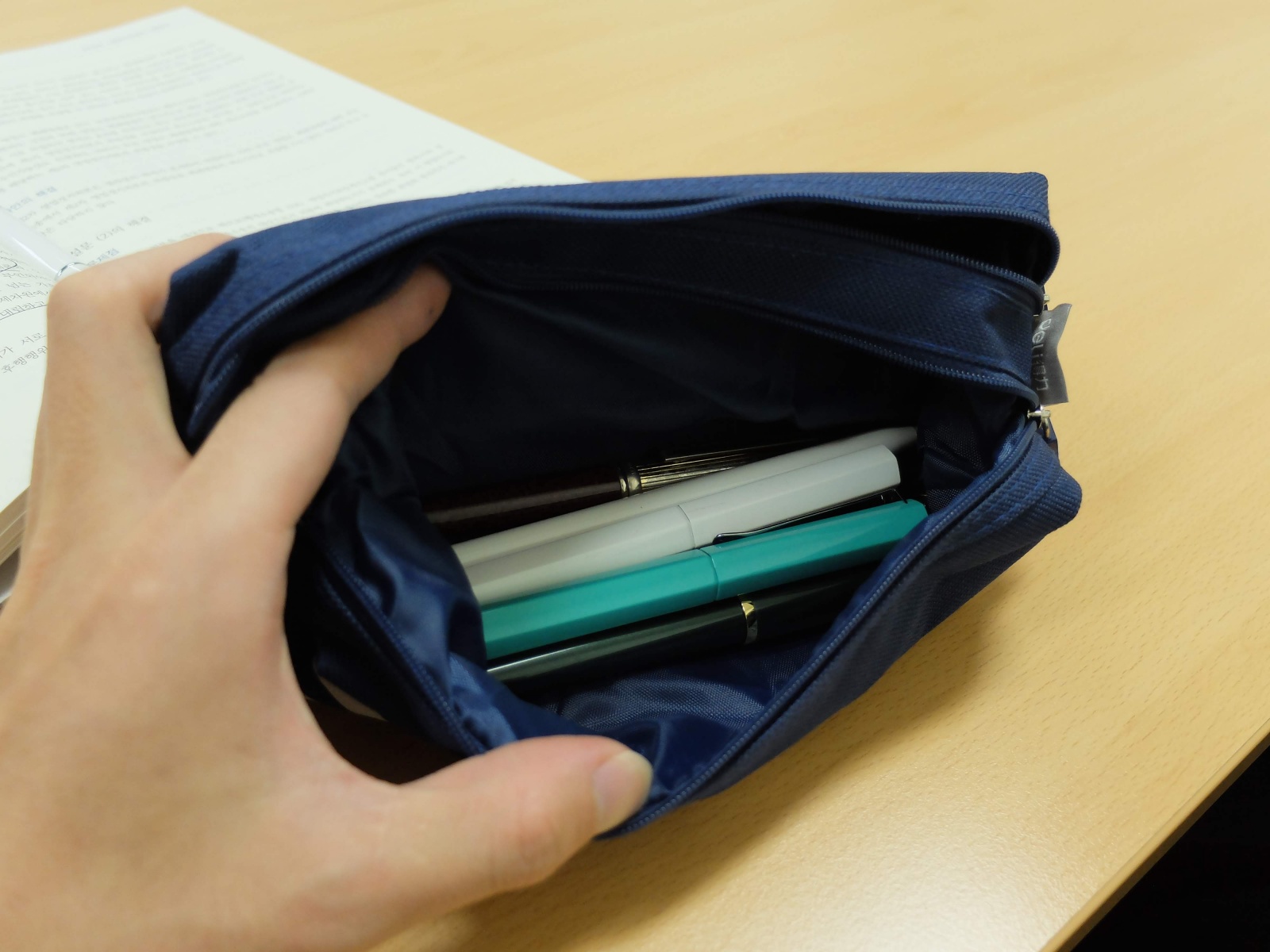 그래서 양쪽의 용도를 나름대로 나눠서 사용할 수 있습니다. 뭐 예를 들어서 한쪽에는 필기구만 넣고 한쪽에는 소소한 화장품들을 넣는다든지, 아니면 한쪽에는 만년필만 넣고 다른 쪽에는 다른 필기구들을 넣는다든지 하는 식으로 자기 용도에 따라서 구분해서 사용할 수 있습니다.
