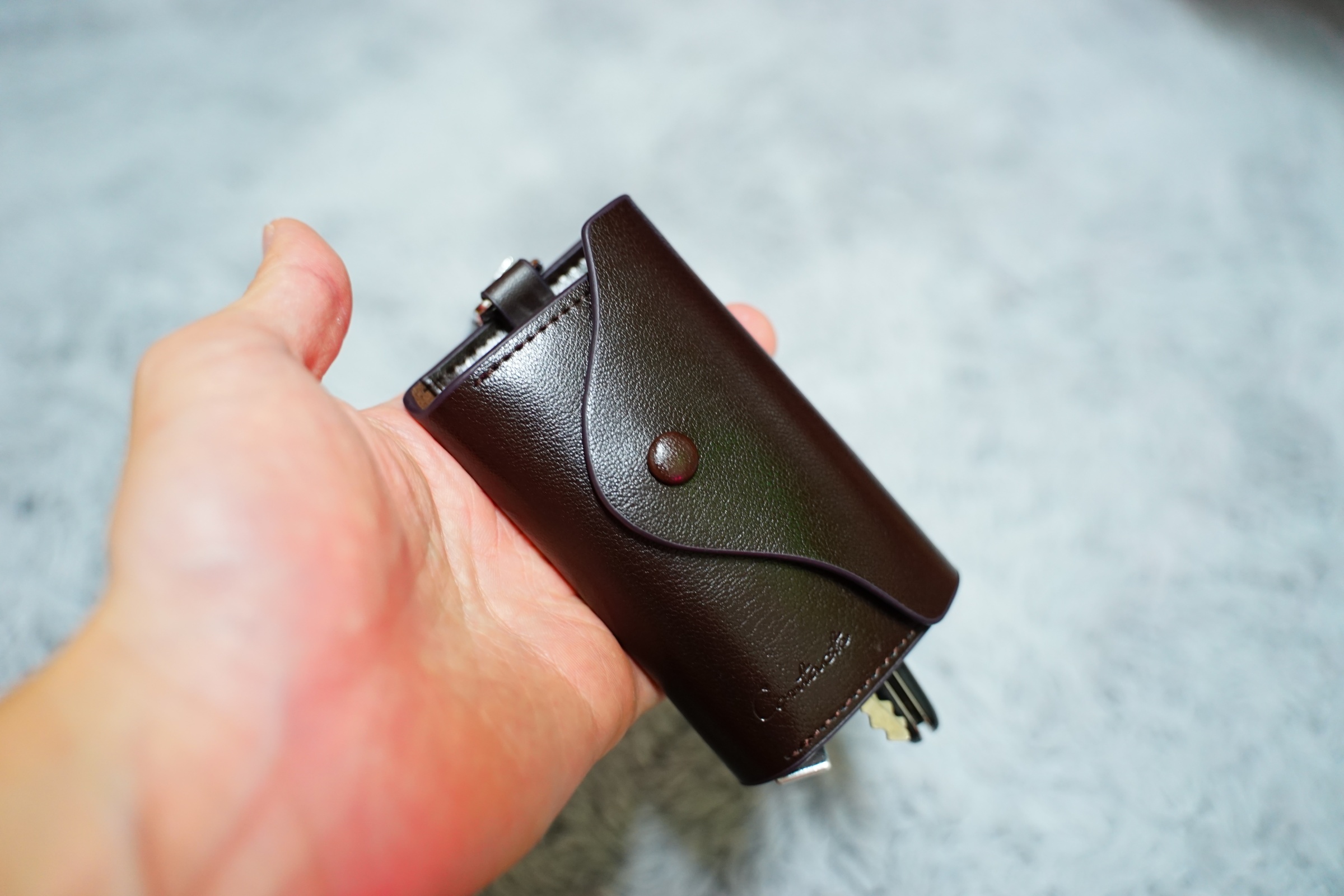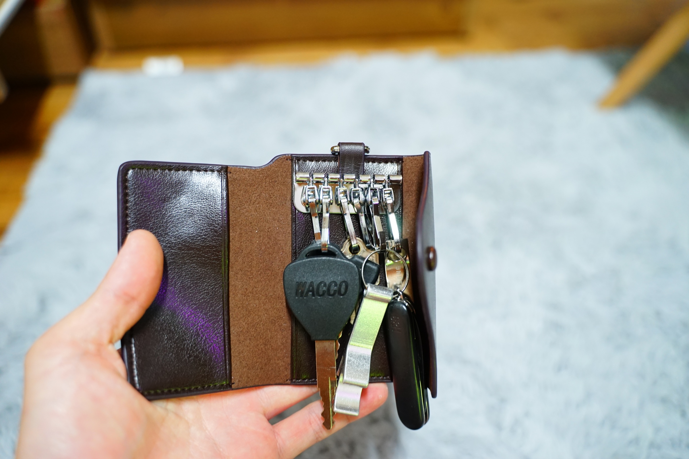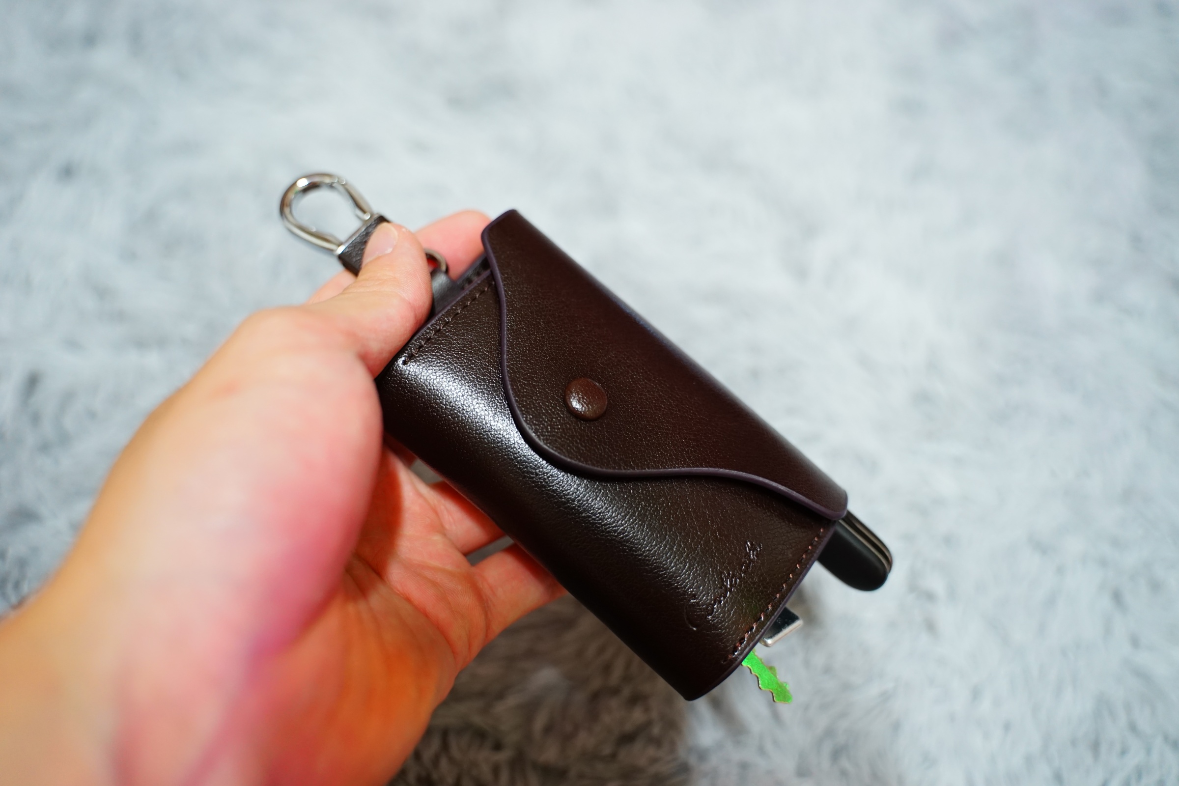 그리고 이렇게 열쇠 뒤쪽과 왼쪽에 포켓이 있어서 카드도 함께 수납할 수 있습니다 .