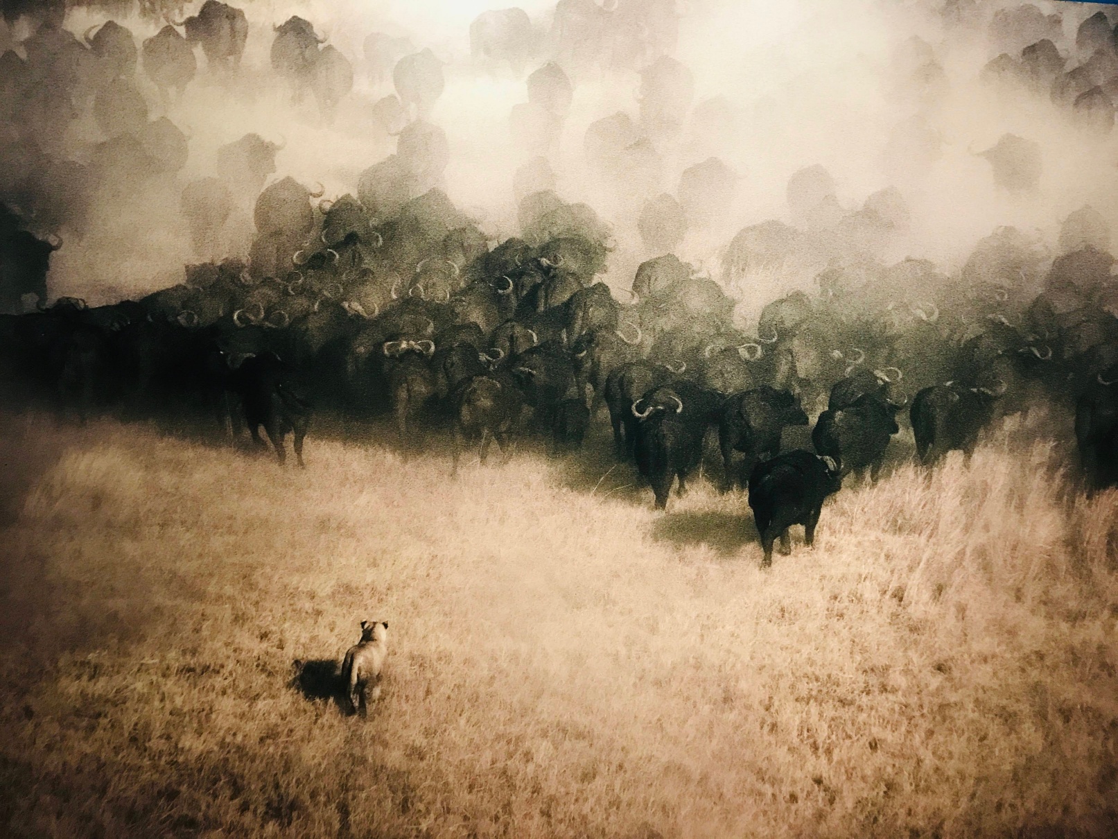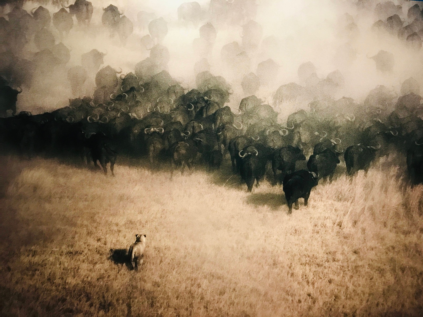 암사자 한 마리가 물소 떼와 마주하고 있습니다. 먹이사슬의 최상위에 군림하고 있으면서도 무리에 대항하는 건 쉽지 않겠죠. 혼자 잘난 것보다 세력을 이루는 게 중요하다는 걸 또 깨닫습니다.