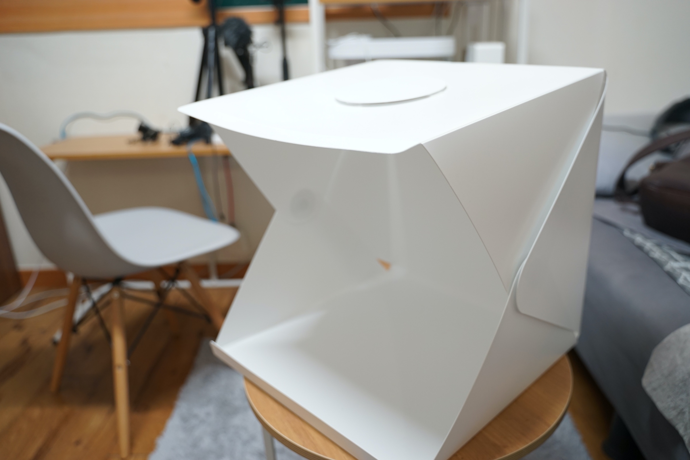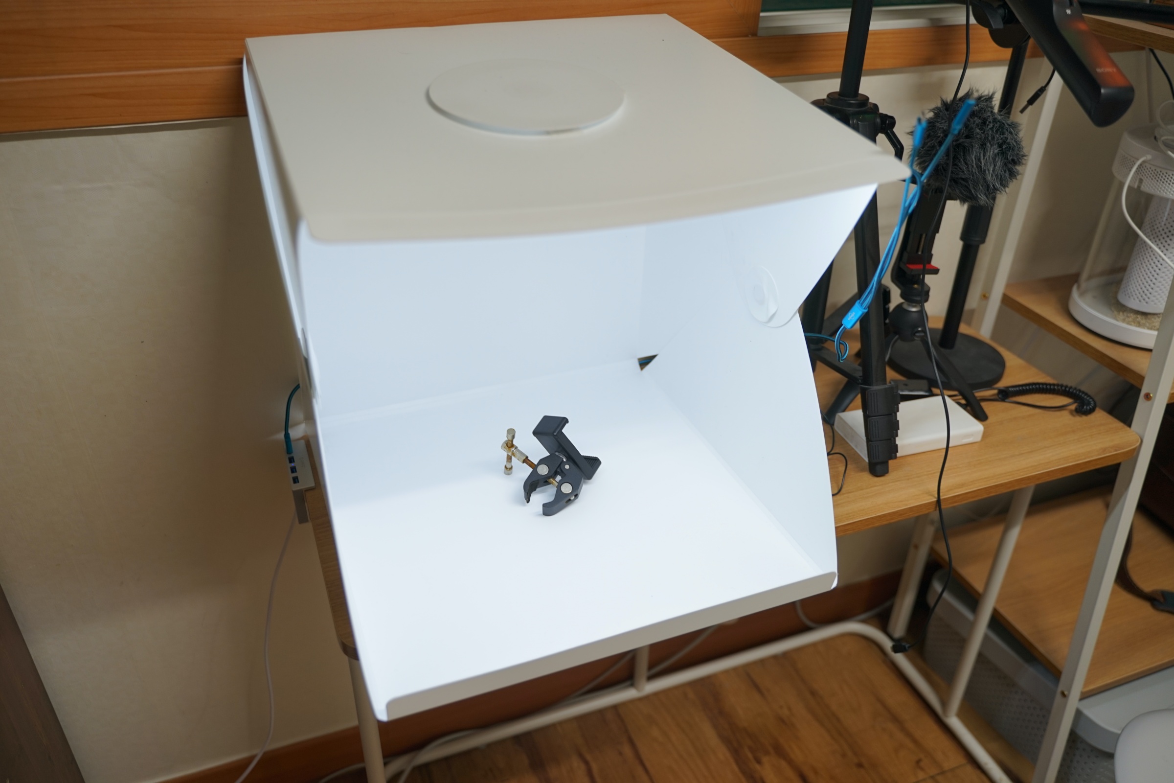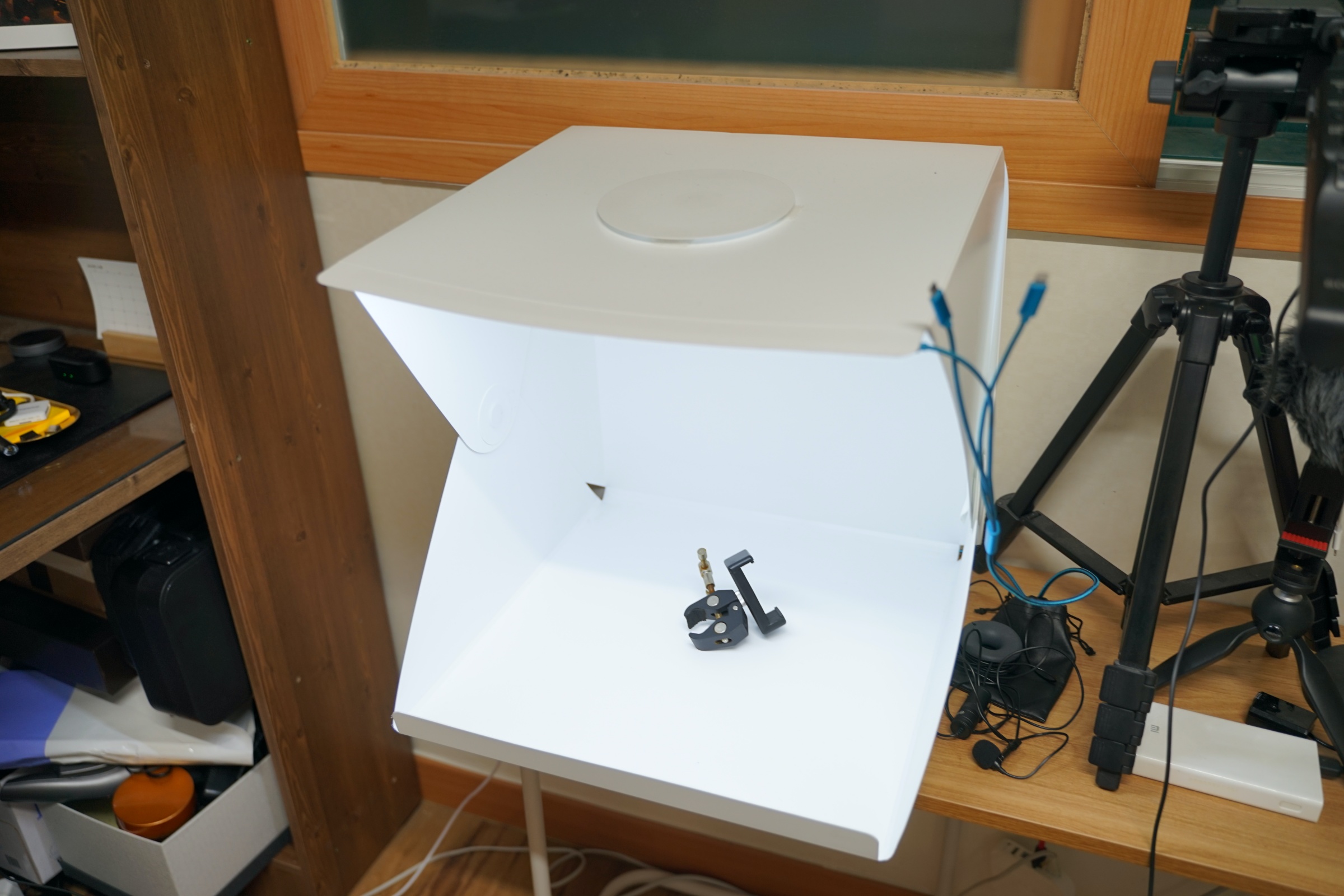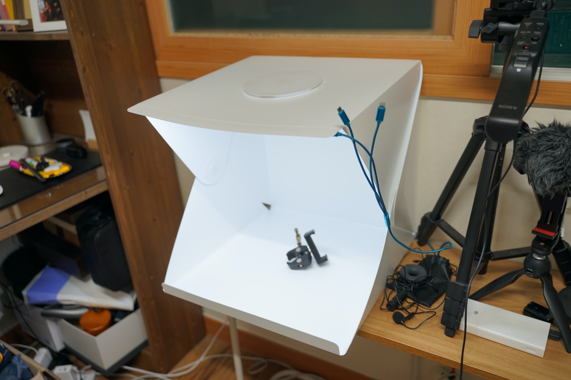 이번에 소개할 제품은 휴대용 미니 스튜디오입니다. 사실 휴대용이지만 저는 휴대하면서 쓸 일은 없어서 그냥 집에 이런 식으로 두고 사용을 하고 있습니다.