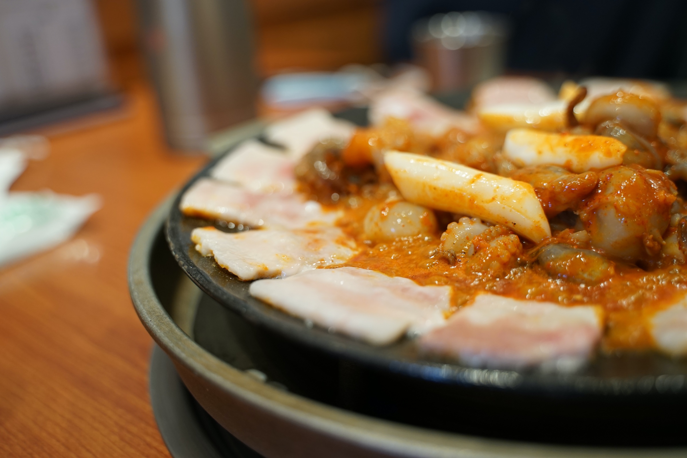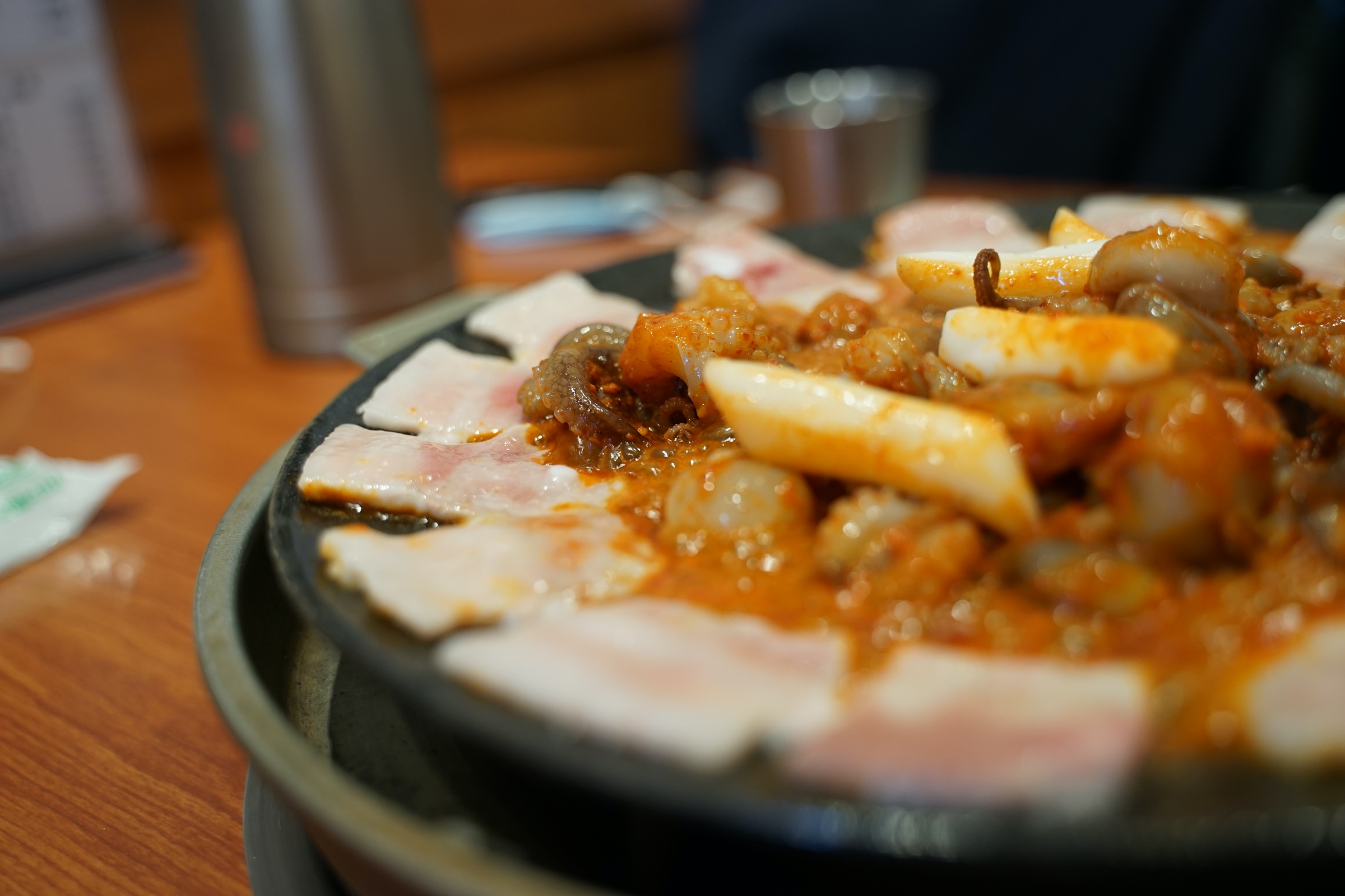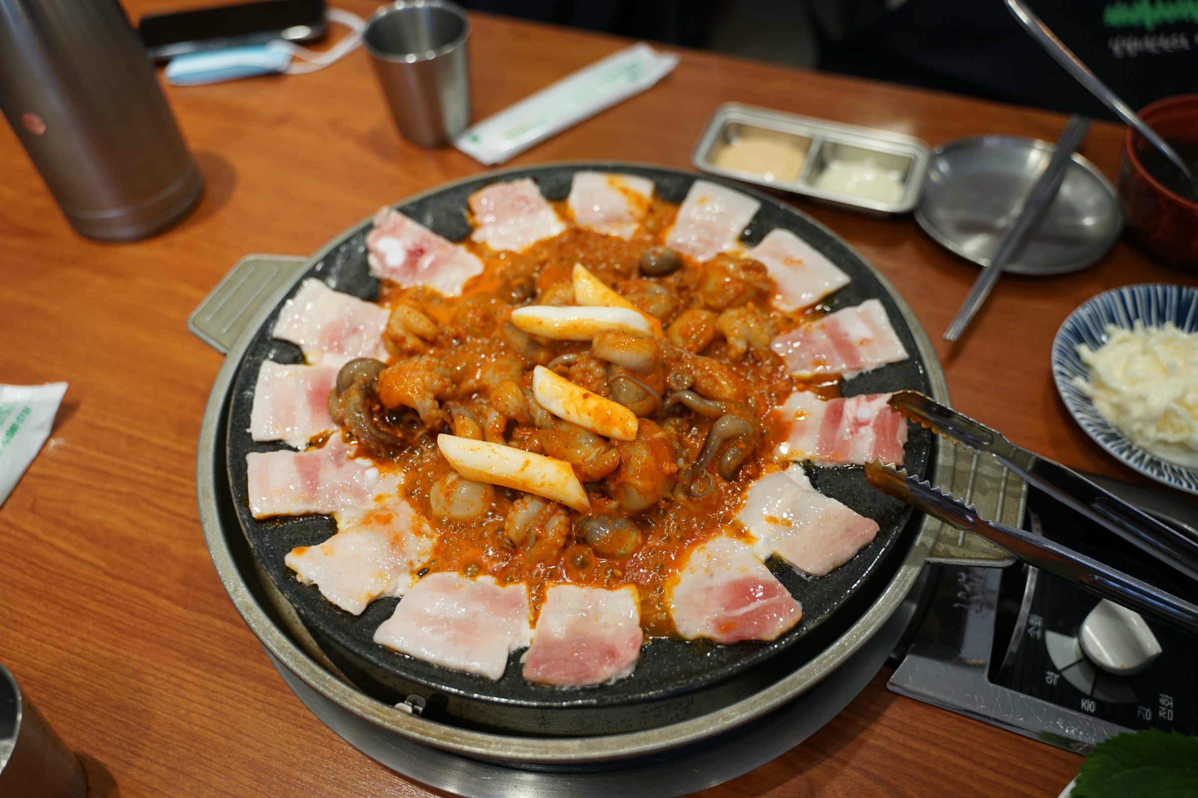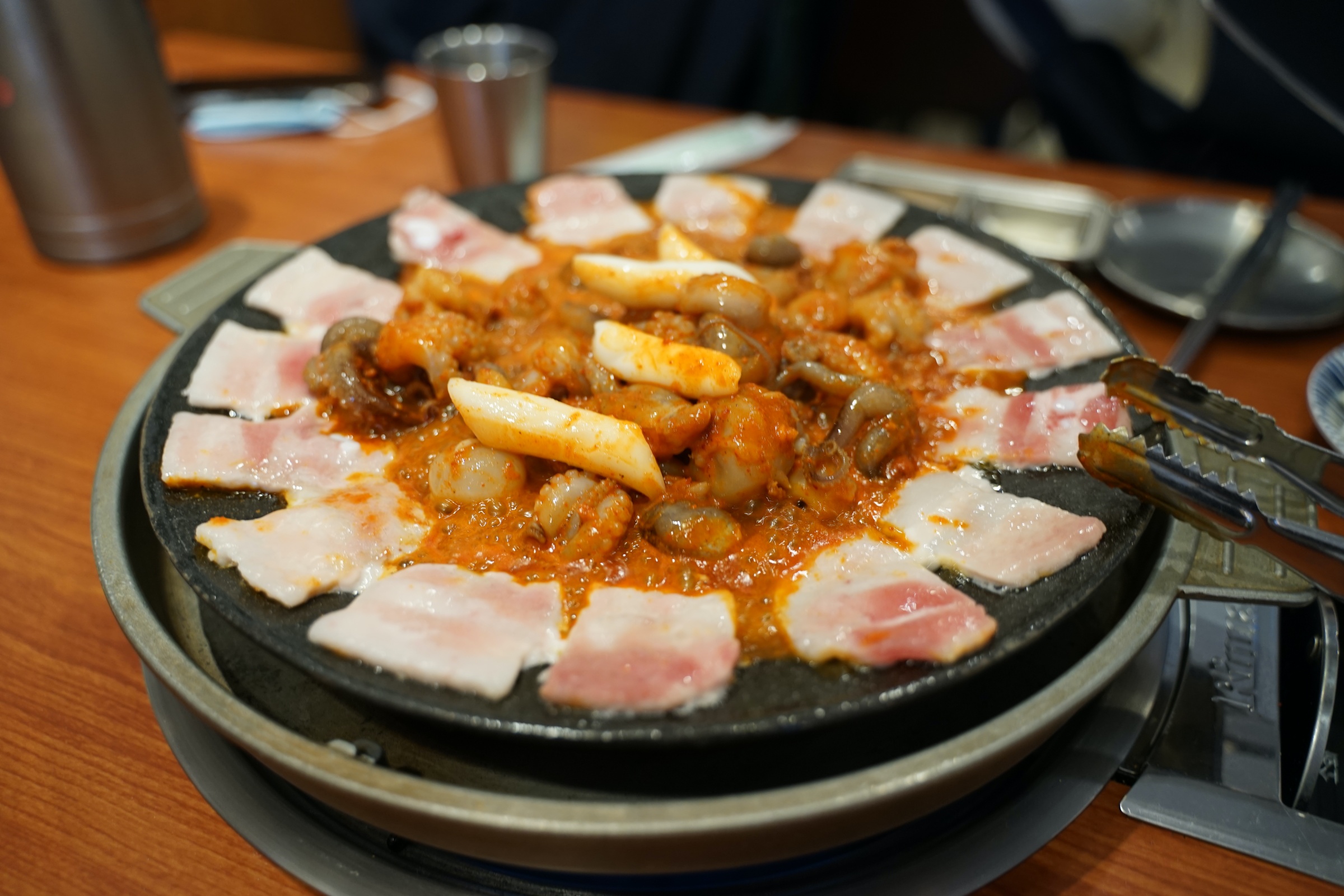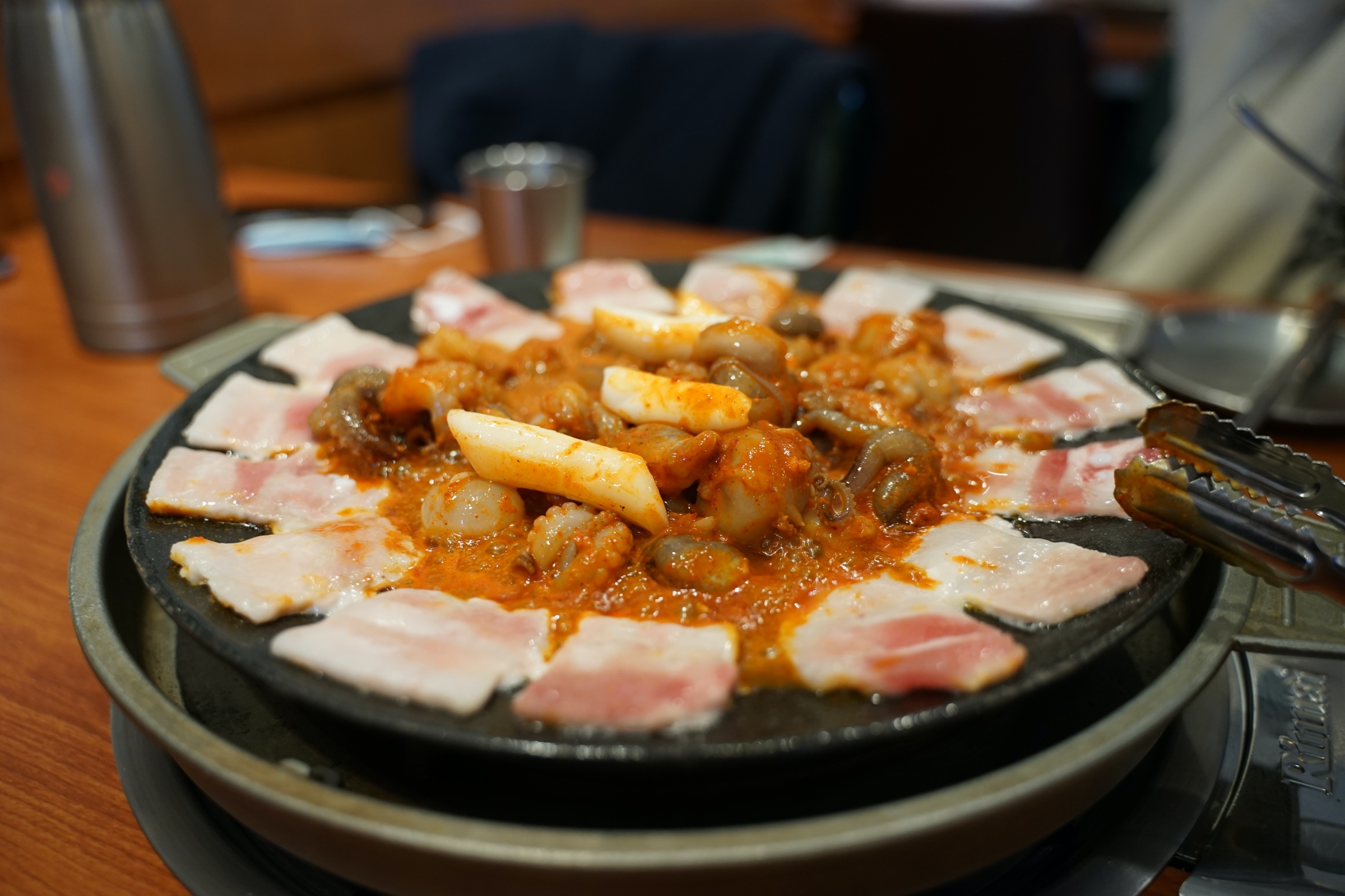 얇은 삼겹살이 모서리를 쭉 두르고 있고, 안에는 쭈꾸미가 있습니다.