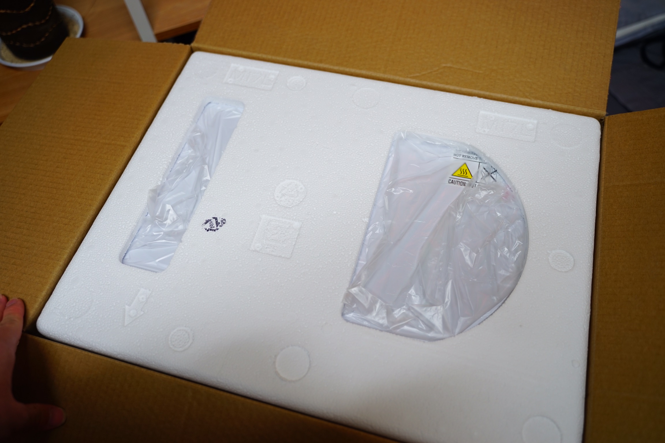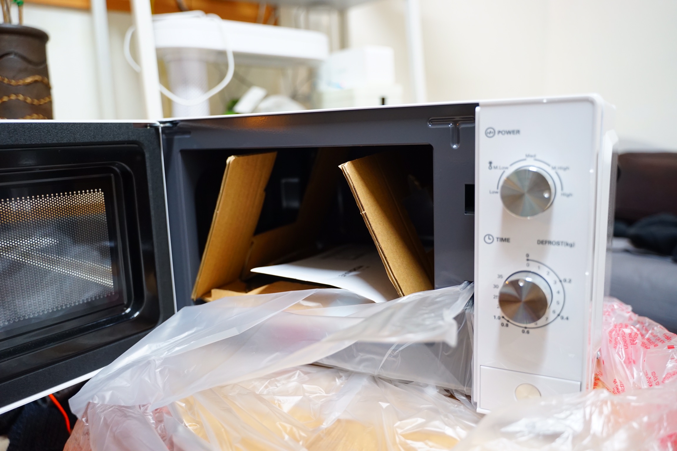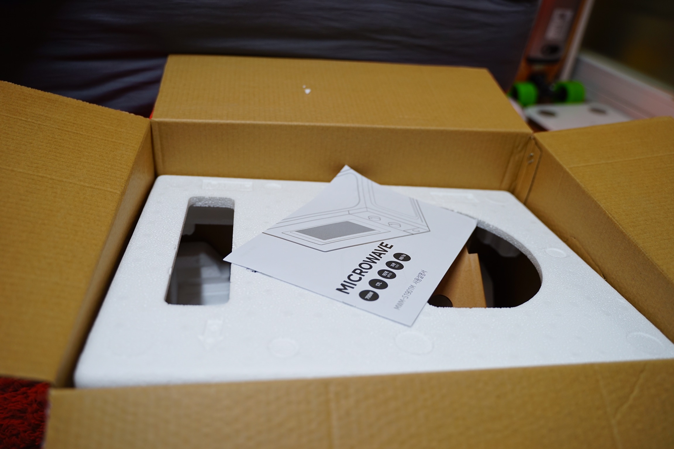 비닐과 스티로폼으로 파손되지 않게 잘 되어 있고, 그 전자렌지 안쪽에 돌아가는 동그란 유리판 있죠? 그게 깨지지 않도록 종이로 잘 고정되어 있습니다.