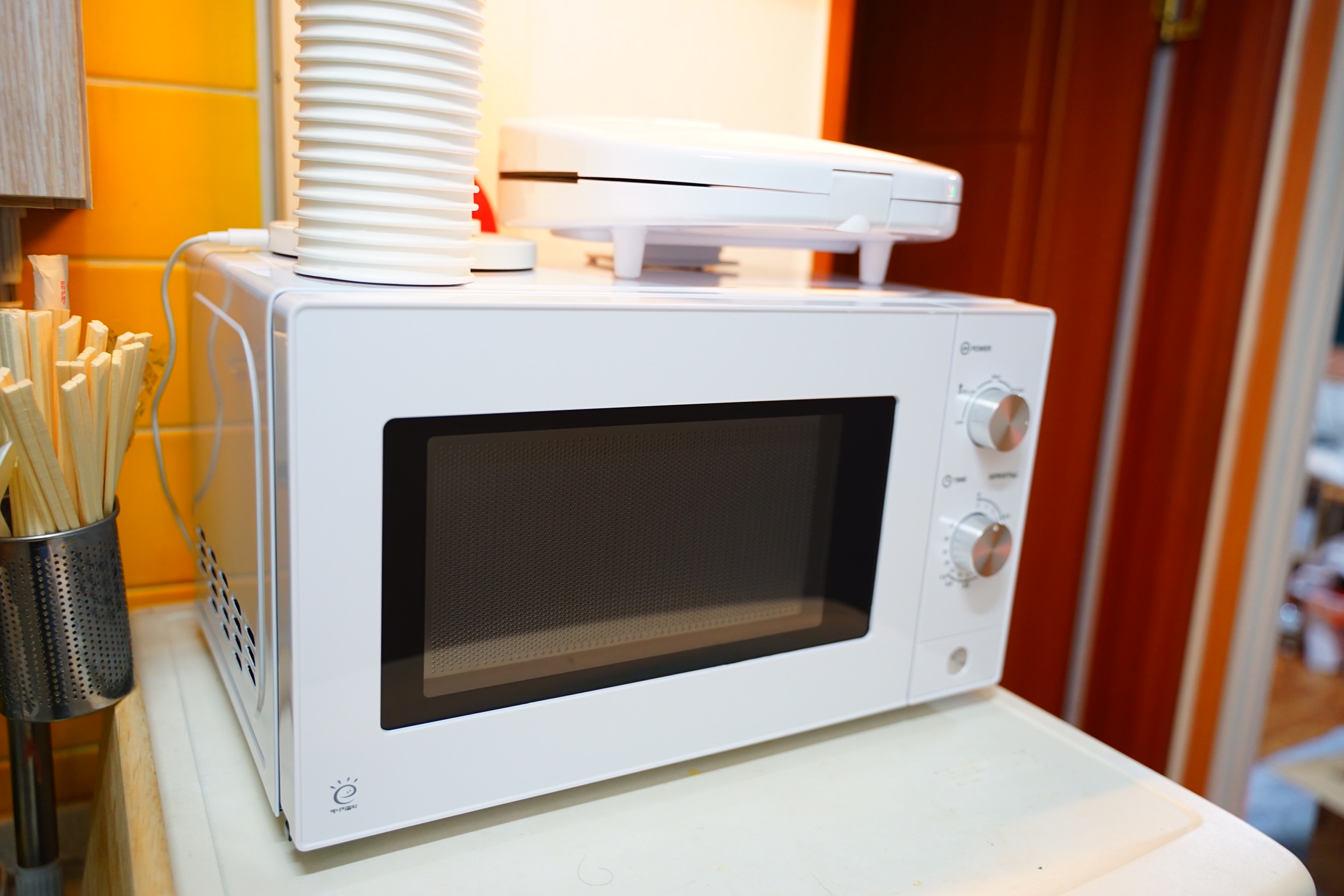 전자렌지 위에 올려져 있는 건 함께 구매한 노브랜드 샌드위치 메이커입니다.