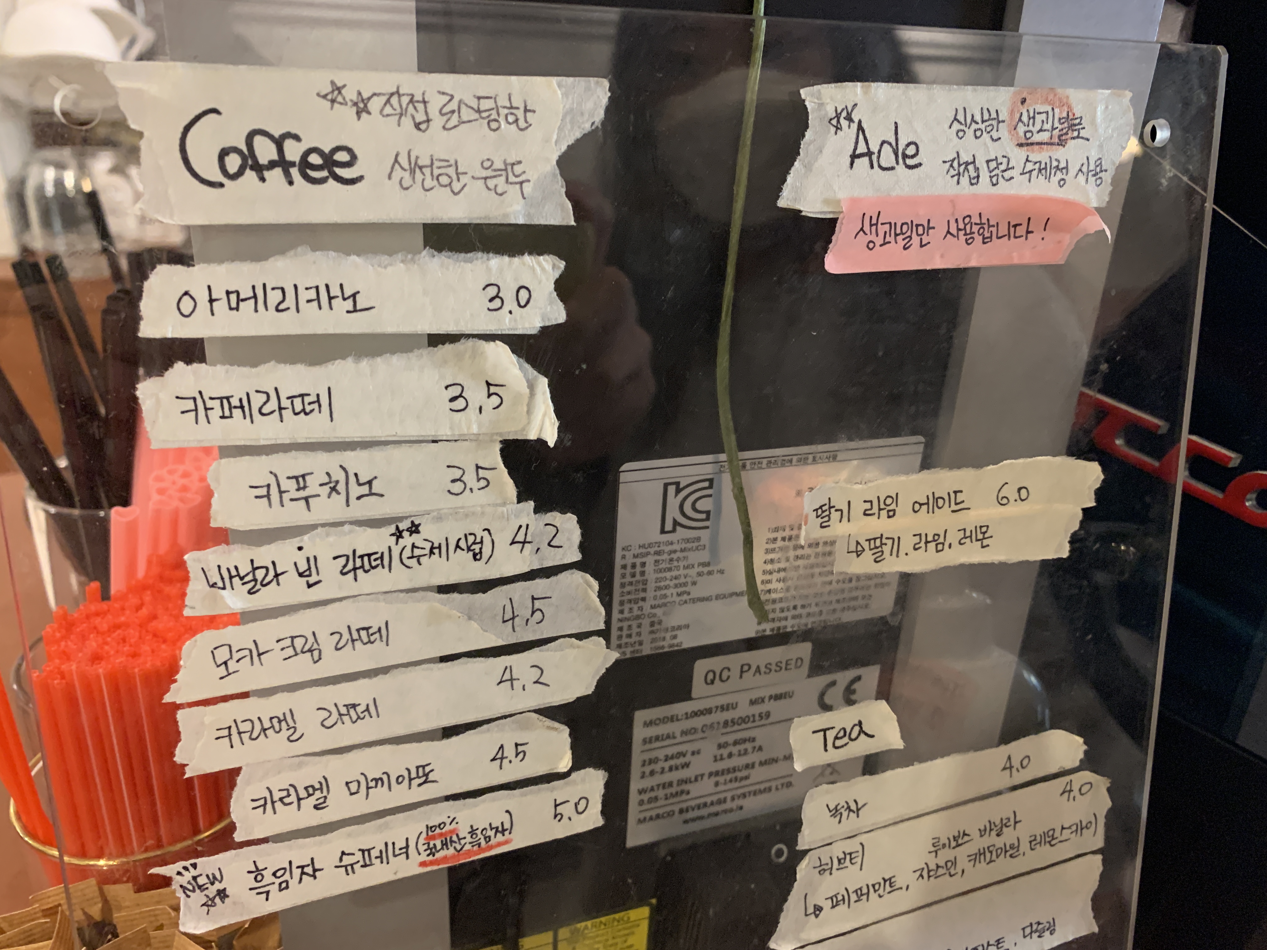 역시 신림동 카페라 그런지 그래도 가격대는 다른 카페에 비하면 저렴한 편입니다. 이 정도면 그냥 혼자 노트북 들고 와서 시간 때우다 가도 좋을 것 같아요 ㅎㅎ