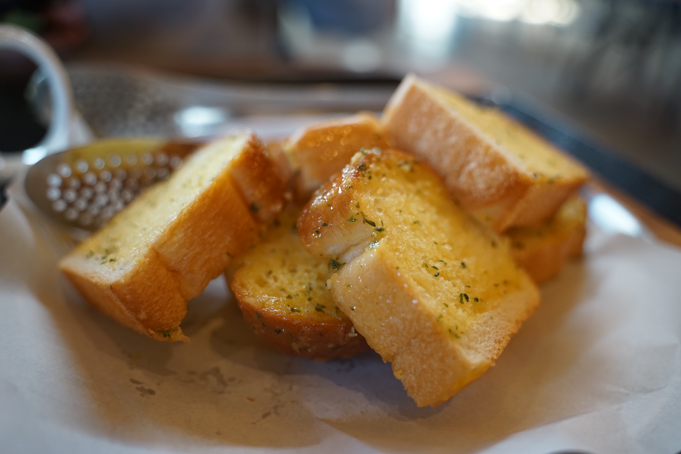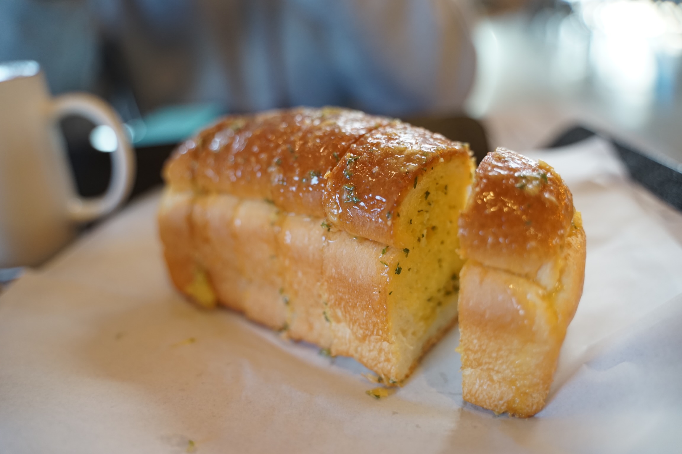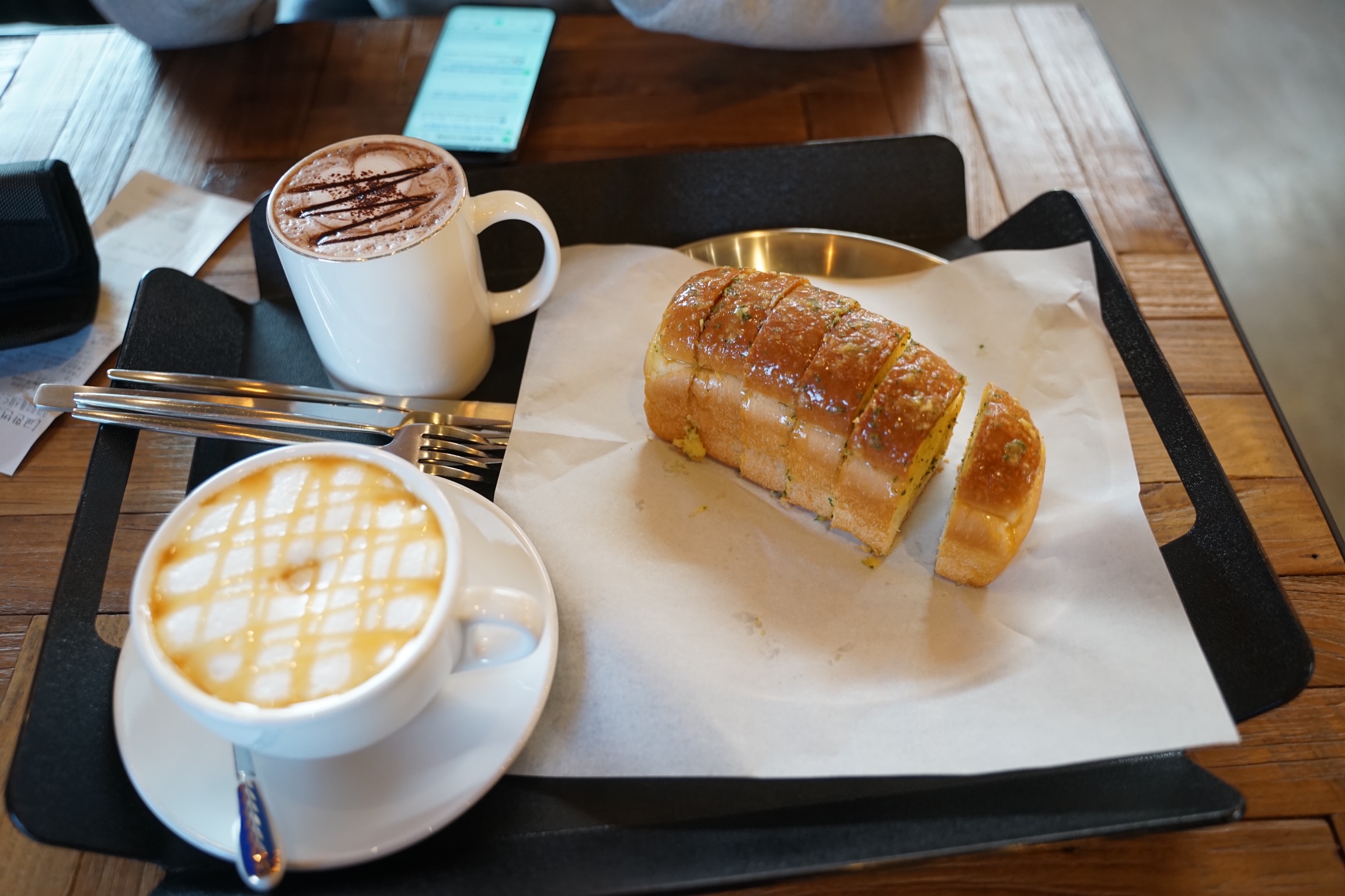 짜잔!! 저희가 주문한 마늘 바게트빵과 핫초코, 그리고 카라멜 마키아또입니다.