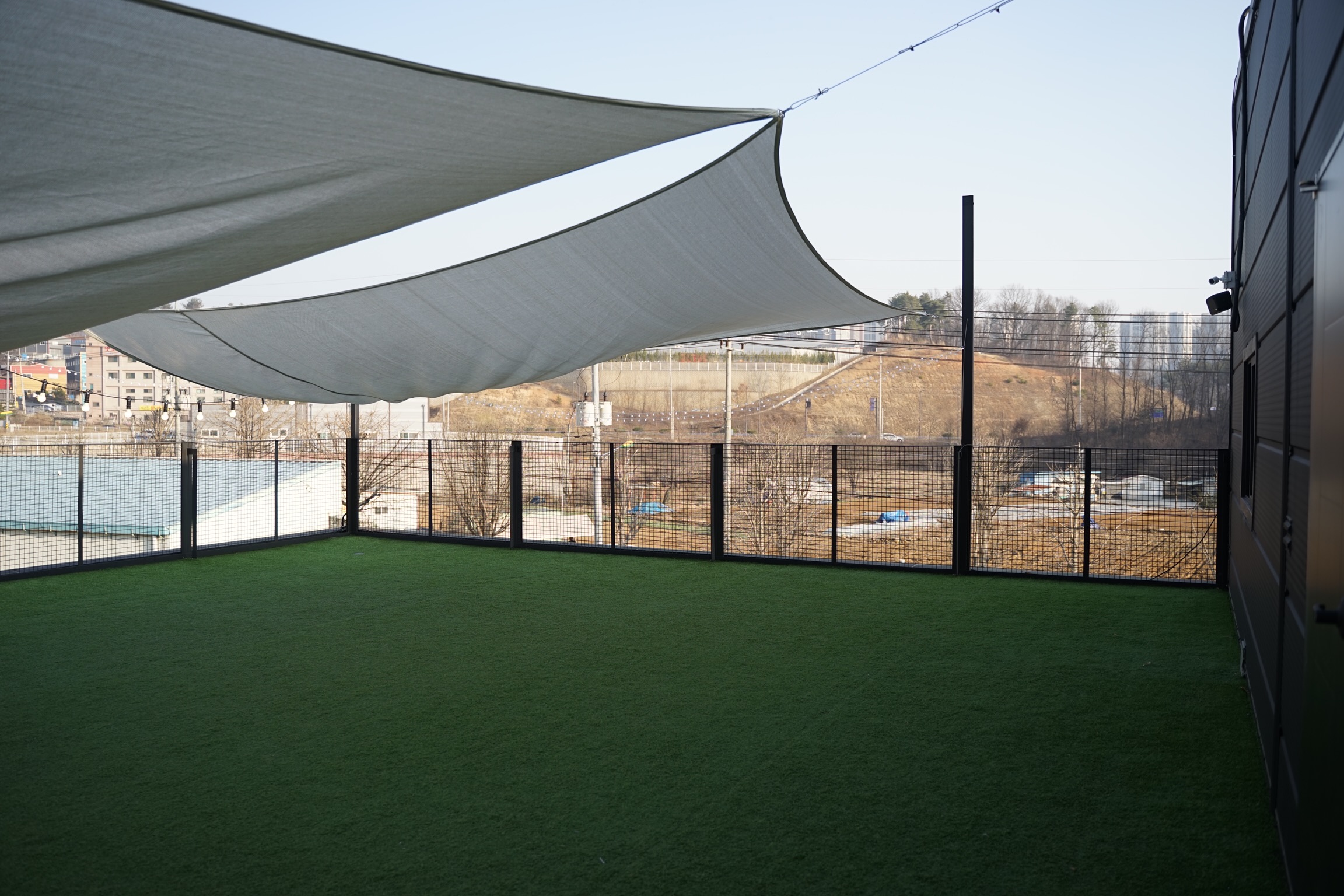 맨 옥상에 올라가면 저렇게 인조잔디가 깔린 마당도 있어요. 아직은 날이 조금 추운데, 날이 좀 풀렸을 때는 저기에 돗자리 깔고 앉아 있어도 좋을 것 같아요!