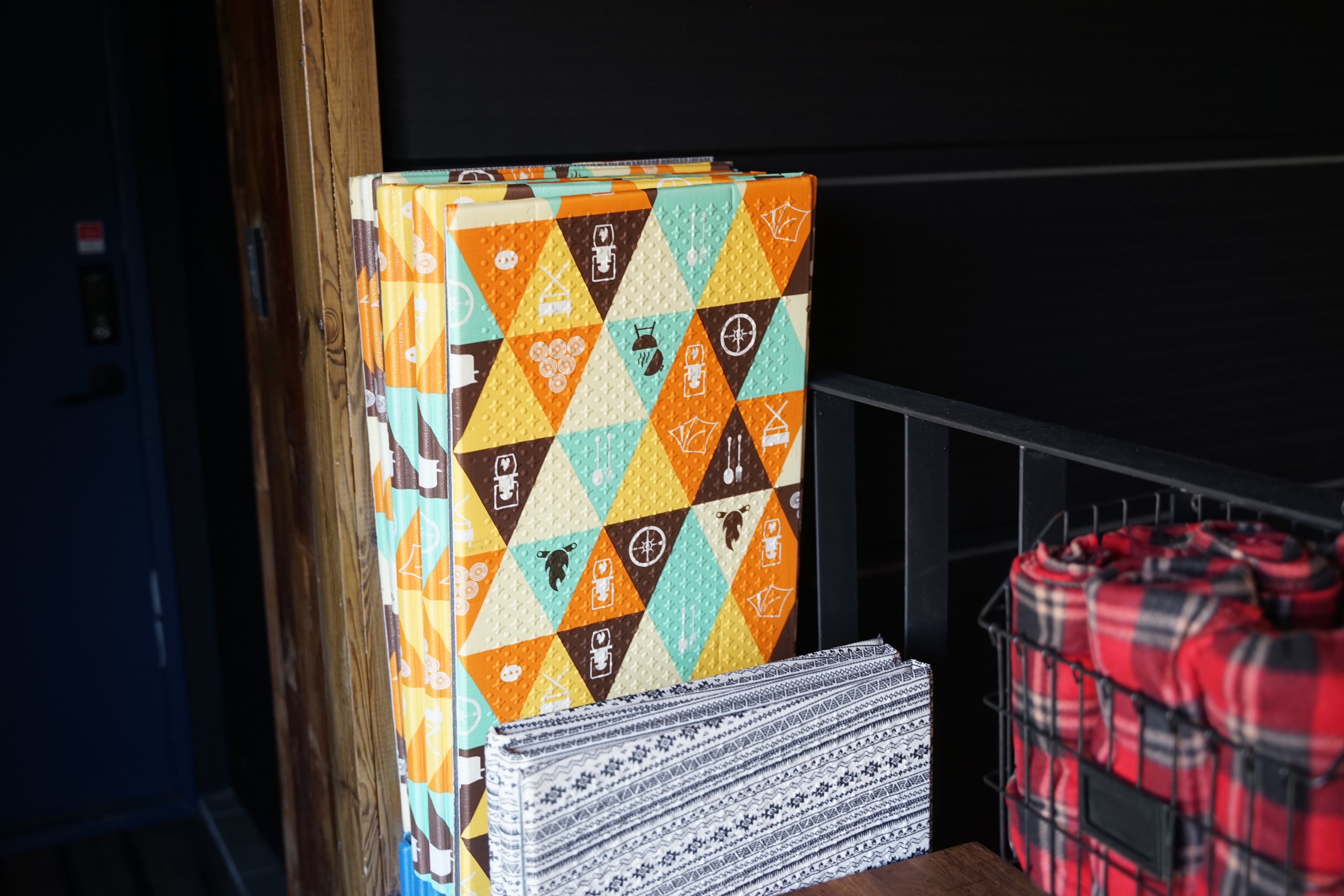 저기 루프탑 잔디에 깔 수 있는 돗자리가 마련되어 있어서 저 돗자리를 가지고 나가서 깔고 앉으시면 돼요!