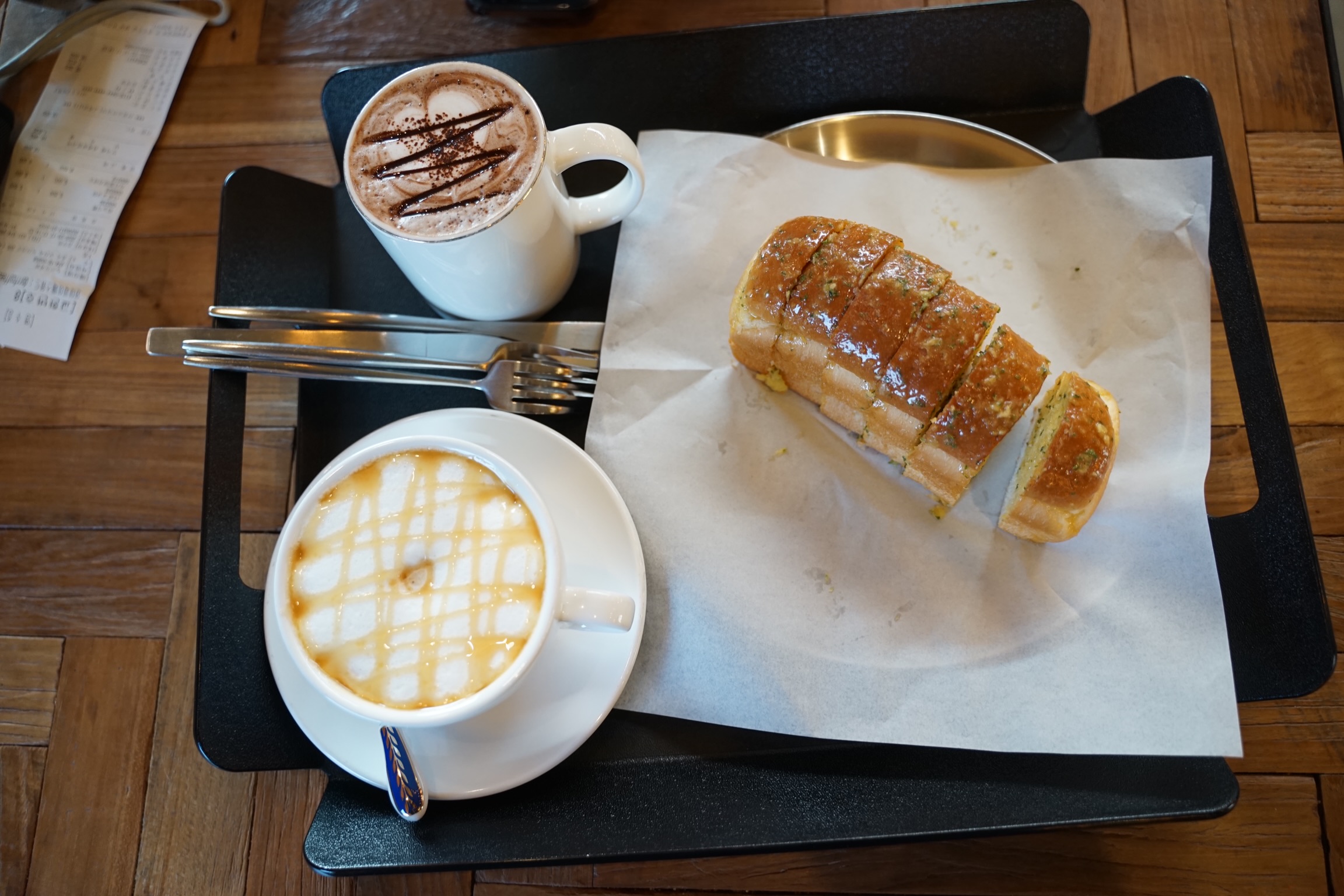 짜잔!! 저희가 주문한 마늘 바게트빵과 핫초코, 그리고 카라멜 마키아또입니다.