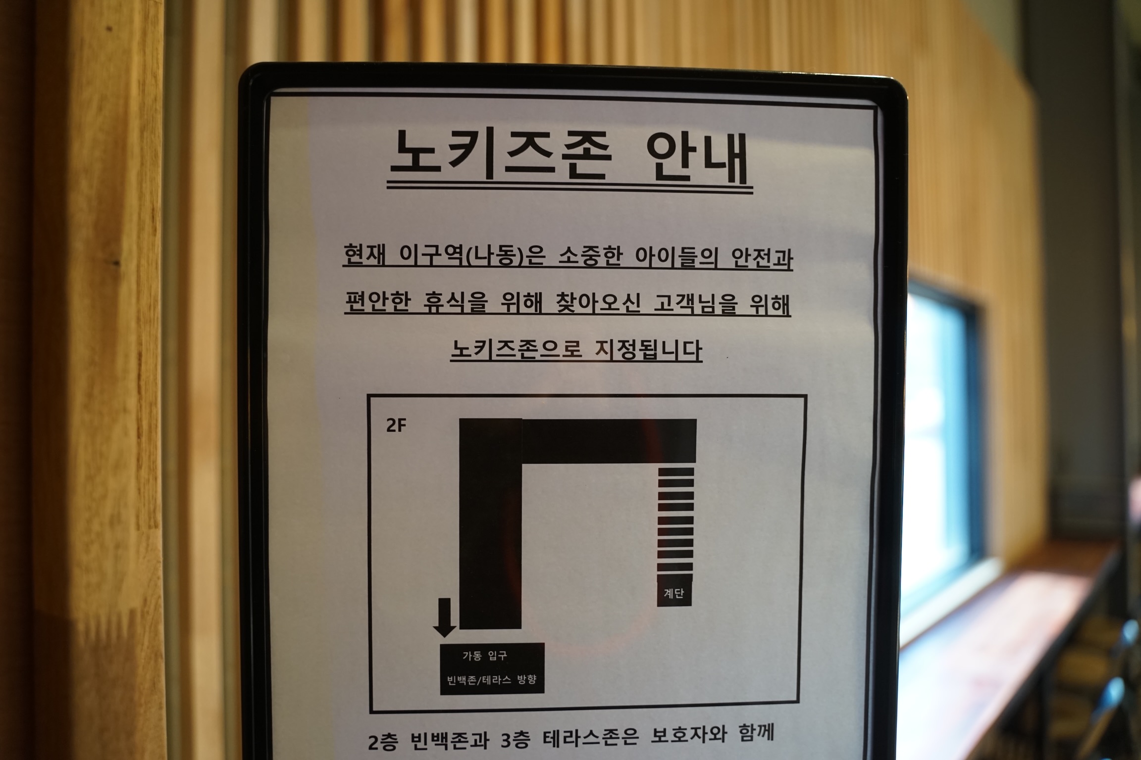 그리고 카페의 일부 구역은 노키즈존으로 운영되고 있습니다. 노키즈존을 운영하는 게 아동에 대한 차별이다, 아니다 사회적인 논의가 조금 있기는 하지만 ... 뭐 어쨌든 저도 아직은 애가 없는 평범한 소비자로서 애들이 너무 시끄럽게 떠들고 노는 건 별로 좋아하지 않아서 노키즈존을 선호하기는 합니다.