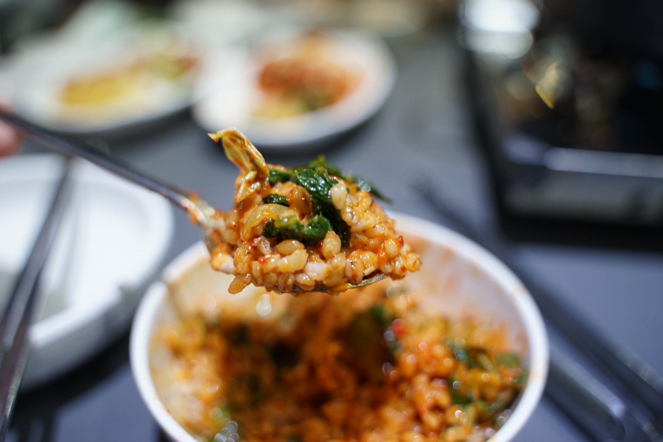 그리고 보리밥에는 이런 식으로 특제소스와 참기름을 섞어서 비벼 드시면 됩니다.