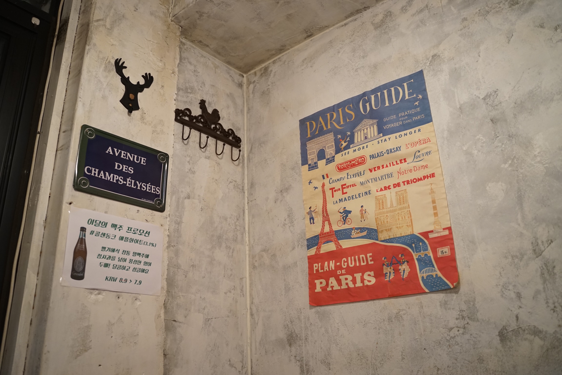 벽은 이런 식으로 프랑스 느낌 나는 포스터로 장식이 되어 있습니다.