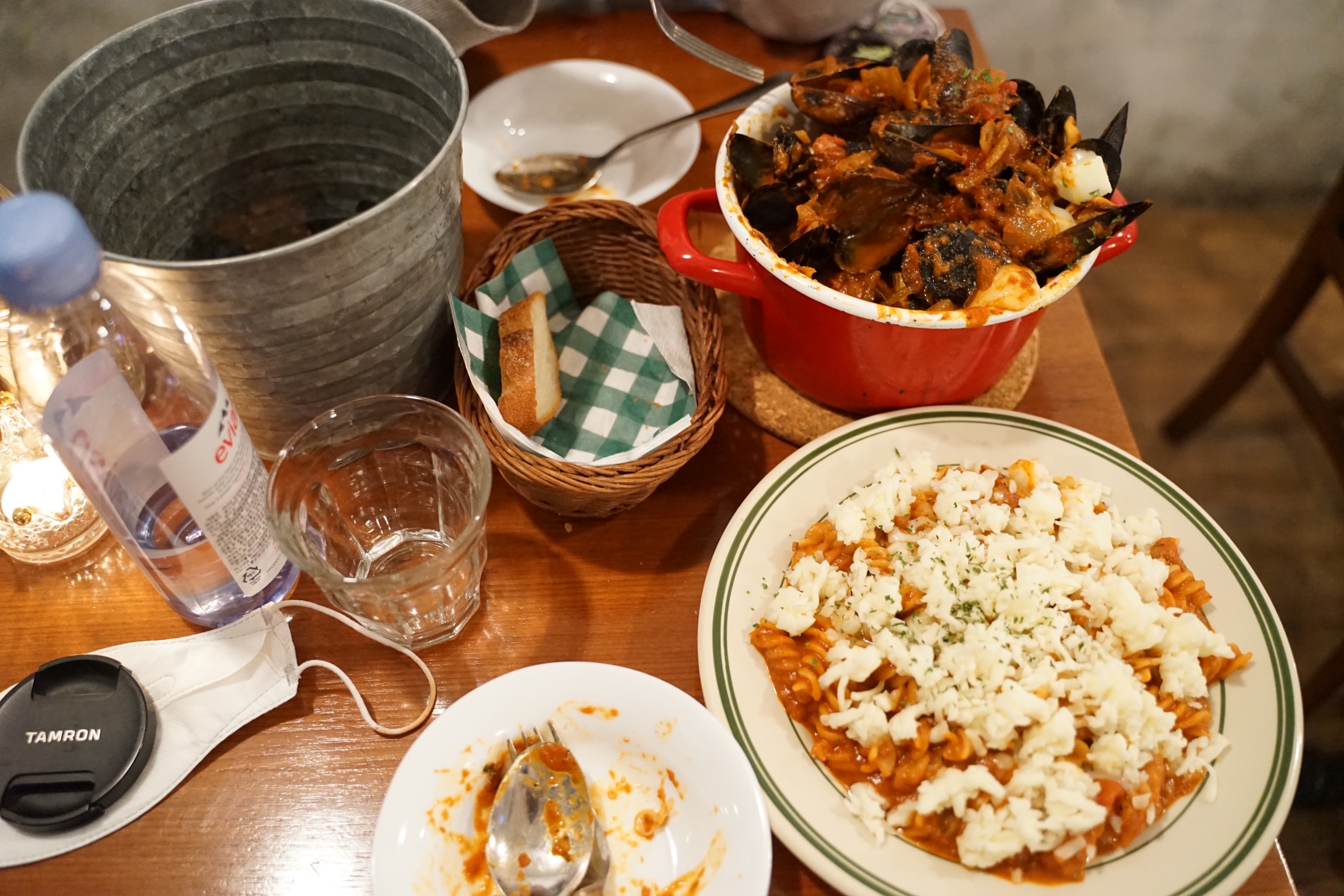 저희는 홍합 + 토마토소스로 해서 2인분을 시켰습니다. 1인분에 13,000원 정도니 저렴하진 않지만 그래도 나쁘진 않습니다. 저희는 따로 맥주나 와인 같은 건 시키지 않았는데 와인 하나 시켜서 같이 먹으면 완전 좋을 듯.