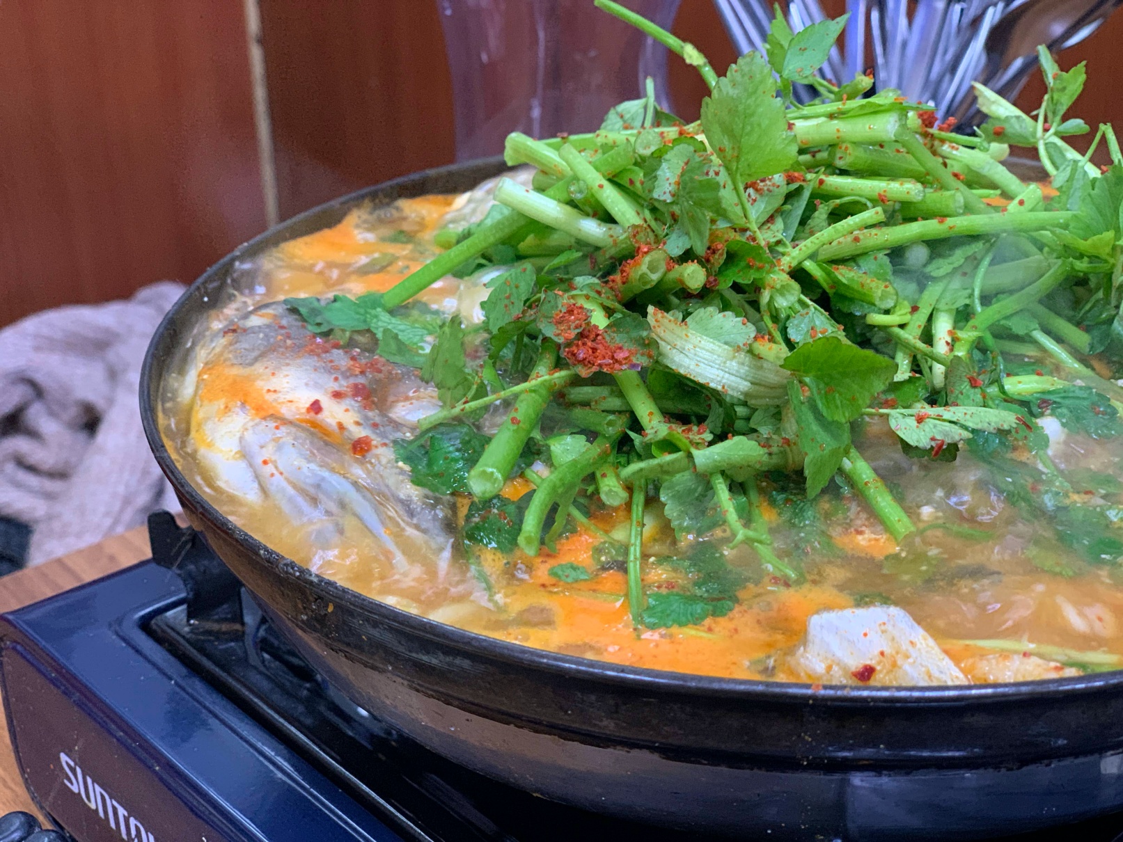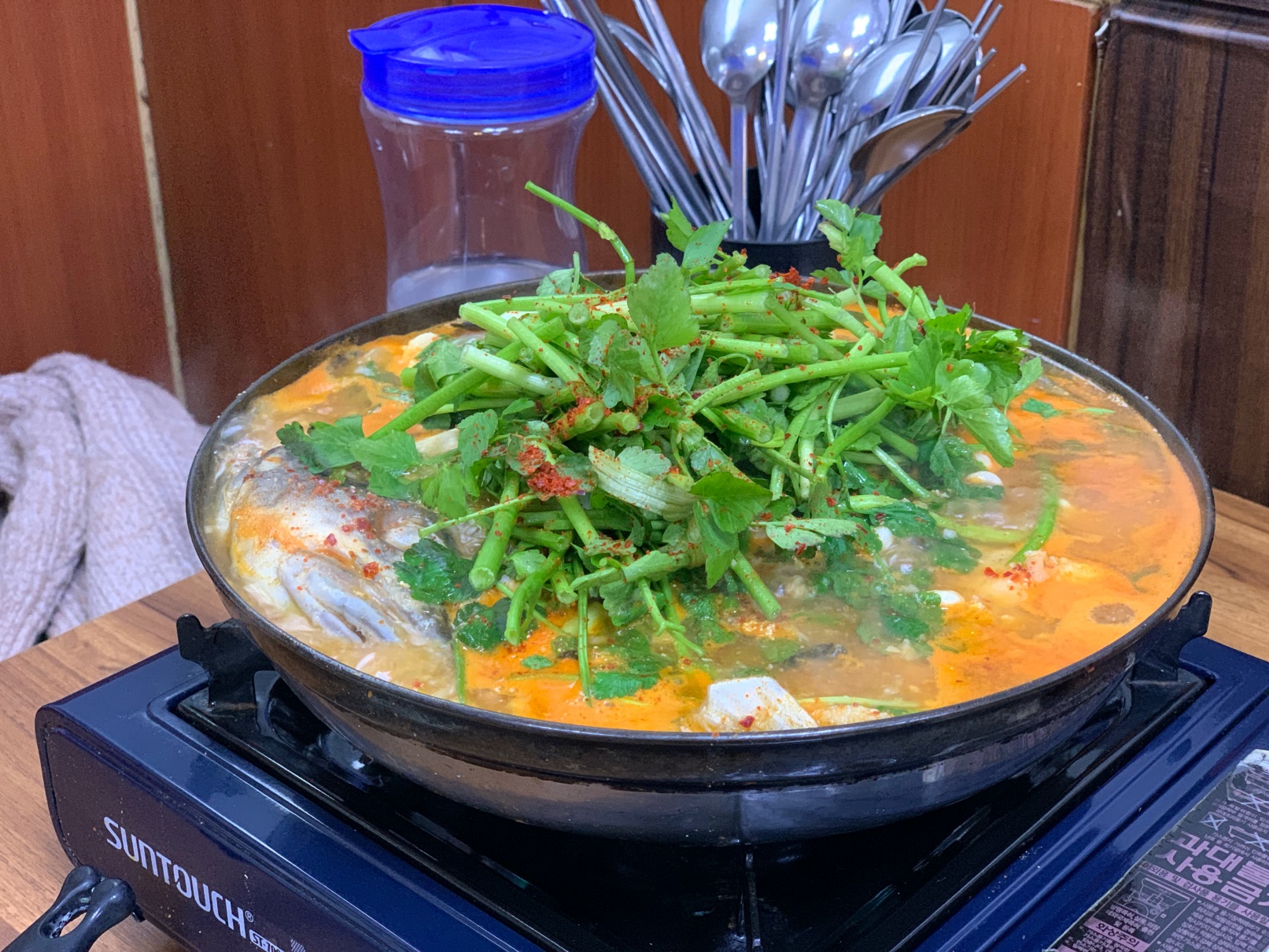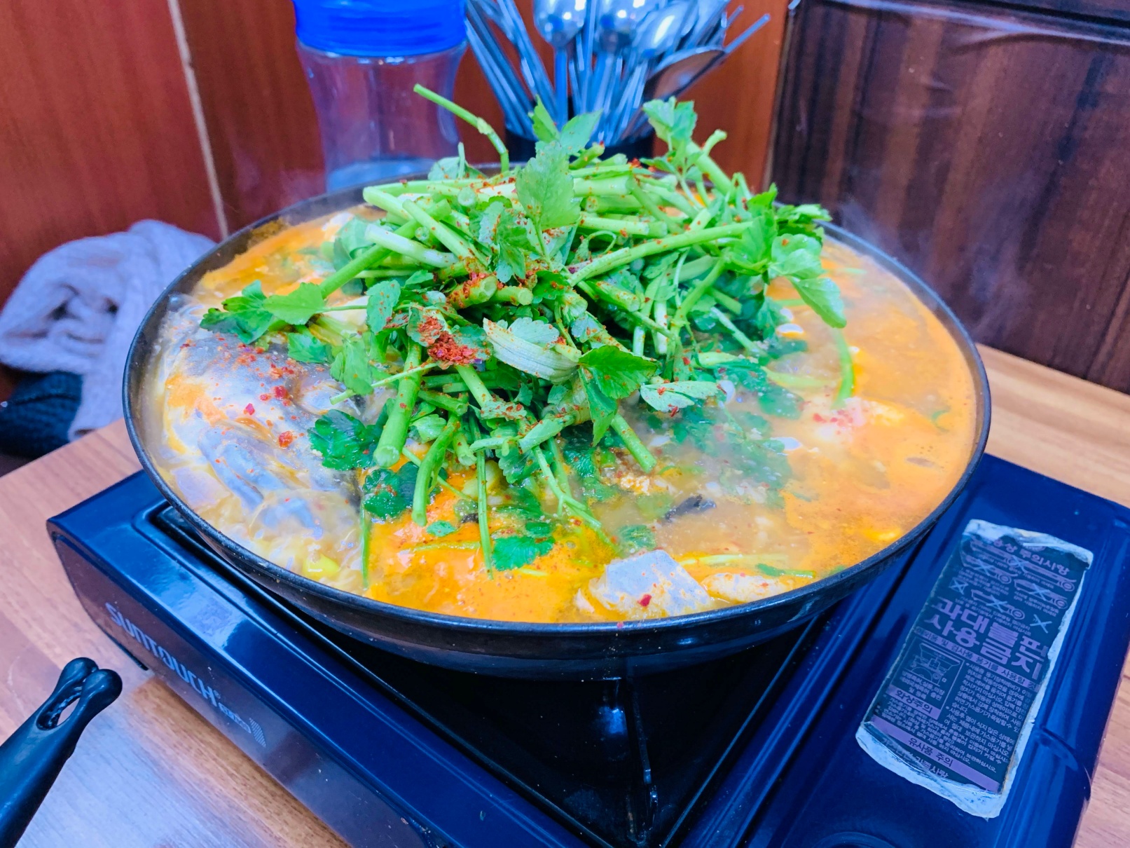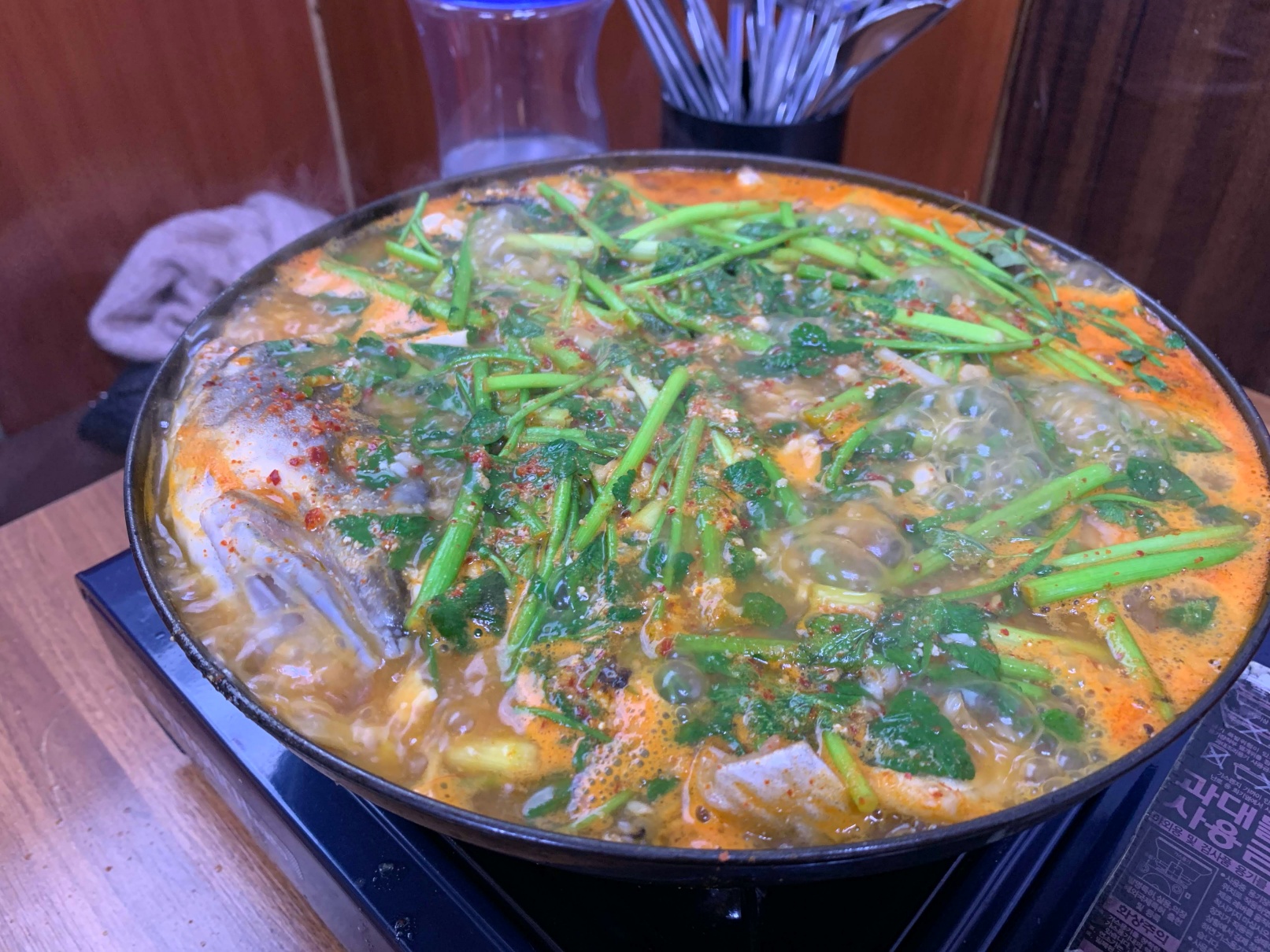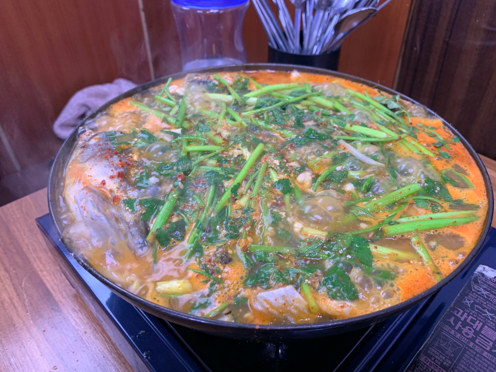 짠! 이런 식으로 펄펄 끓는 커다란 냄비에 나옵니다. 두명이서 진짜 배부르게 먹고도 남길 정도의 양입니다.
