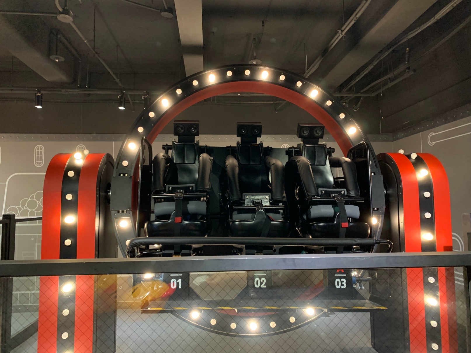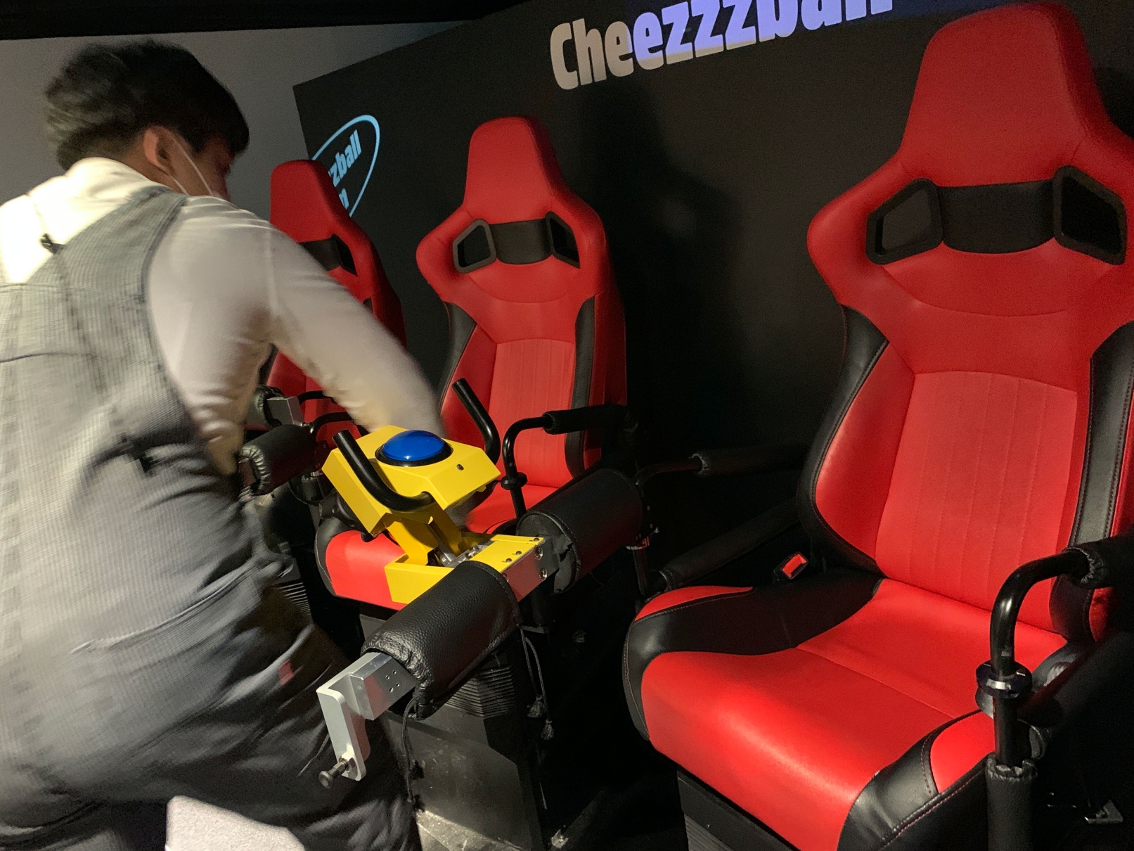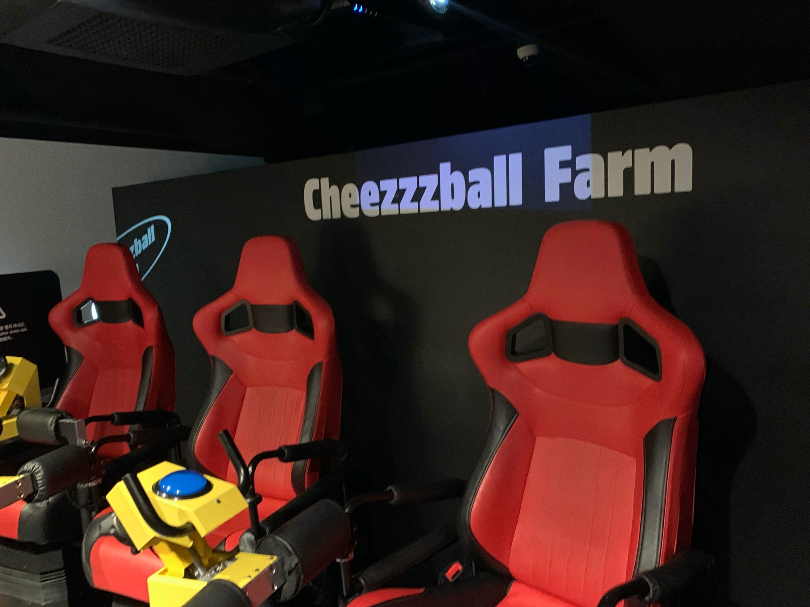 일단 첫번째 놀이기구를 타러 들어왔습니다. 이건 저 파란색 버튼을 누르면서 치즈볼을 쏴서 맞추는 그런 게임인데, 브이알을 쓰지 않고 하는 게임인데도 상당히 스릴 있고 재밌었습니다.