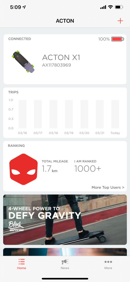 ACTON 이라는 앱을 설치하시면 현재까지의 주행거리를 볼 수 있고, 모드 설정도 가능합니다. 비기너 모드는 최고 속도가 제한되고 프로 모드로 하면 최고 속도가 상당히 빨라집니다. 제가 알기로 35키로까지 나온다고 하던데 ... 그렇게 타면 이건 너무 위험하지 않을까 싶습니다 ㅋㅋ