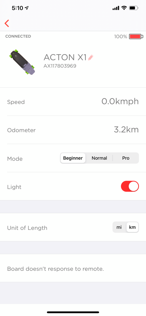 ACTON 이라는 앱을 설치하시면 현재까지의 주행거리를 볼 수 있고, 모드 설정도 가능합니다. 비기너 모드는 최고 속도가 제한되고 프로 모드로 하면 최고 속도가 상당히 빨라집니다. 제가 알기로 35키로까지 나온다고 하던데 ... 그렇게 타면 이건 너무 위험하지 않을까 싶습니다 ㅋㅋ