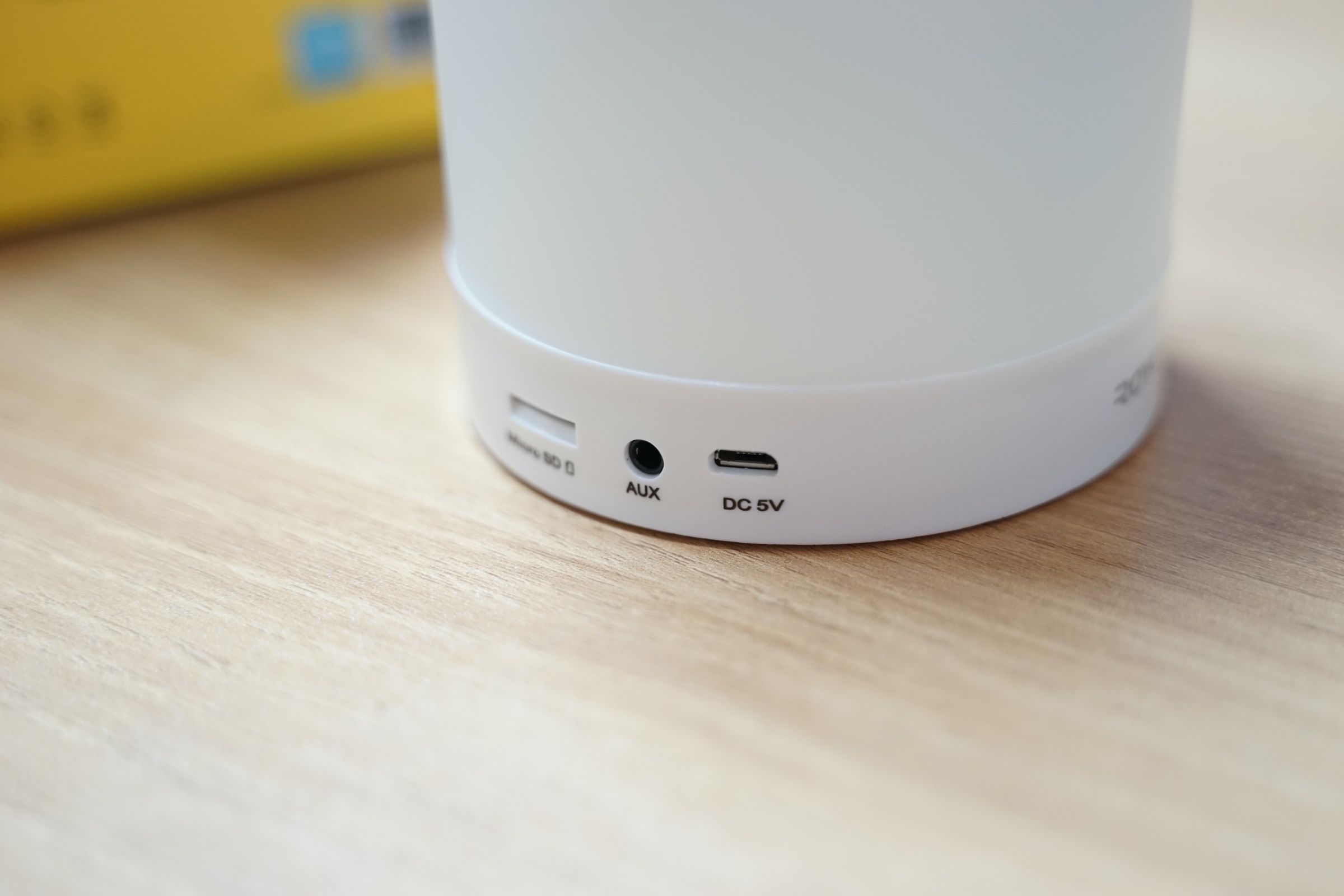 뒤에는 AUX 케이블이 있고, 마이크로 5핀 충전 케이블이 있습니다. 마이크로 SD 카드도 들어가는데 메모리에 저장되어 있는 음악을 재생할 수 있는 것 같습니다.