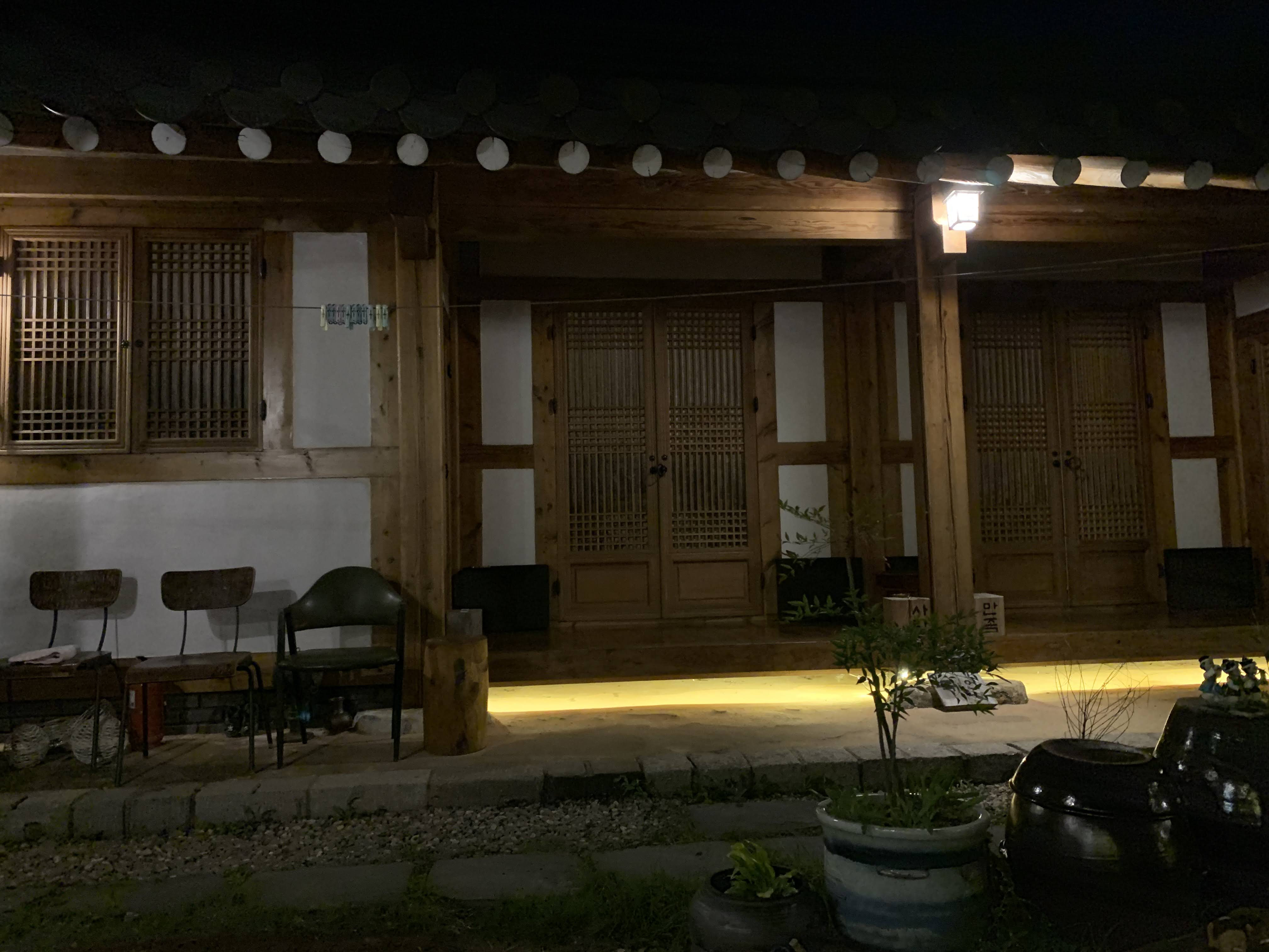 위치는 바로 황리단길 근처에 있고, 이런 식으로 한옥 건물이 있고 그 사이에 있는 마당에 있는 테이블에서 맥주를 마시는 곳입니다.