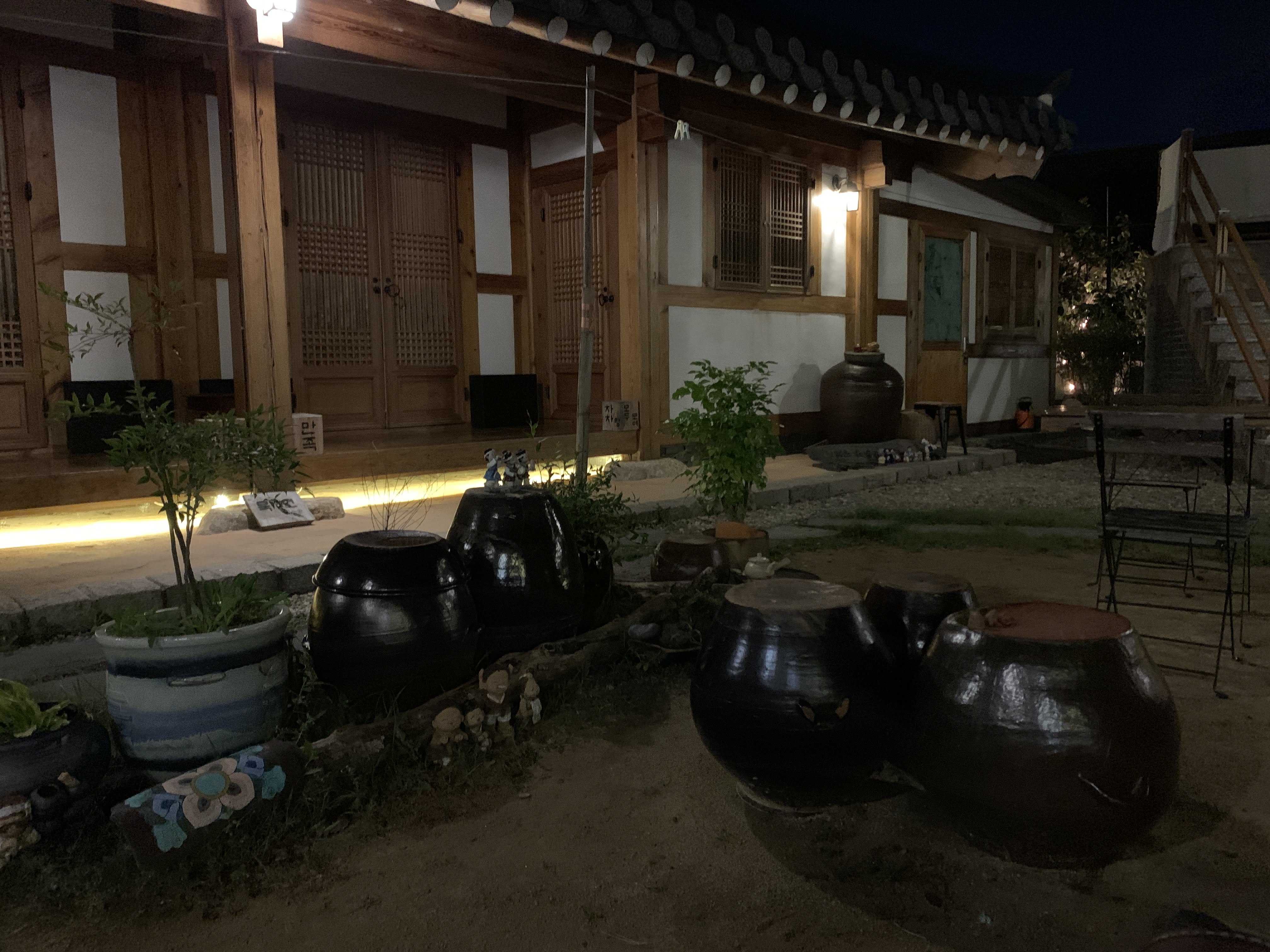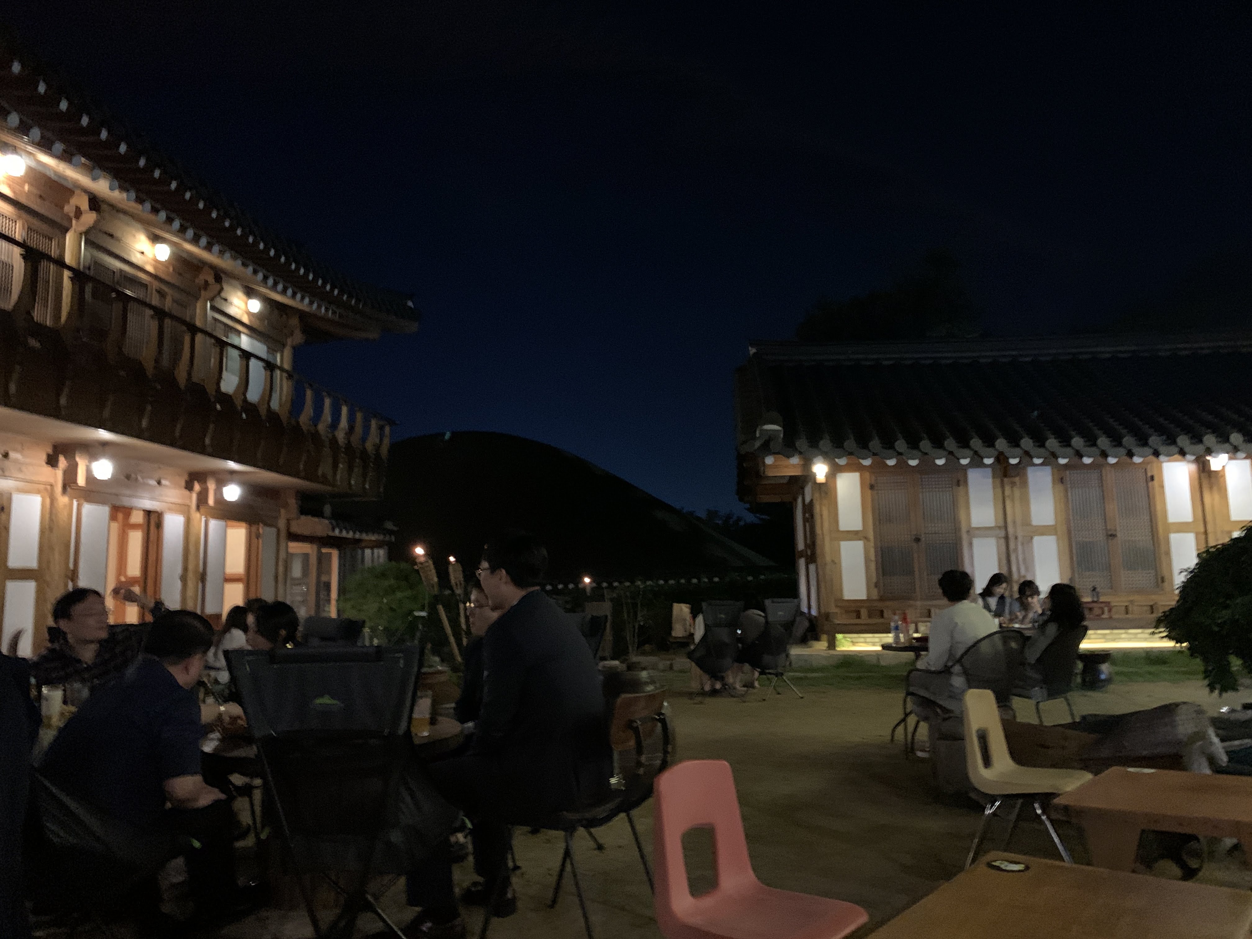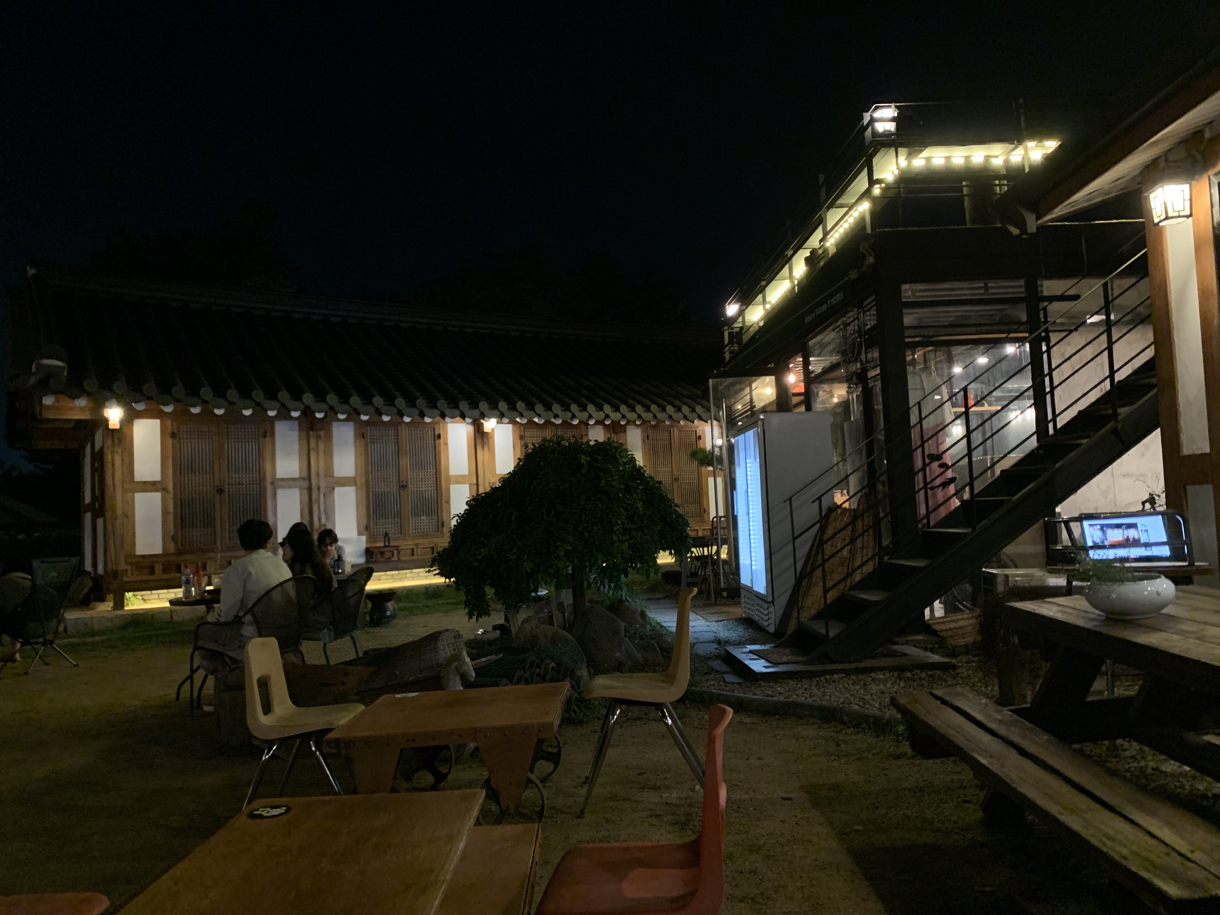 위치는 바로 황리단길 근처에 있고, 이런 식으로 한옥 건물이 있고 그 사이에 있는 마당에 있는 테이블에서 맥주를 마시는 곳입니다.