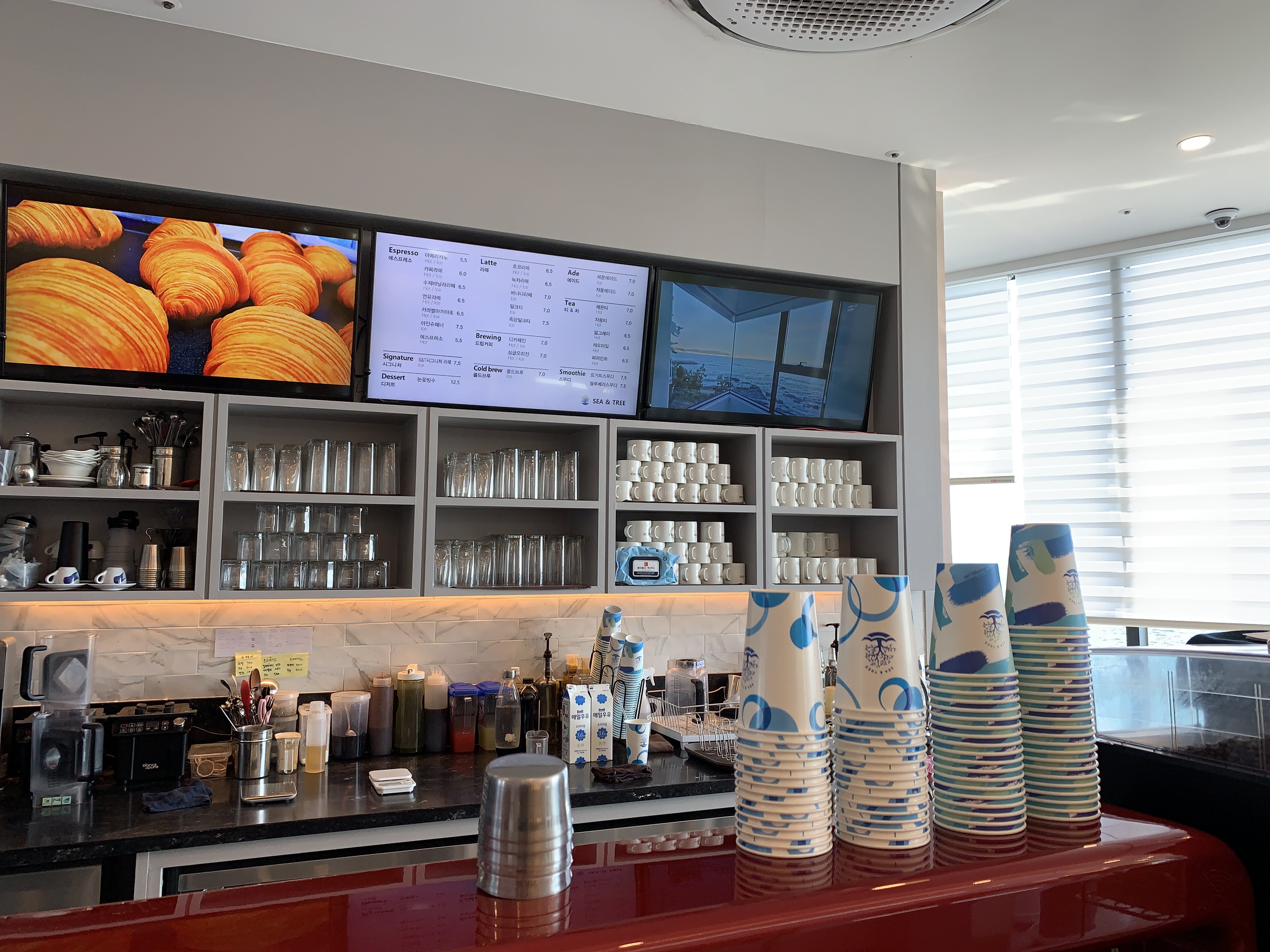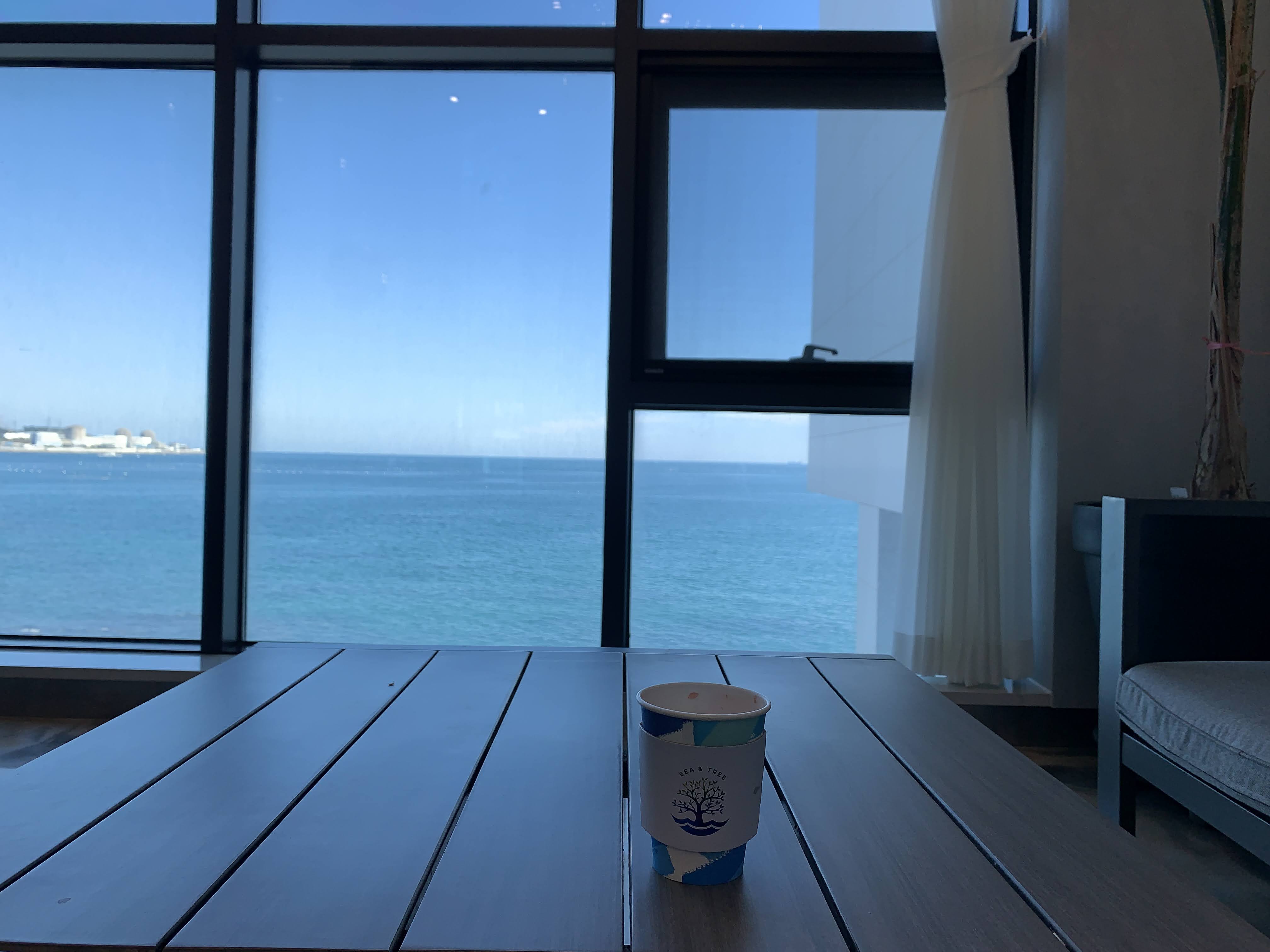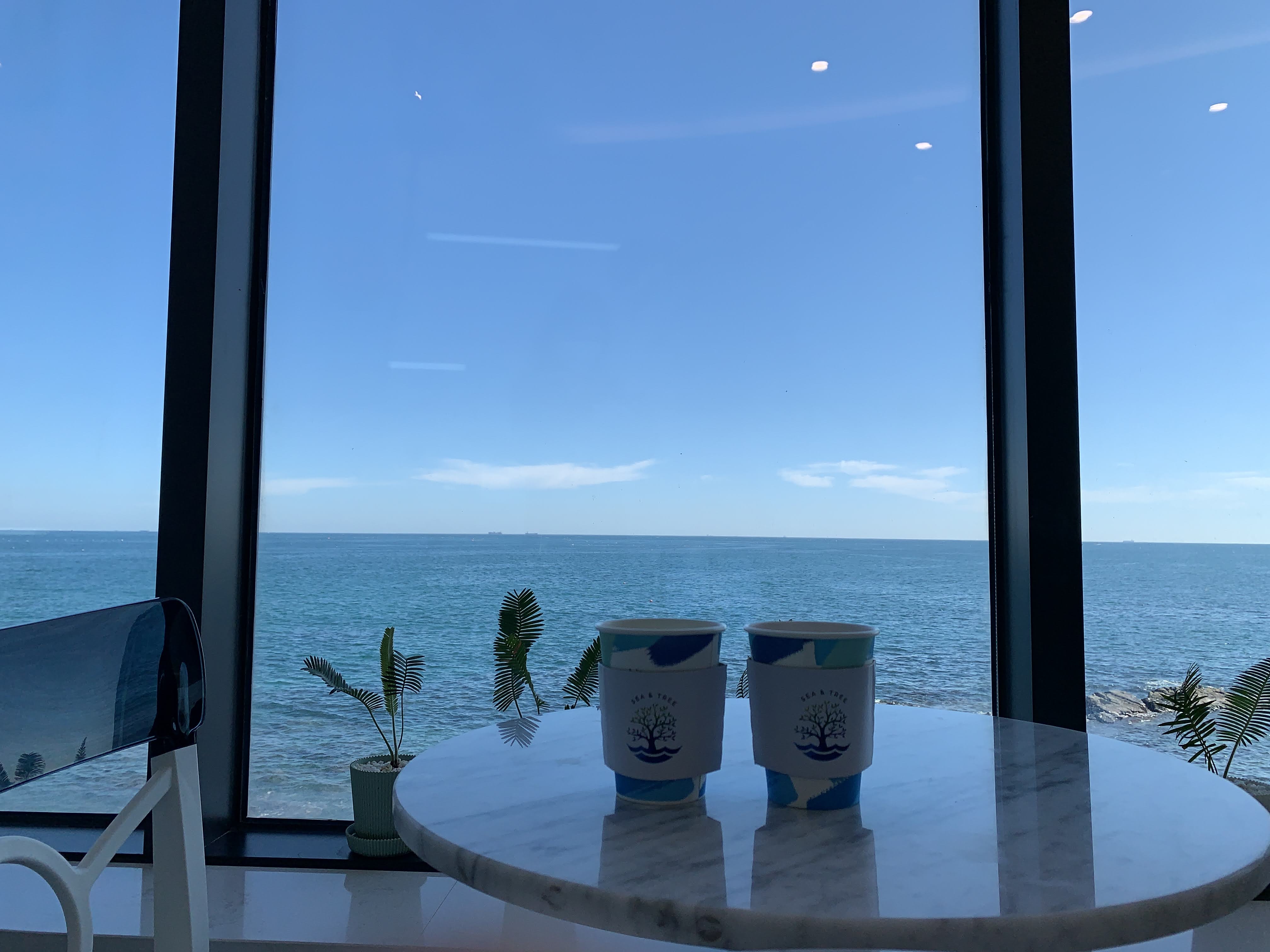 앞에는 바다가 보이고 안에는 나무가 있어서 굉장히 청량한 느낌이 듭니다
