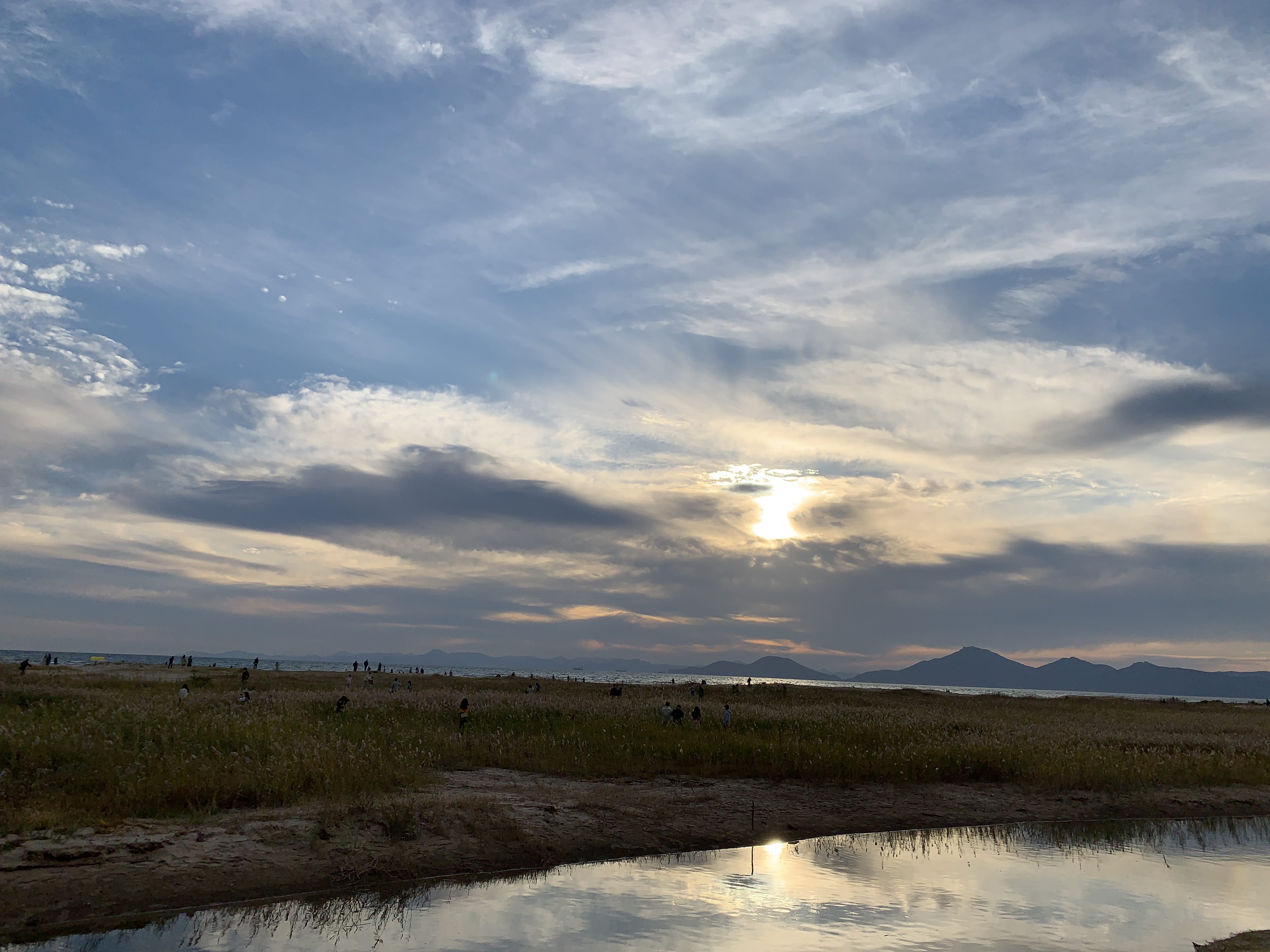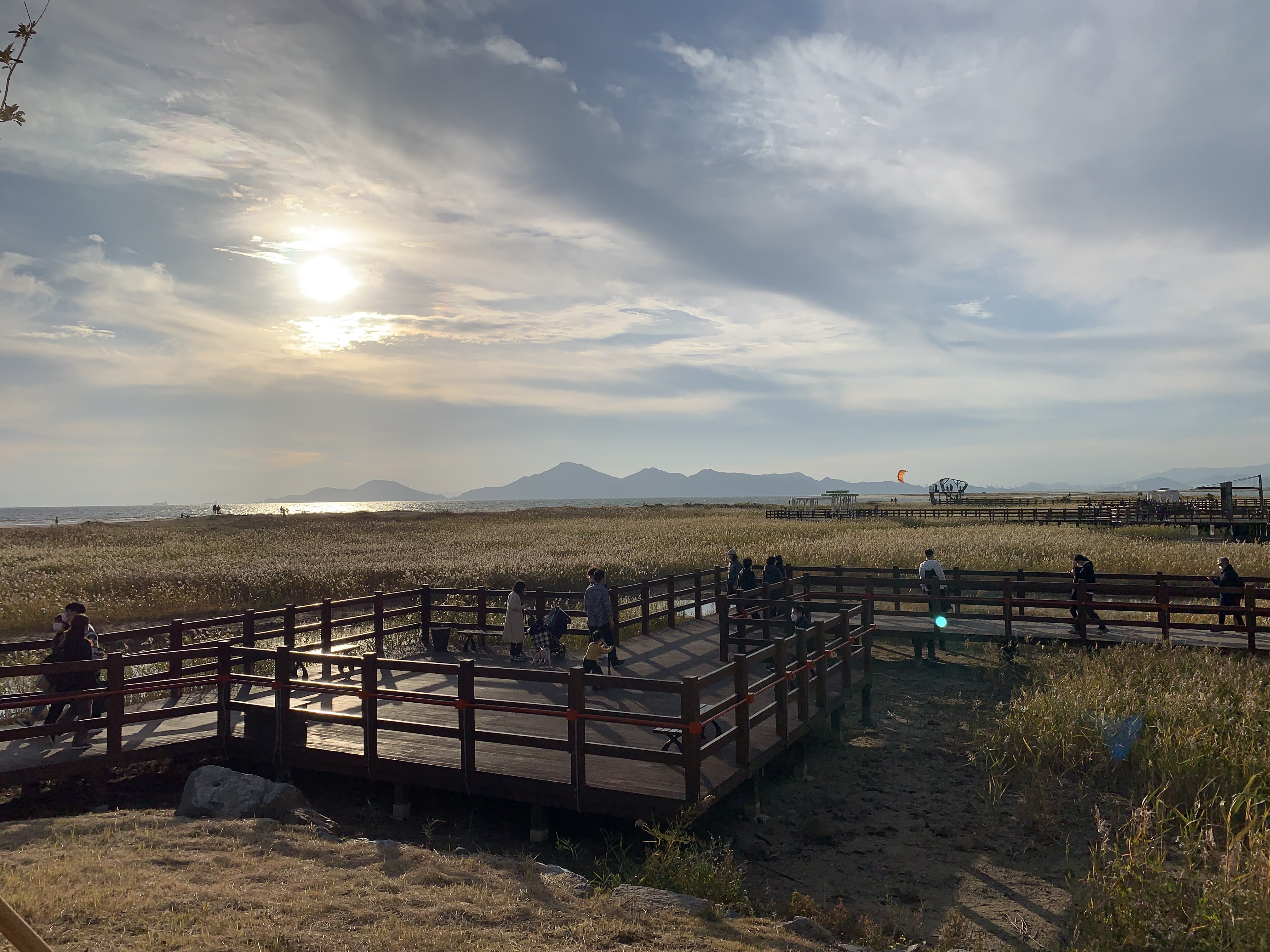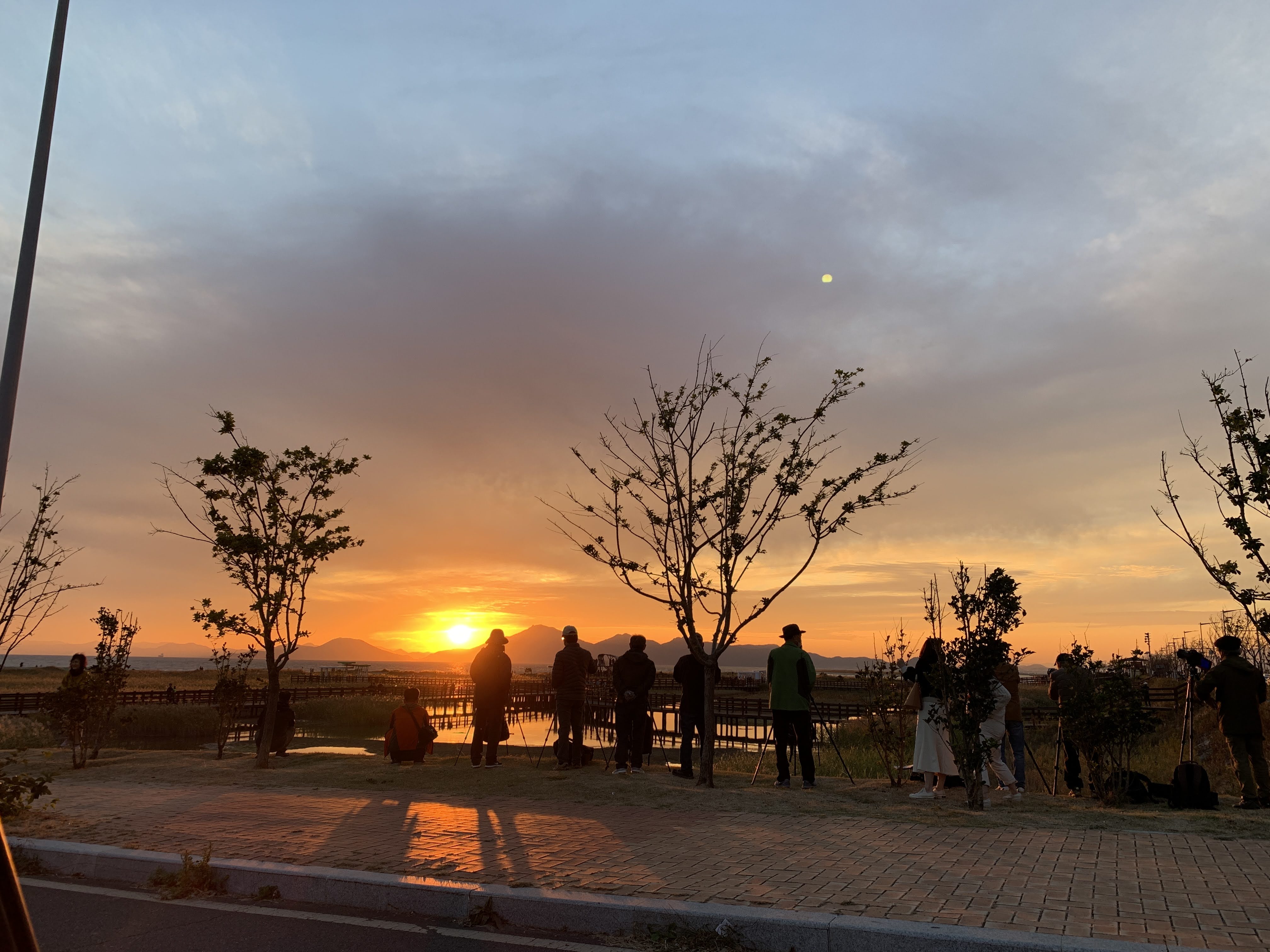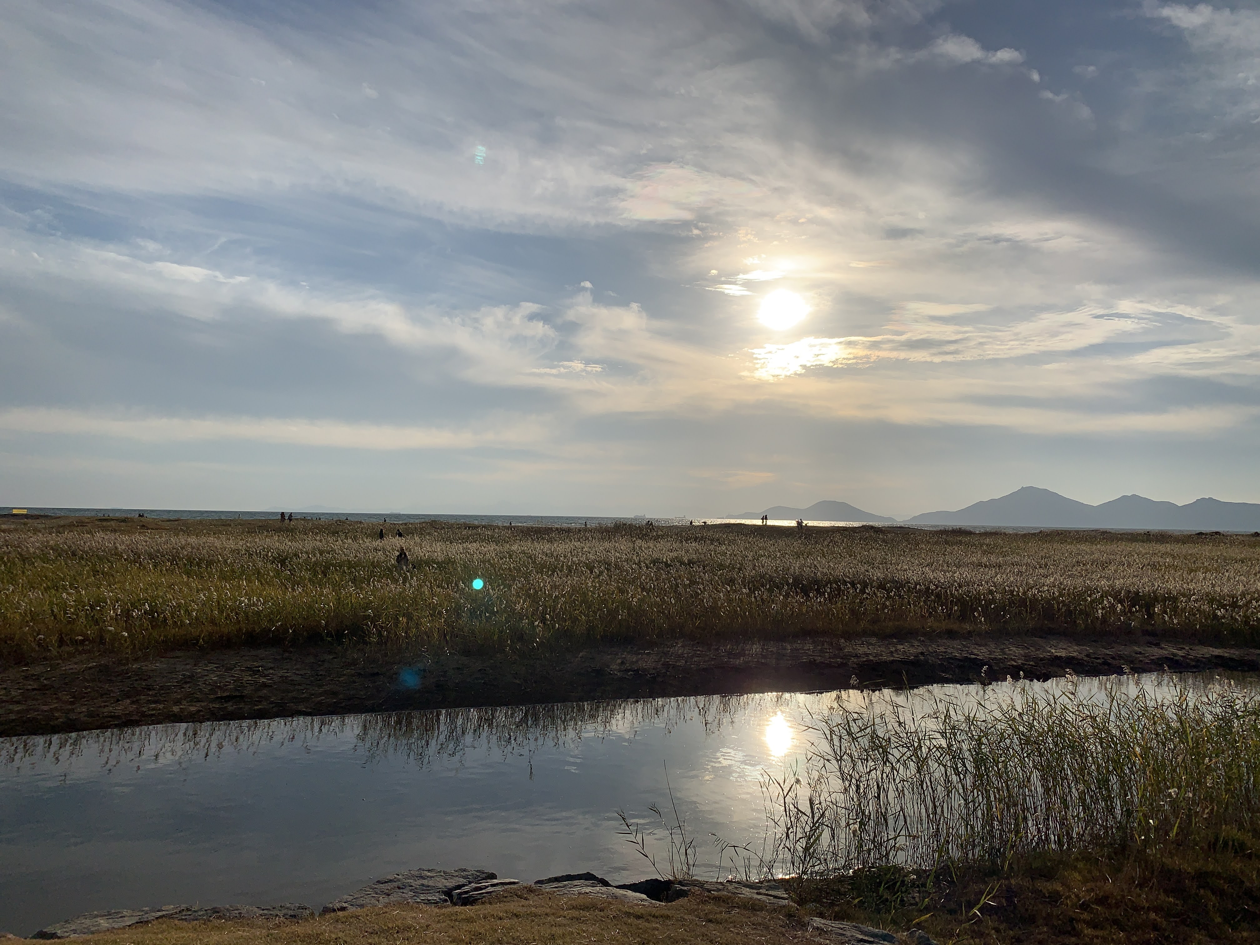 저는 해수욕장이라고 하니까 당연히 모래사장 펼쳐져 있는 그런 일반적인 해수욕장에 상상했는데 여기는 저런 갈대가 쭉 펼쳐져 있습니다. 석양 질 시간 쯤 되니 사진 찍으러 오신 분들이 대포 카메라 들고 석양을 기다리고 있더라구요.