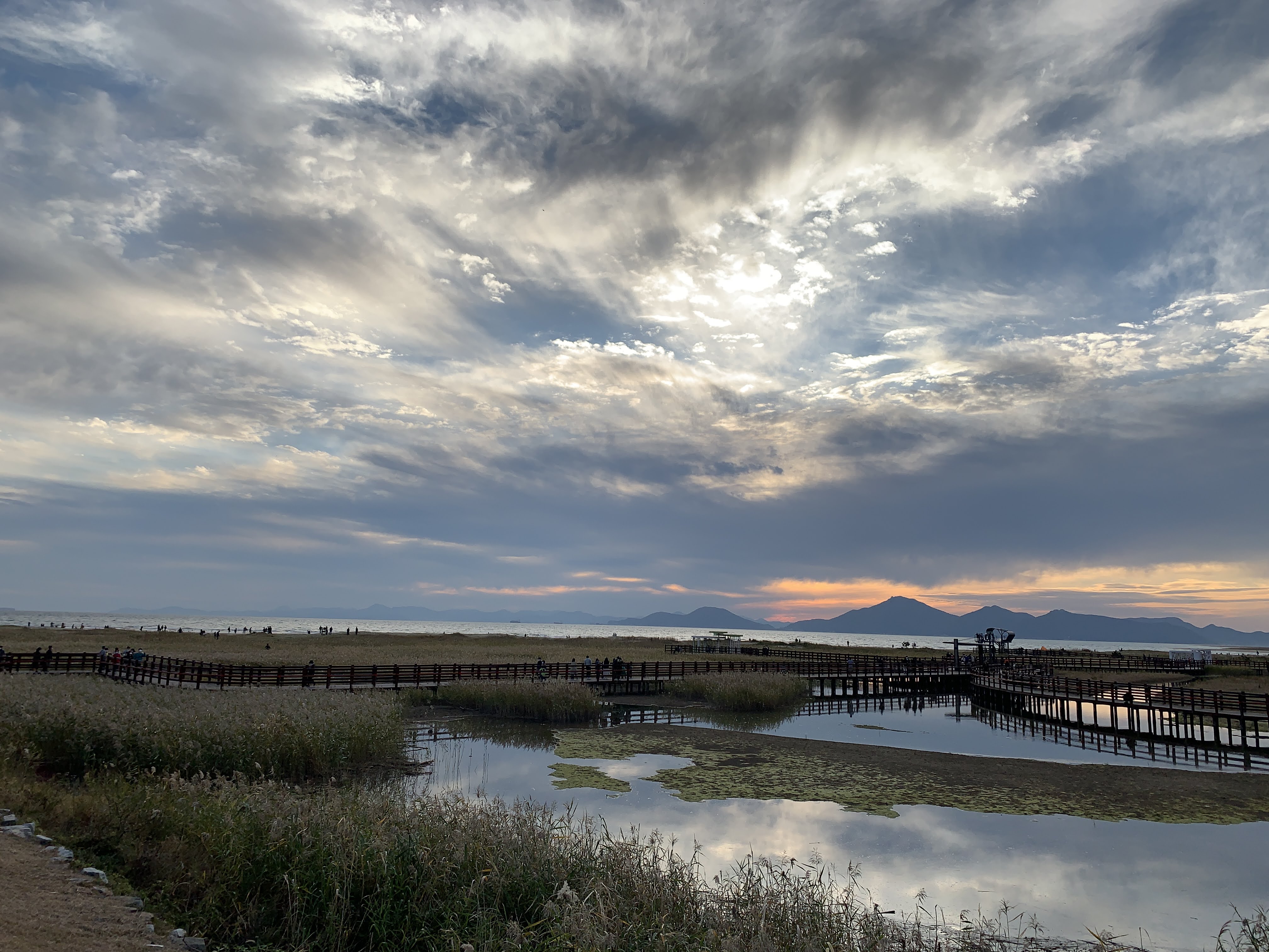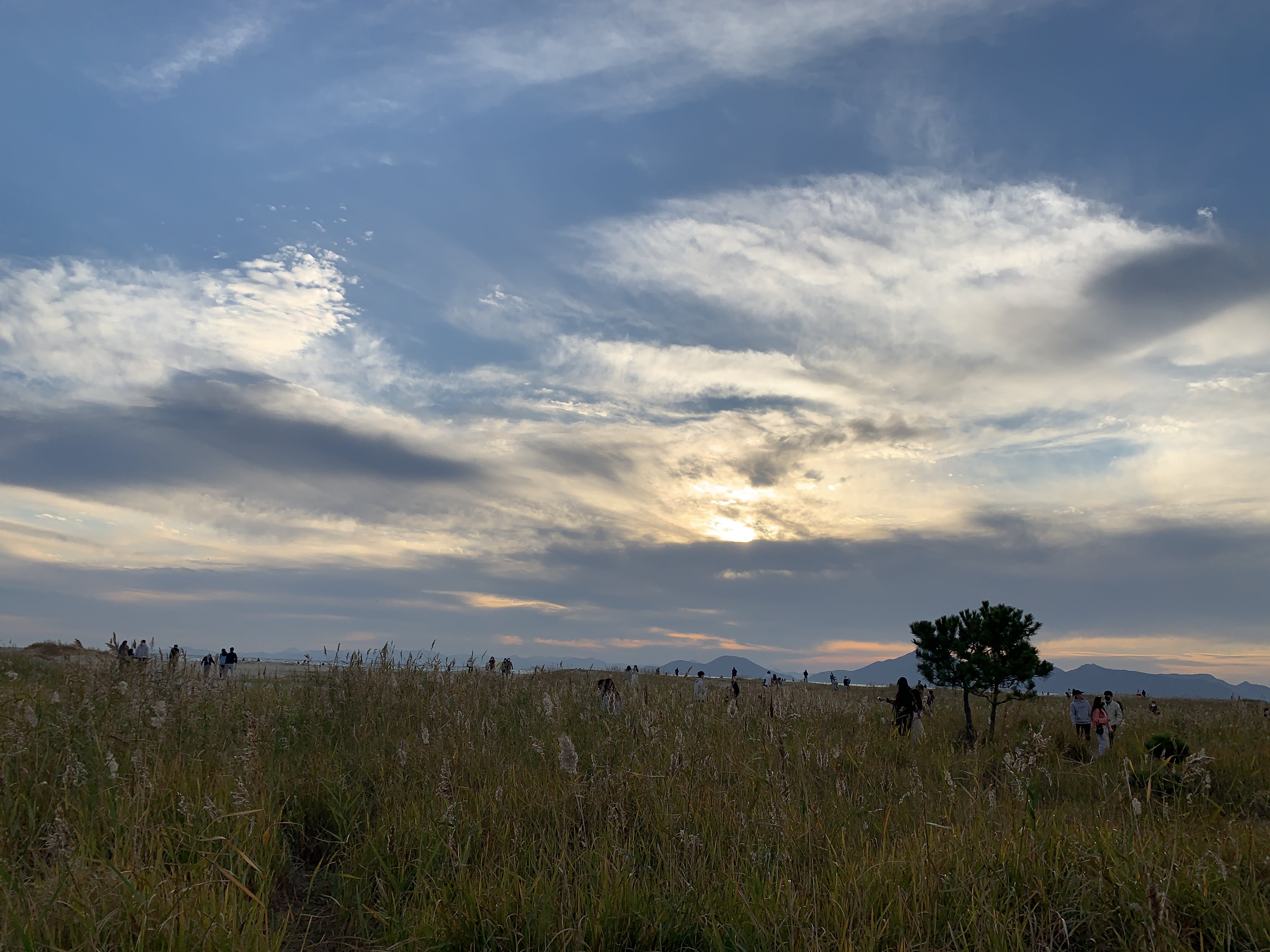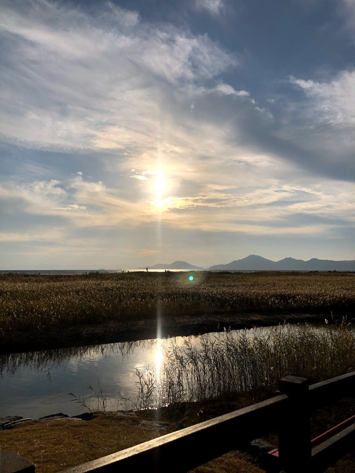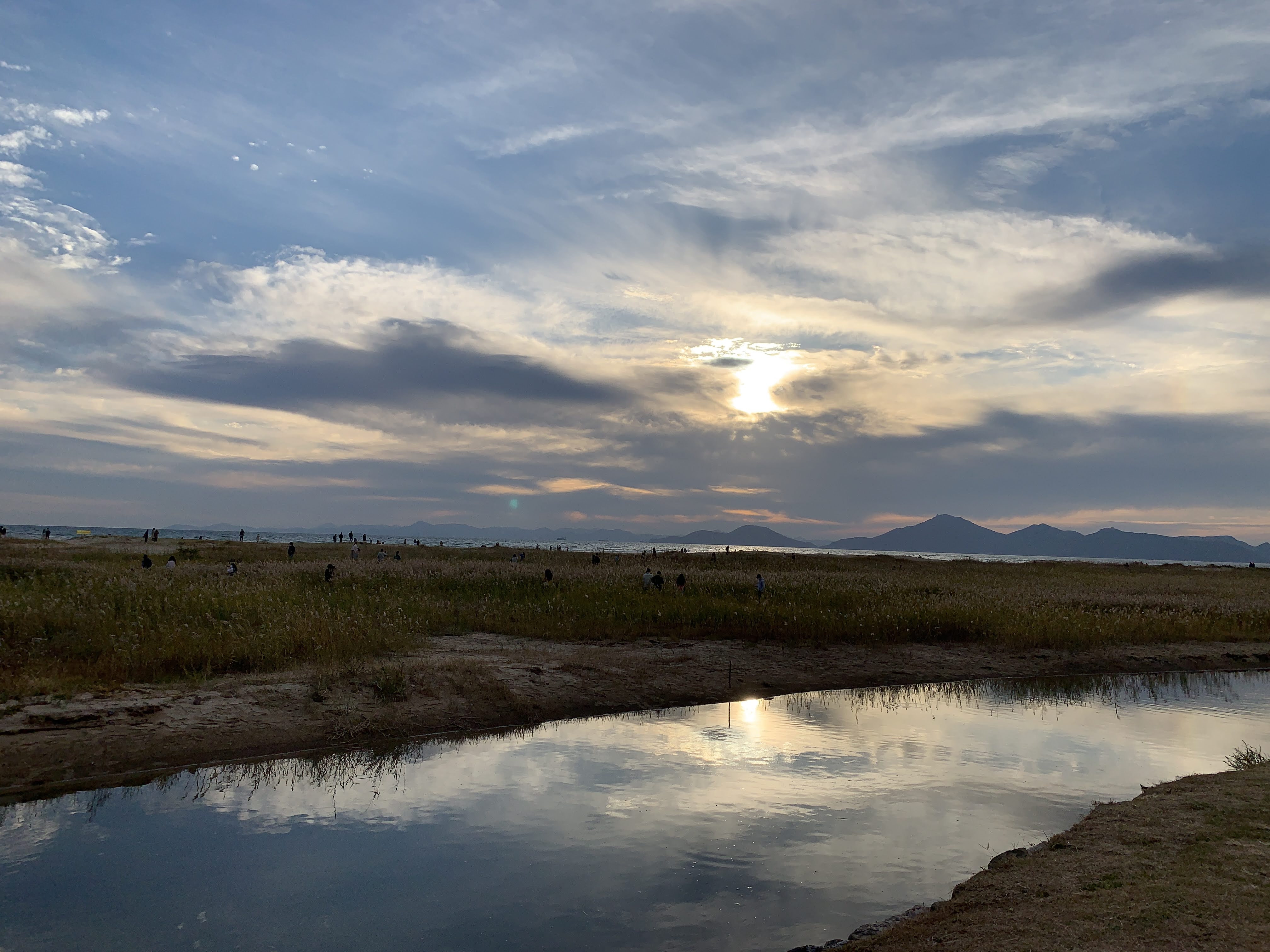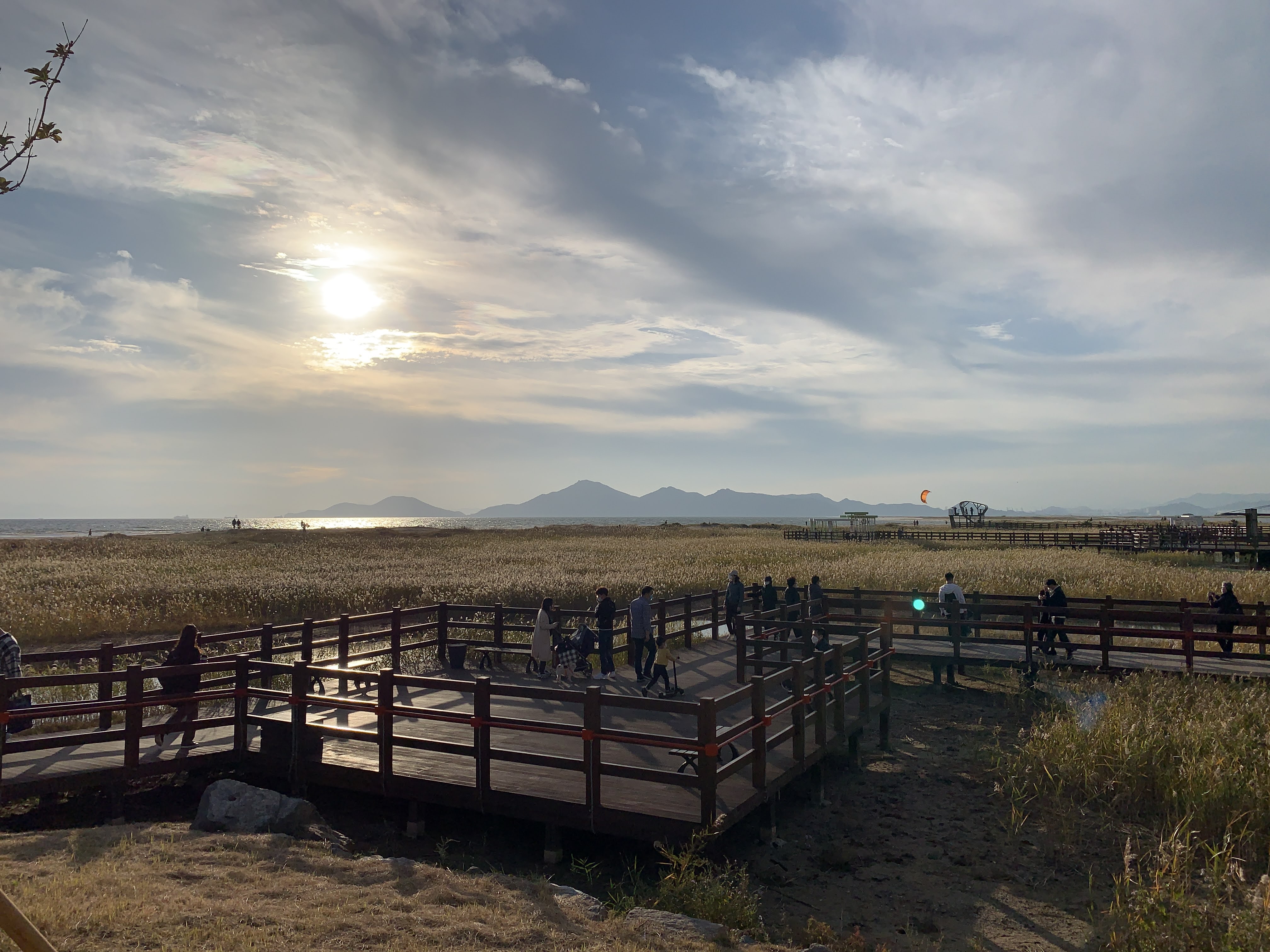 저는 해수욕장이라고 하니까 당연히 모래사장 펼쳐져 있는 그런 일반적인 해수욕장에 상상했는데 여기는 저런 갈대가 쭉 펼쳐져 있습니다. 석양 질 시간 쯤 되니 사진 찍으러 오신 분들이 대포 카메라 들고 석양을 기다리고 있더라구요.