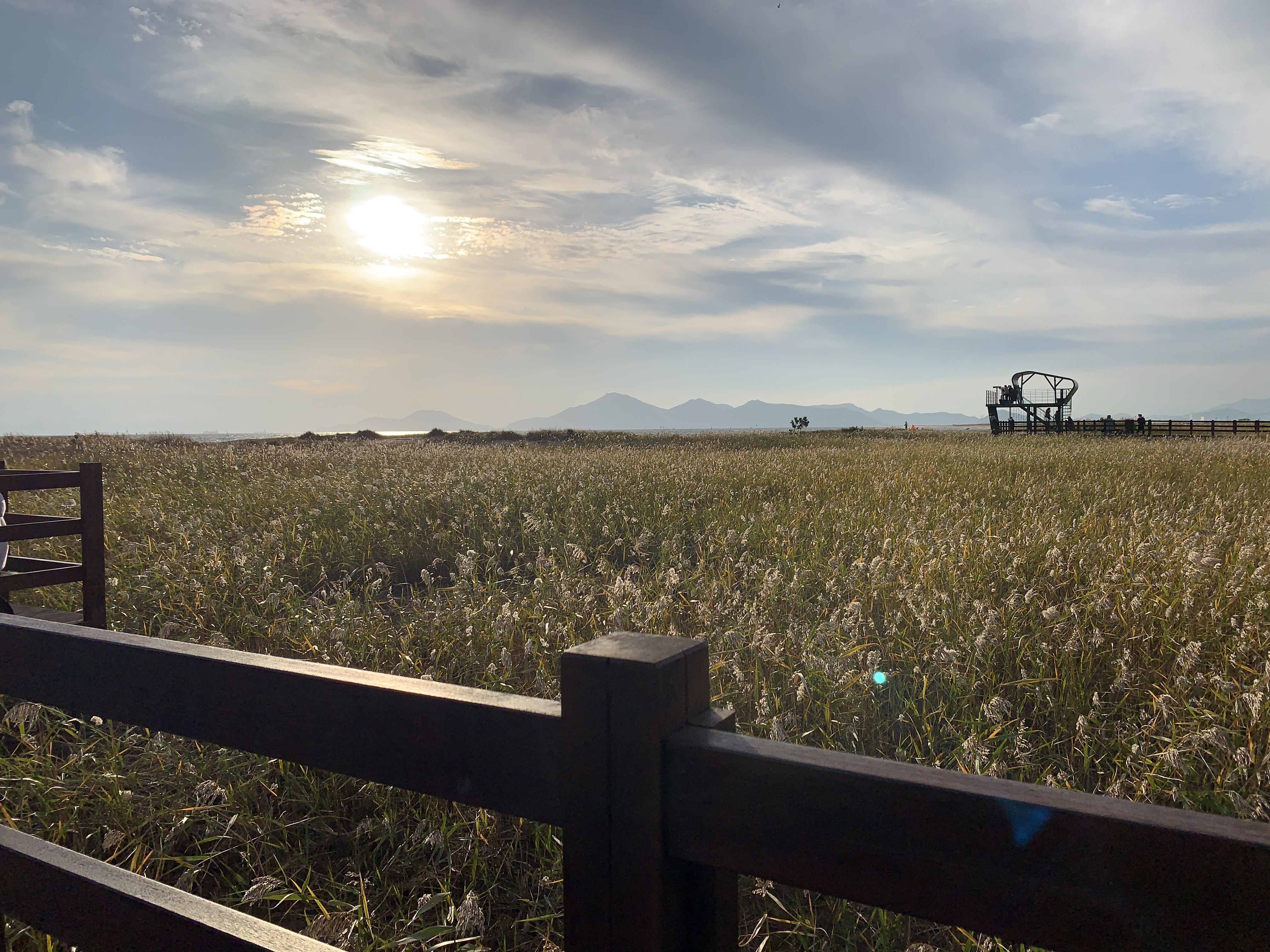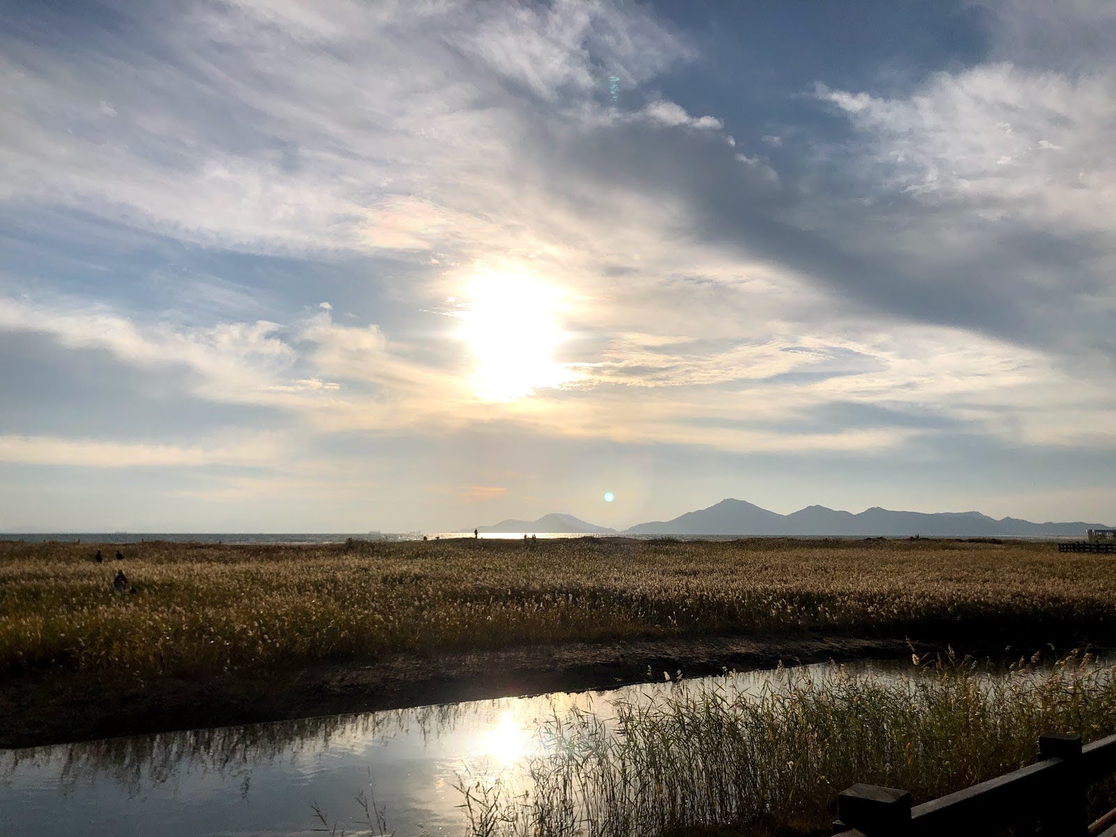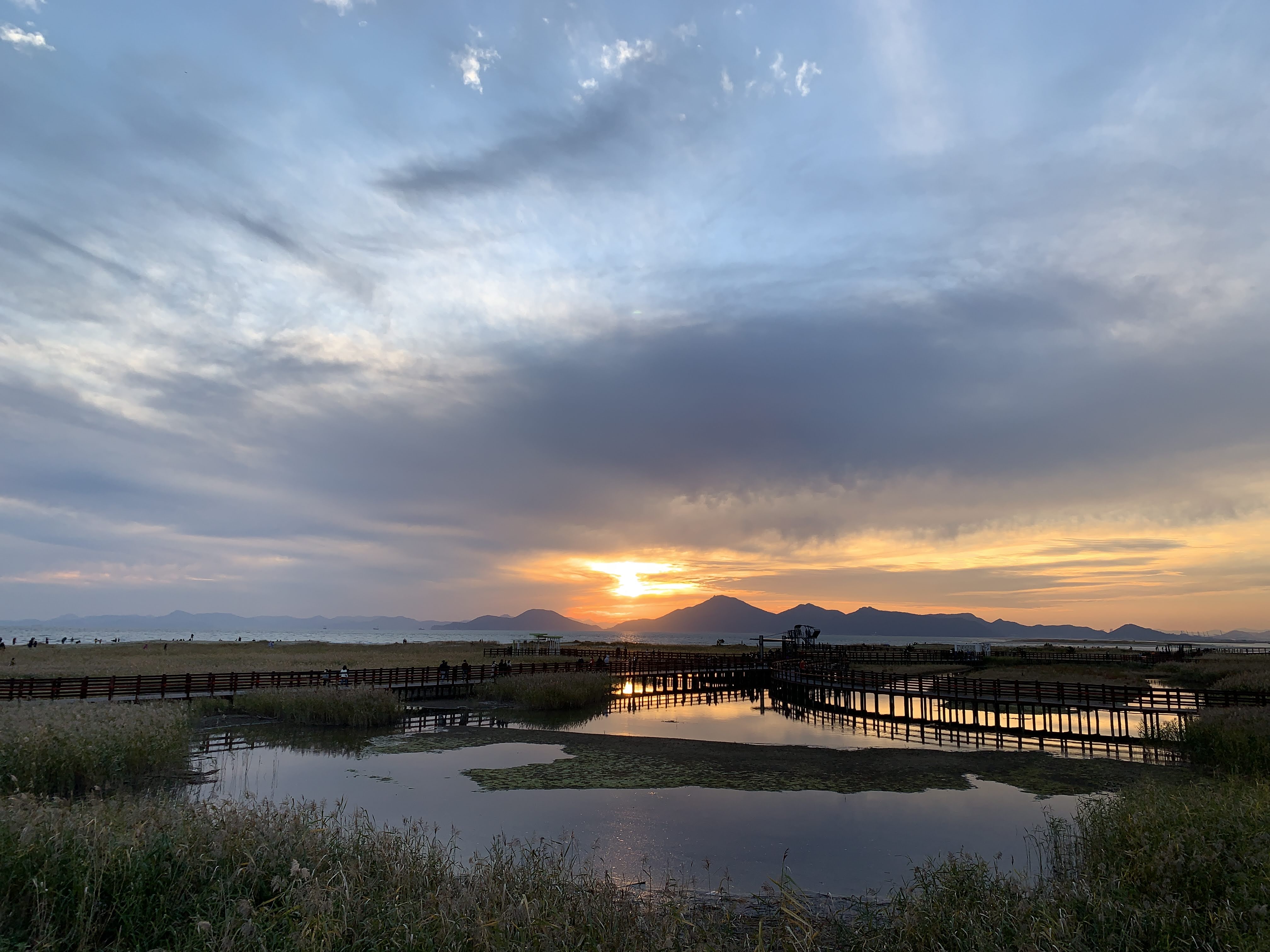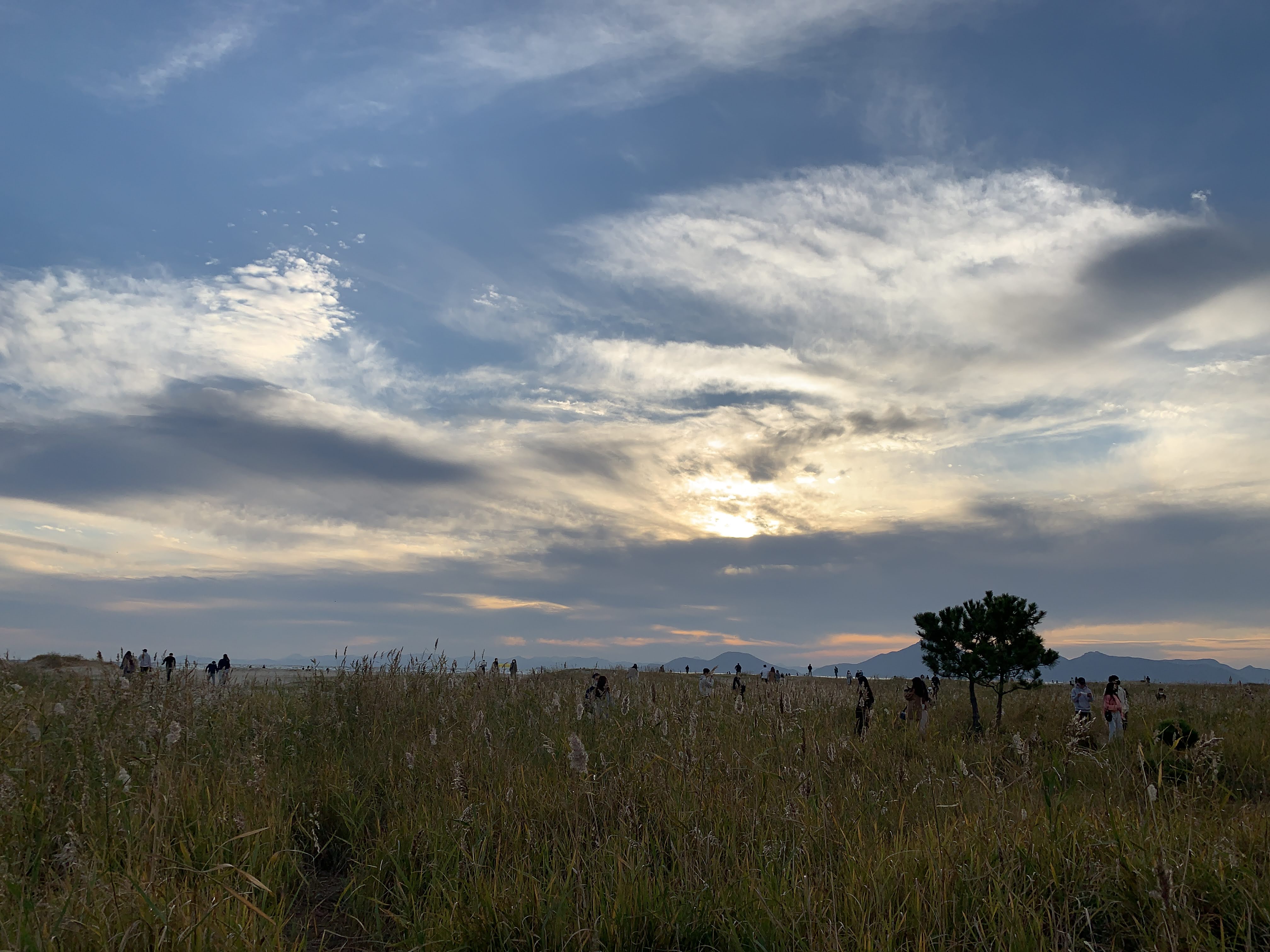 저는 해수욕장이라고 하니까 당연히 모래사장 펼쳐져 있는 그런 일반적인 해수욕장에 상상했는데 여기는 저런 갈대가 쭉 펼쳐져 있습니다. 석양 질 시간 쯤 되니 사진 찍으러 오신 분들이 대포 카메라 들고 석양을 기다리고 있더라구요.