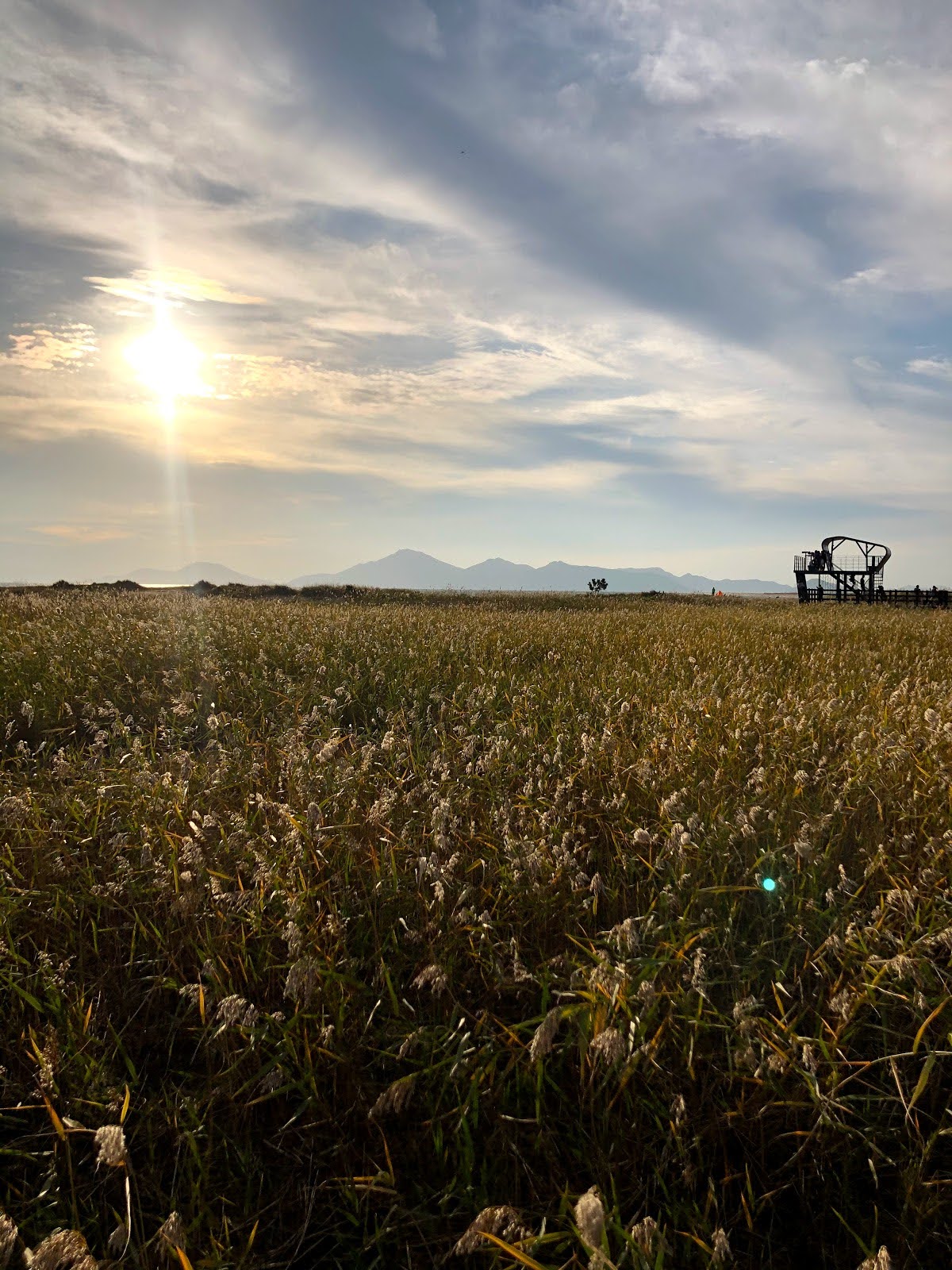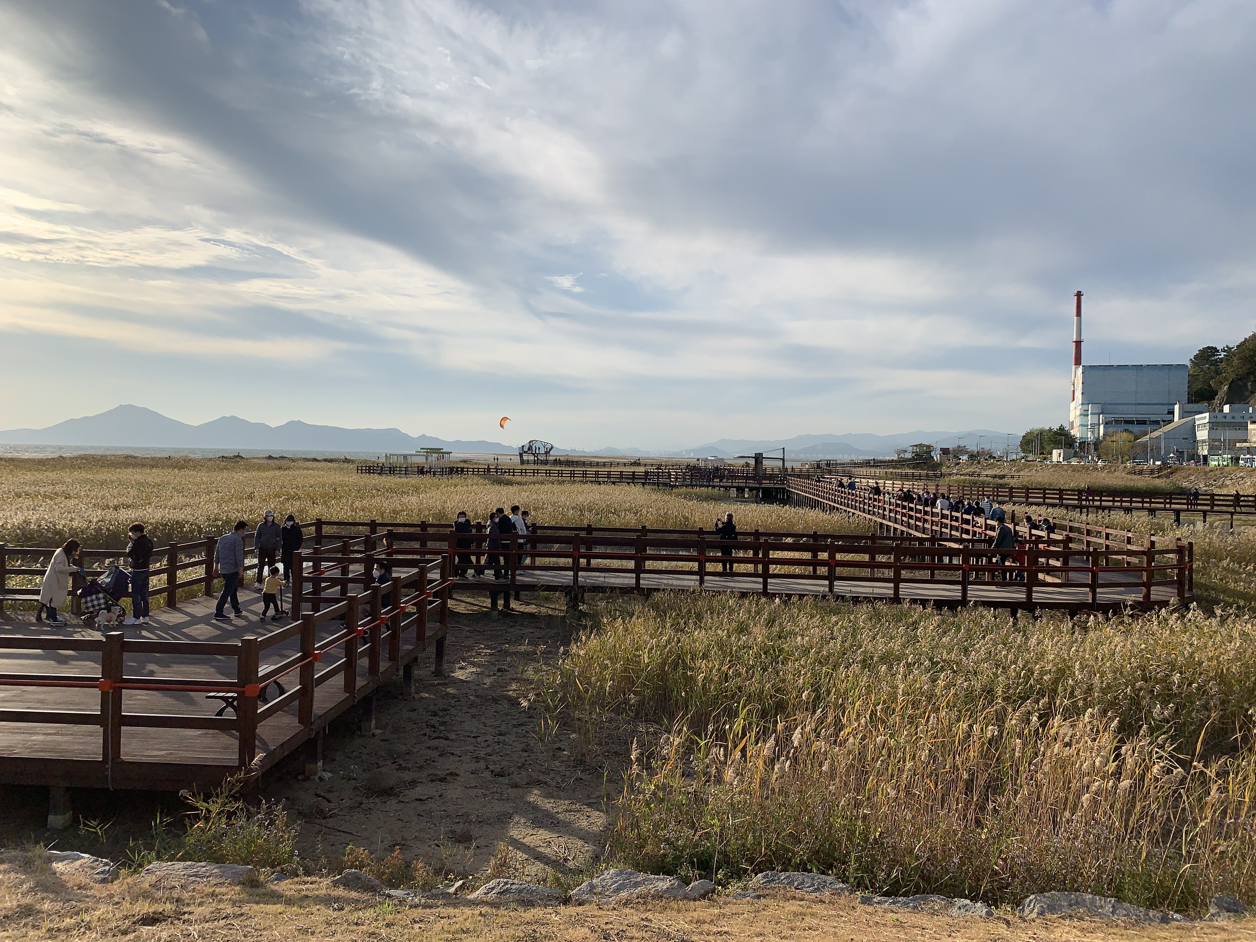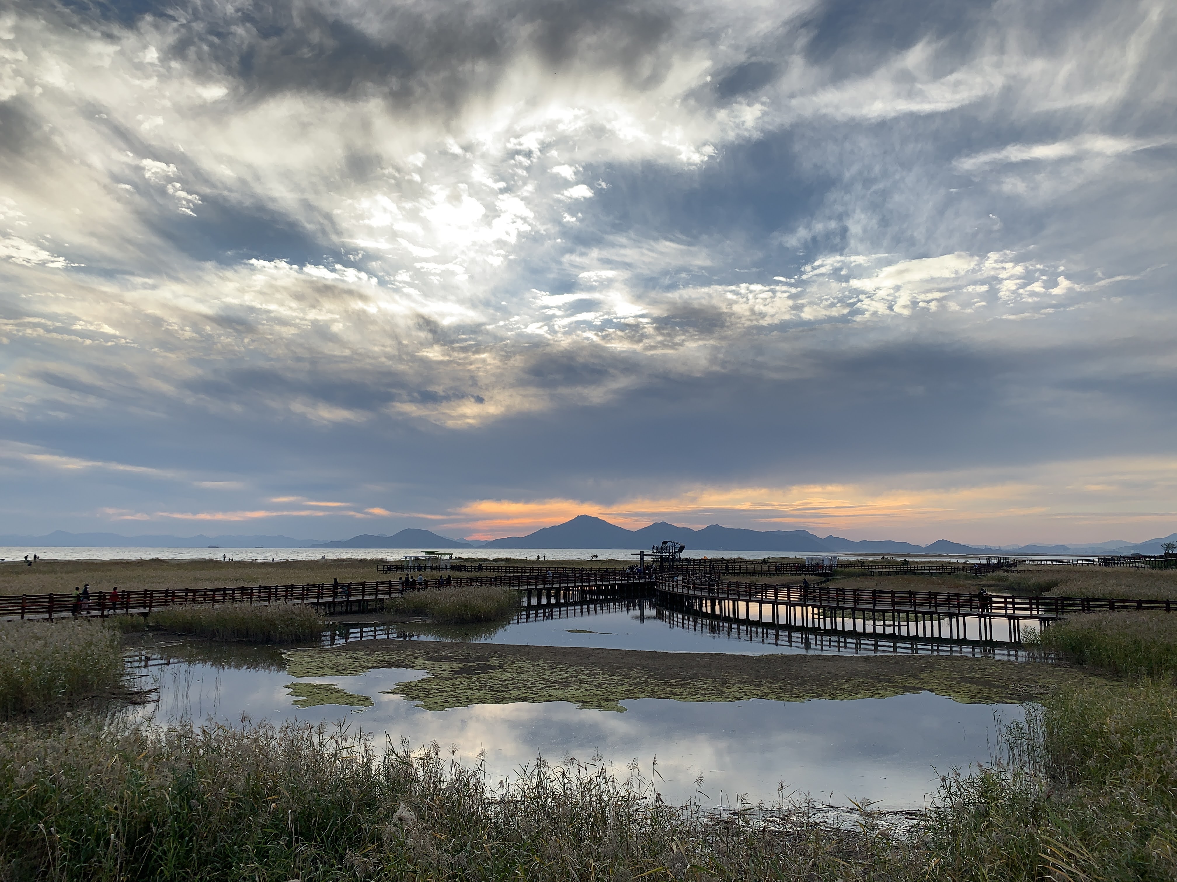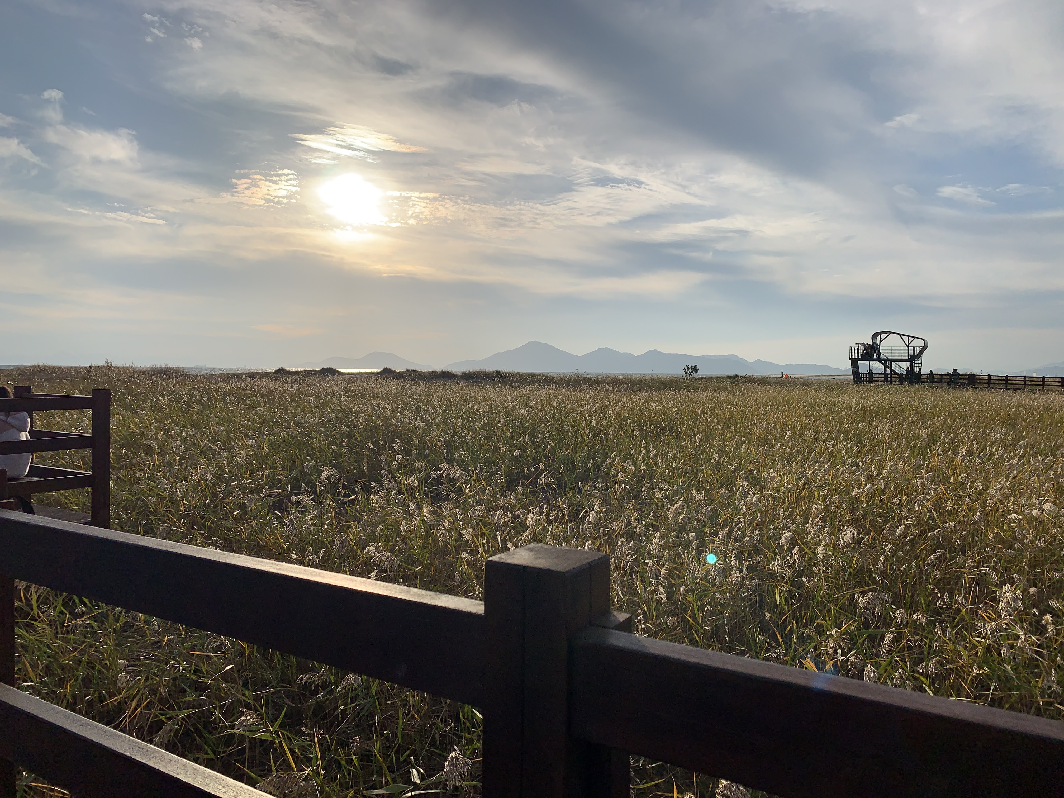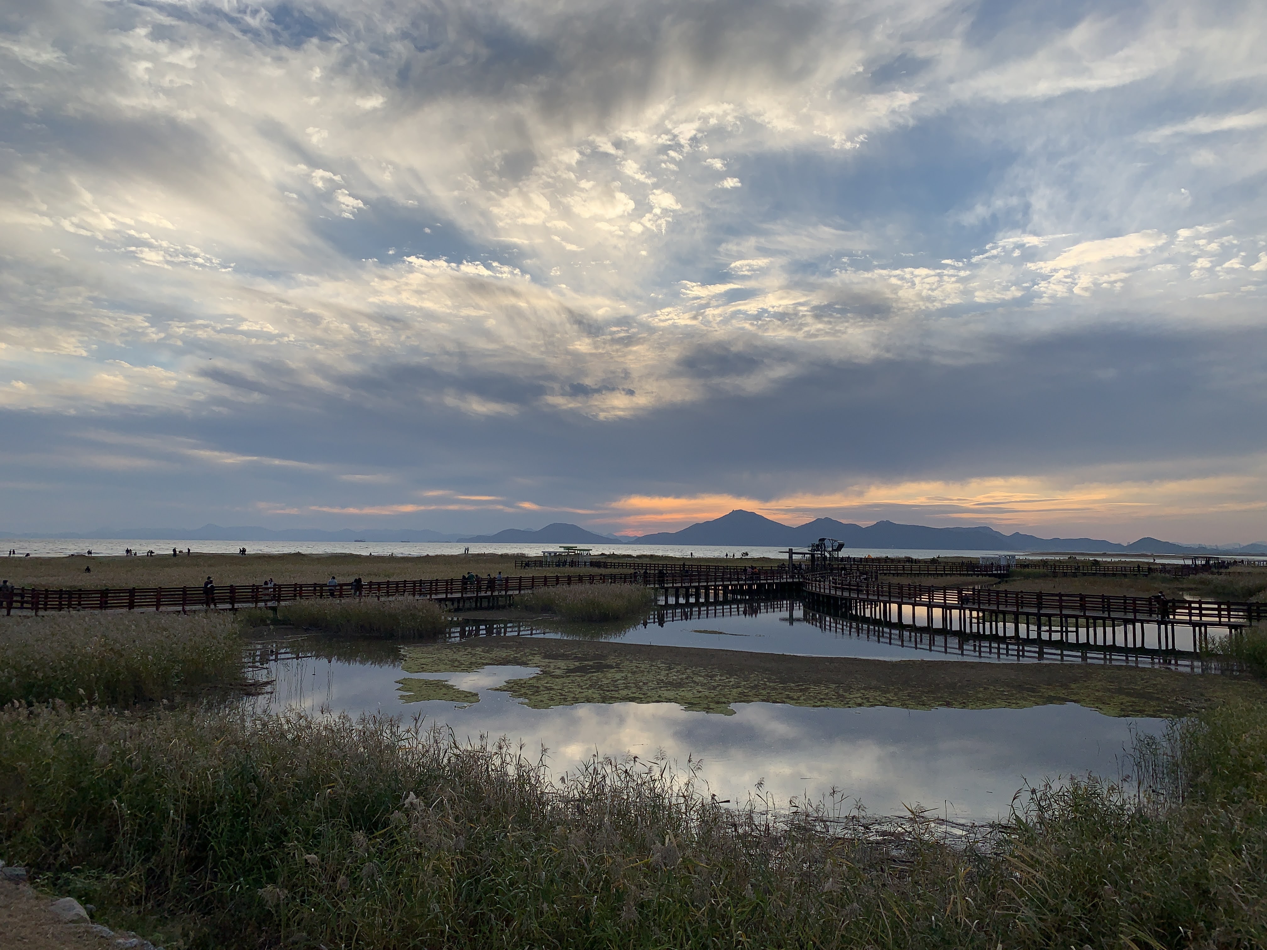 저는 해수욕장이라고 하니까 당연히 모래사장 펼쳐져 있는 그런 일반적인 해수욕장에 상상했는데 여기는 저런 갈대가 쭉 펼쳐져 있습니다. 석양 질 시간 쯤 되니 사진 찍으러 오신 분들이 대포 카메라 들고 석양을 기다리고 있더라구요.