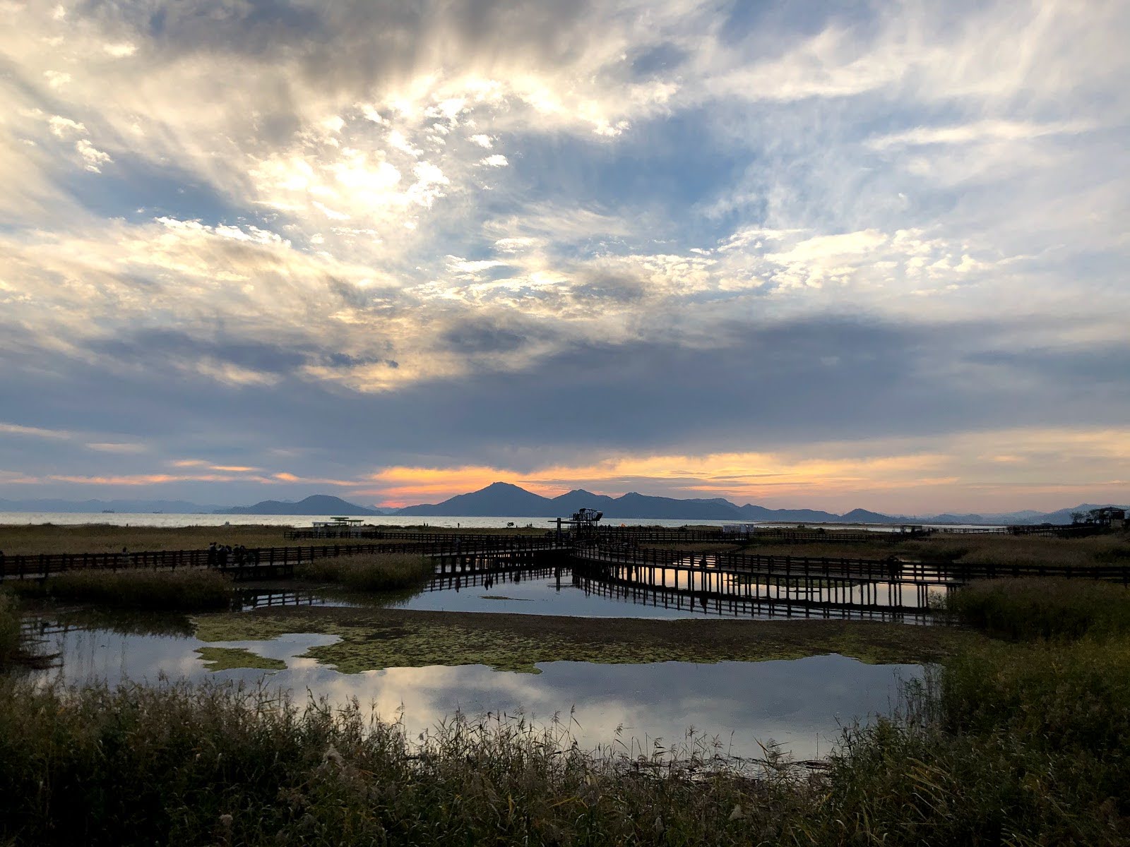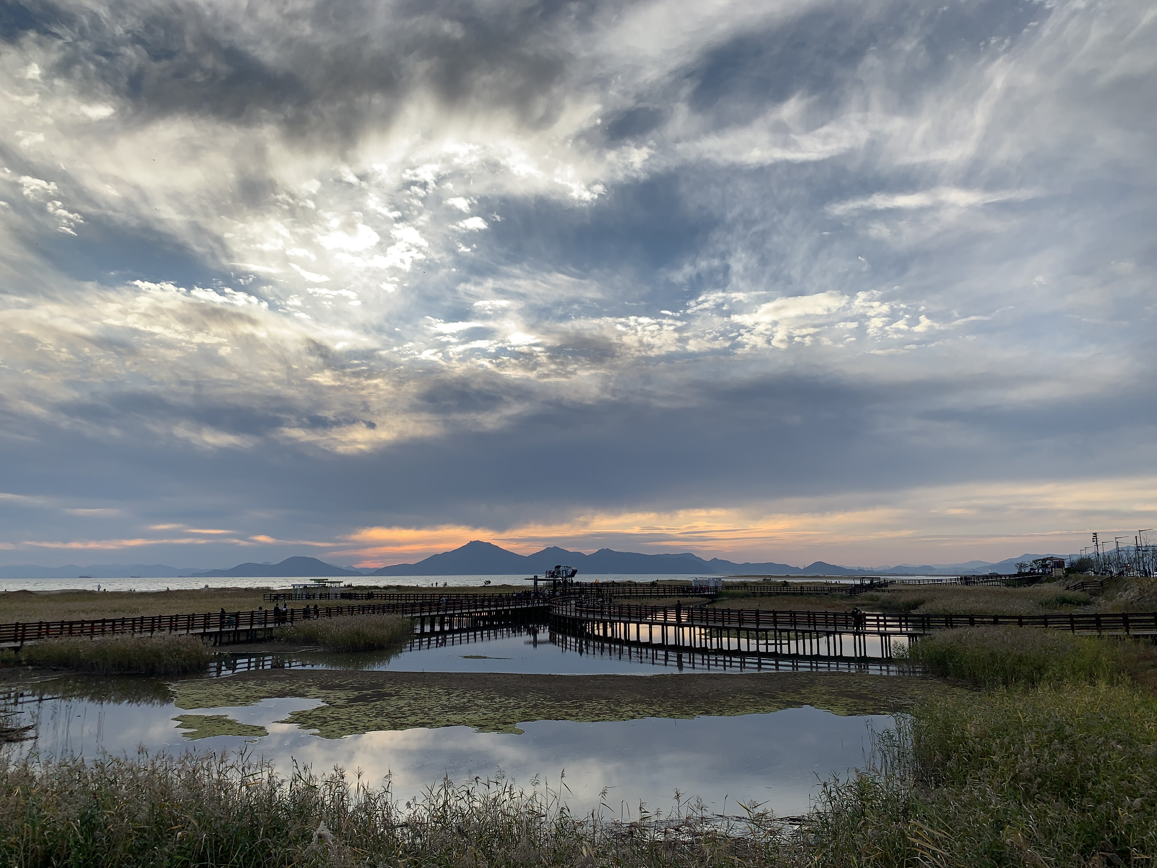 저는 해수욕장이라고 하니까 당연히 모래사장 펼쳐져 있는 그런 일반적인 해수욕장에 상상했는데 여기는 저런 갈대가 쭉 펼쳐져 있습니다. 석양 질 시간 쯤 되니 사진 찍으러 오신 분들이 대포 카메라 들고 석양을 기다리고 있더라구요.