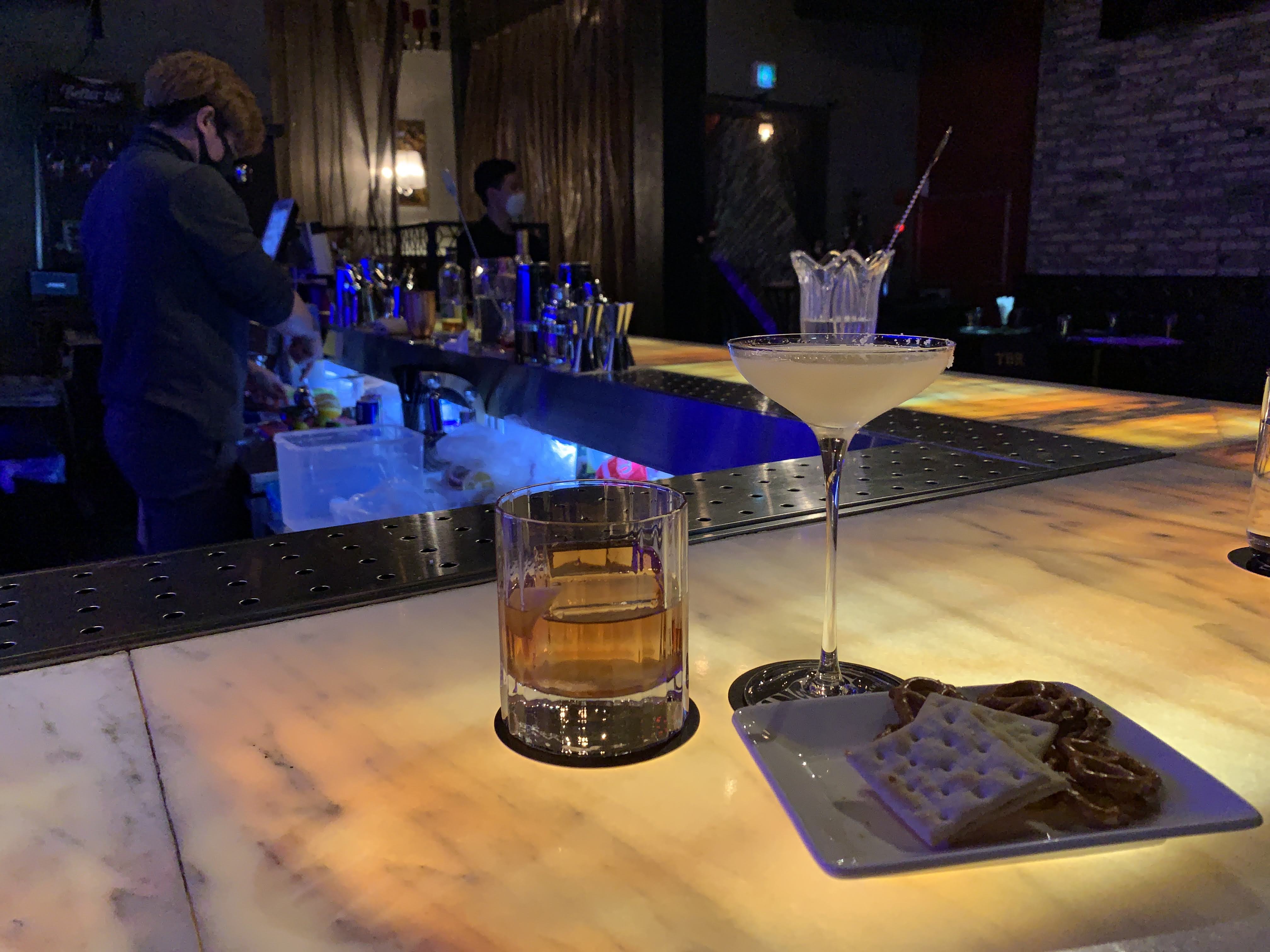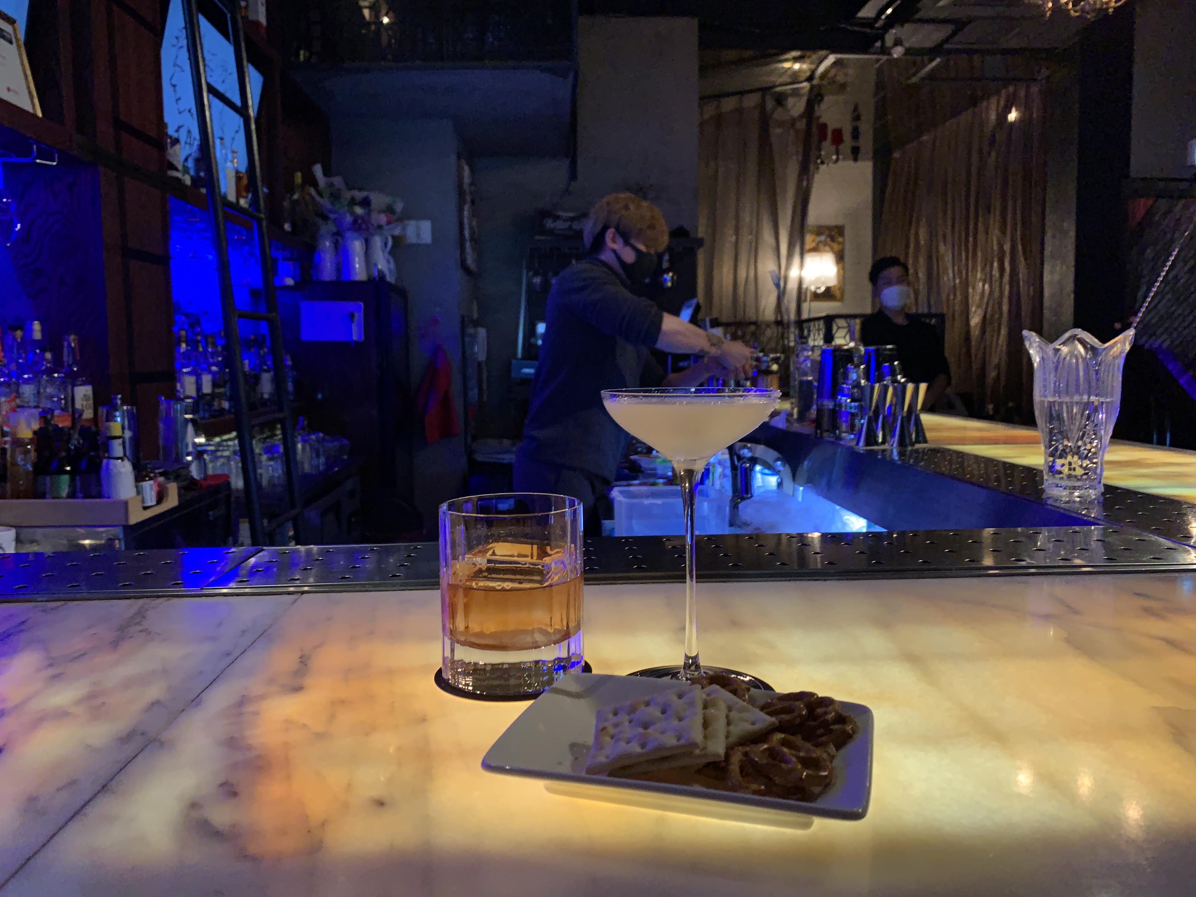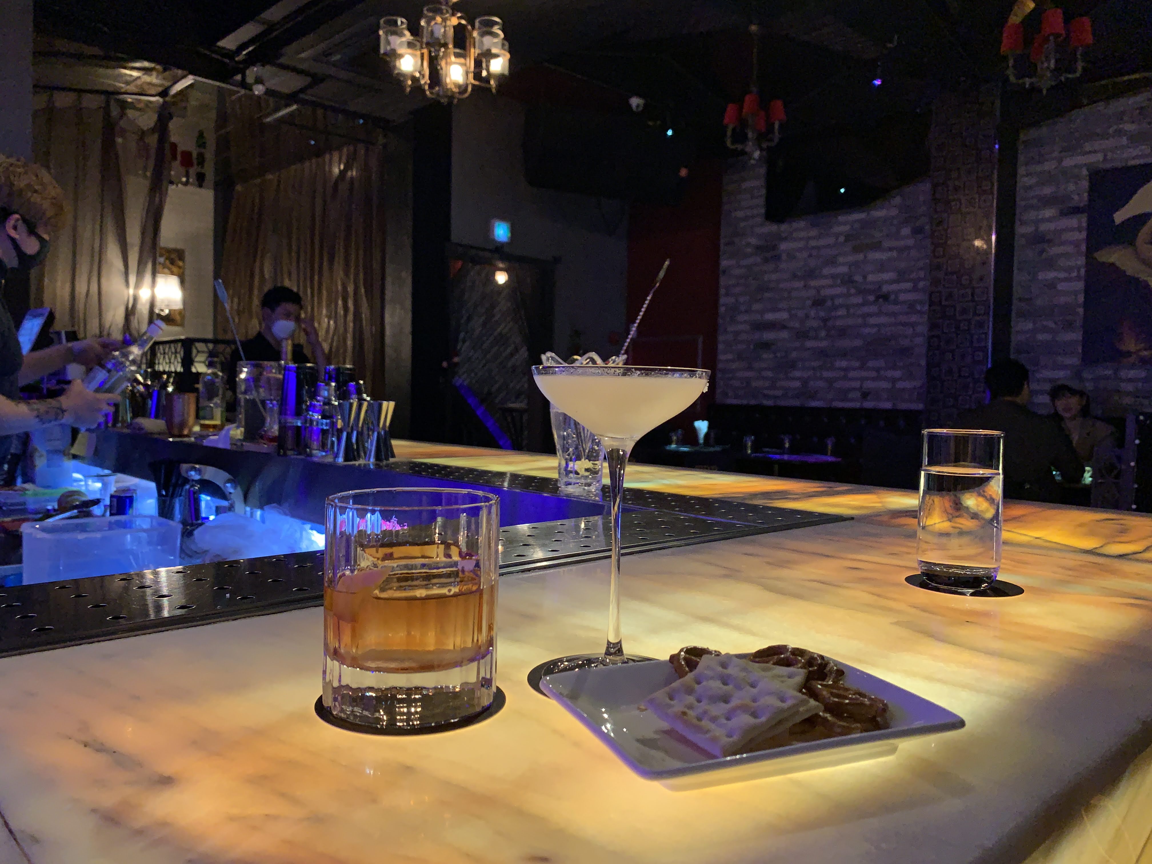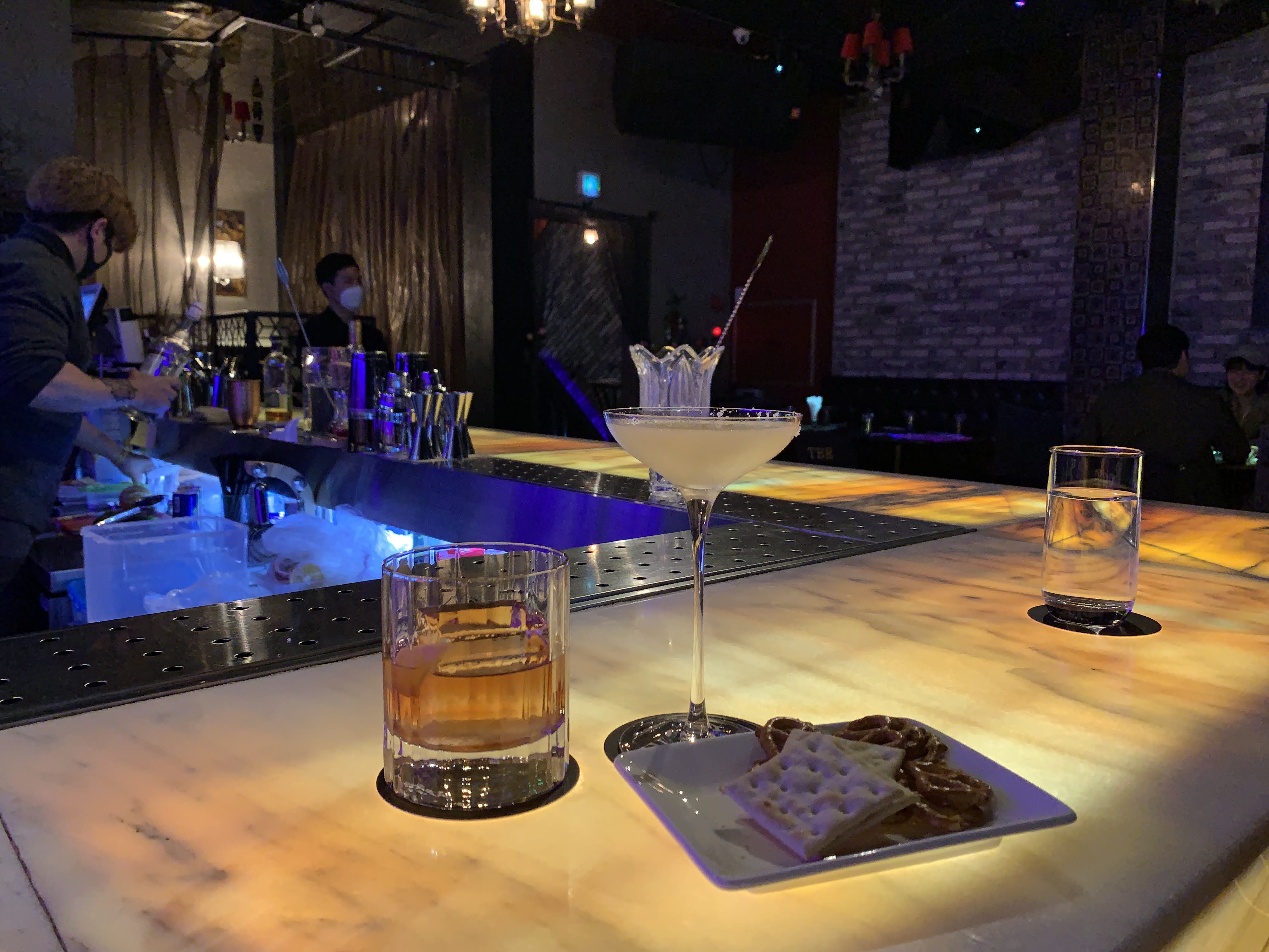 저는 칵테일 바에 와서 굳이 비싸게 다른 안주 시키는 건 돈 아깝다고 생각해서 그냥 기본으로 주는 비스킷 정도만 먹습니다. 어차피 밥을 먹고 오니 배가 부르기도 하고요.