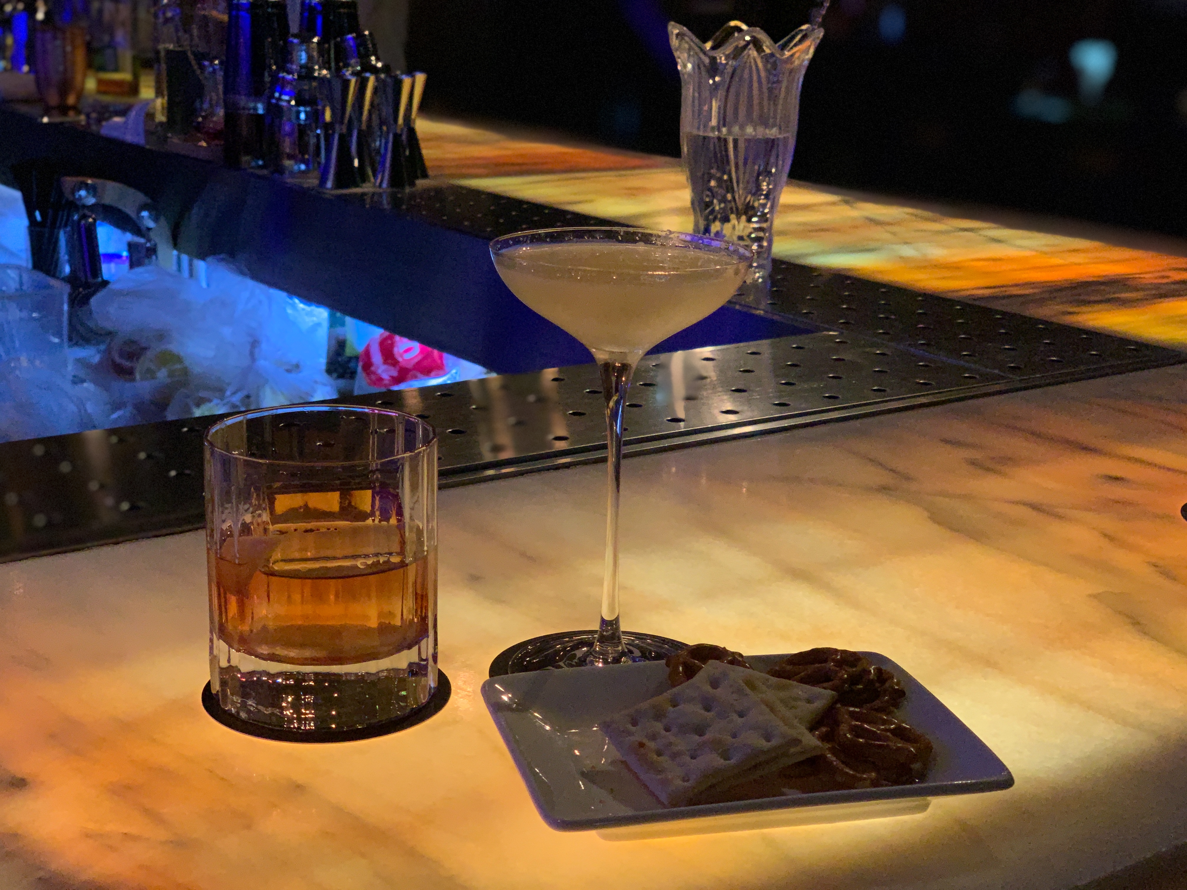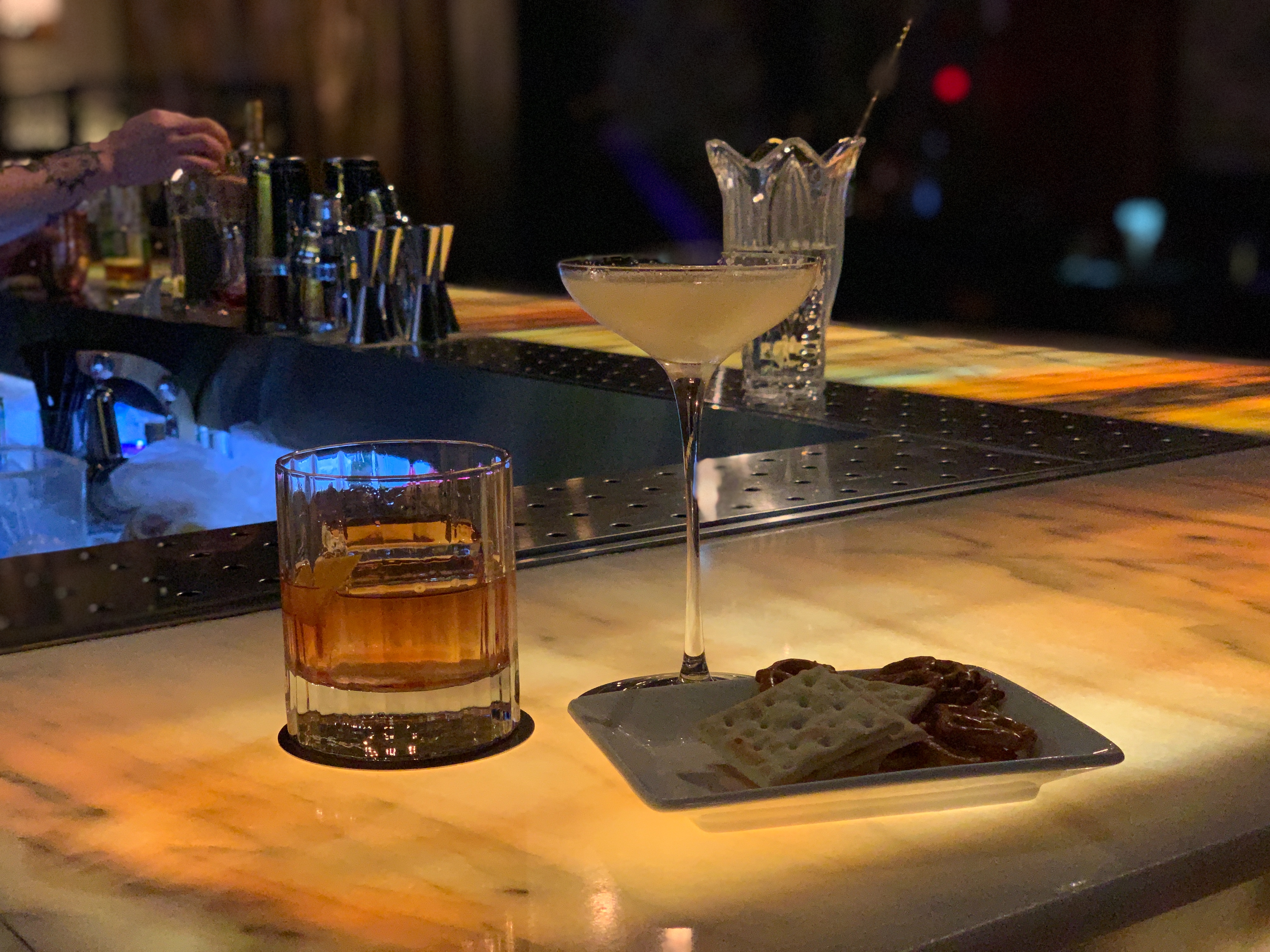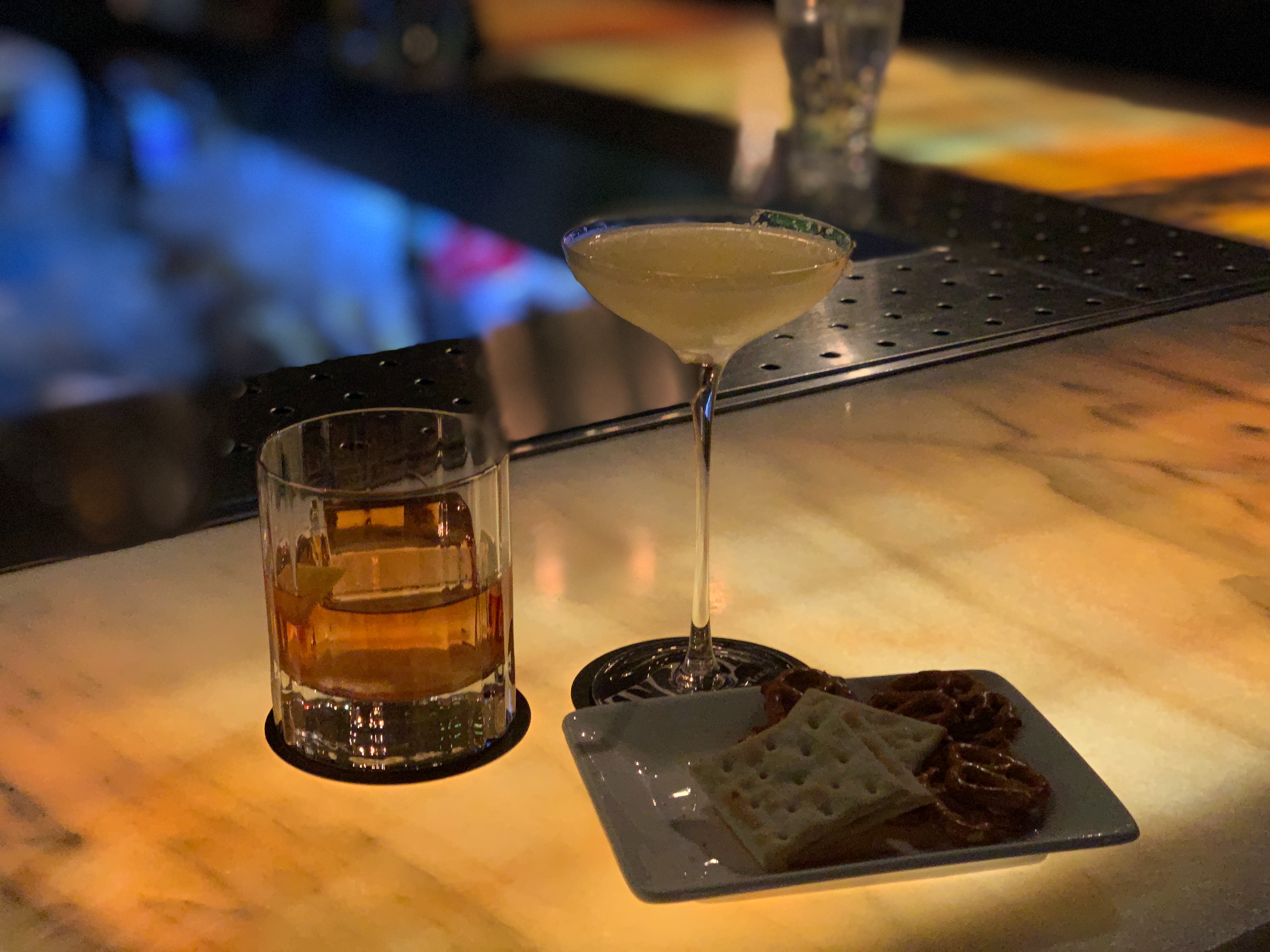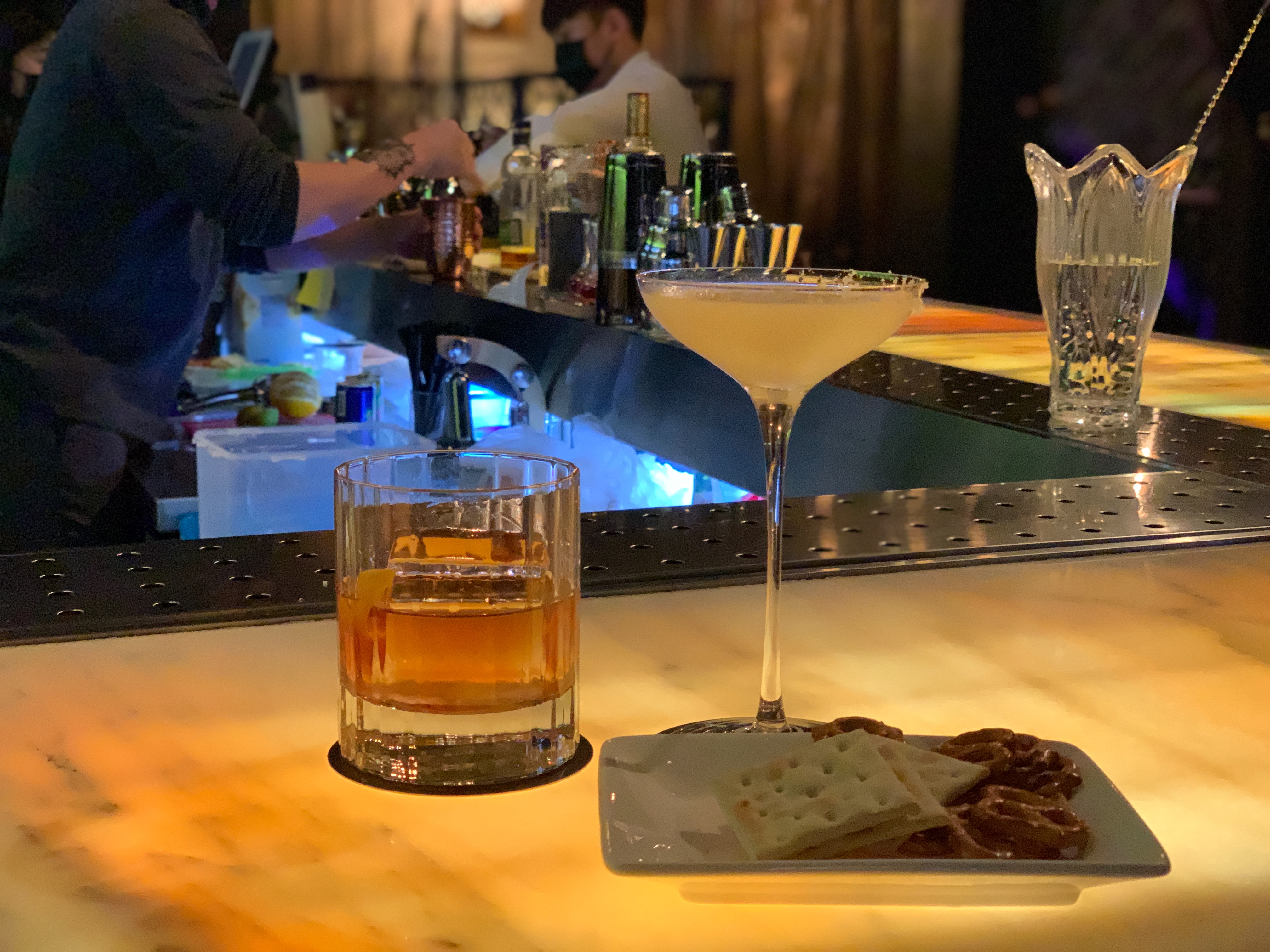 저는 칵테일 바에 와서 굳이 비싸게 다른 안주 시키는 건 돈 아깝다고 생각해서 그냥 기본으로 주는 비스킷 정도만 먹습니다. 어차피 밥을 먹고 오니 배가 부르기도 하고요.