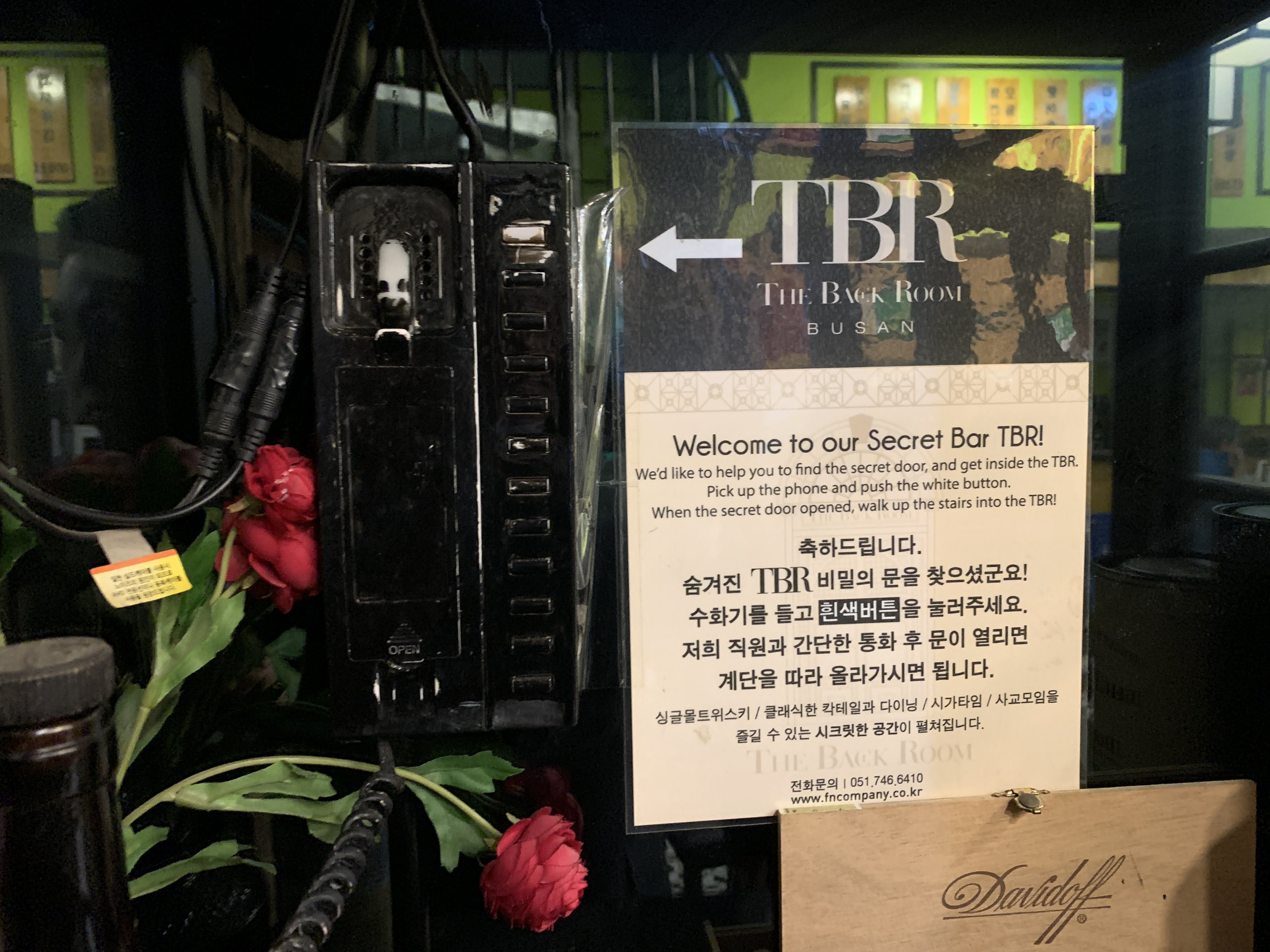 위에서 보시는 것처럼 공중전화기를 찾아서 수화기를 들고 하얀색 버튼을 누르면 종업원이 문을 열어줍니다. 그러면 계단을 따라서 올라가면 바가 나옵니다.
