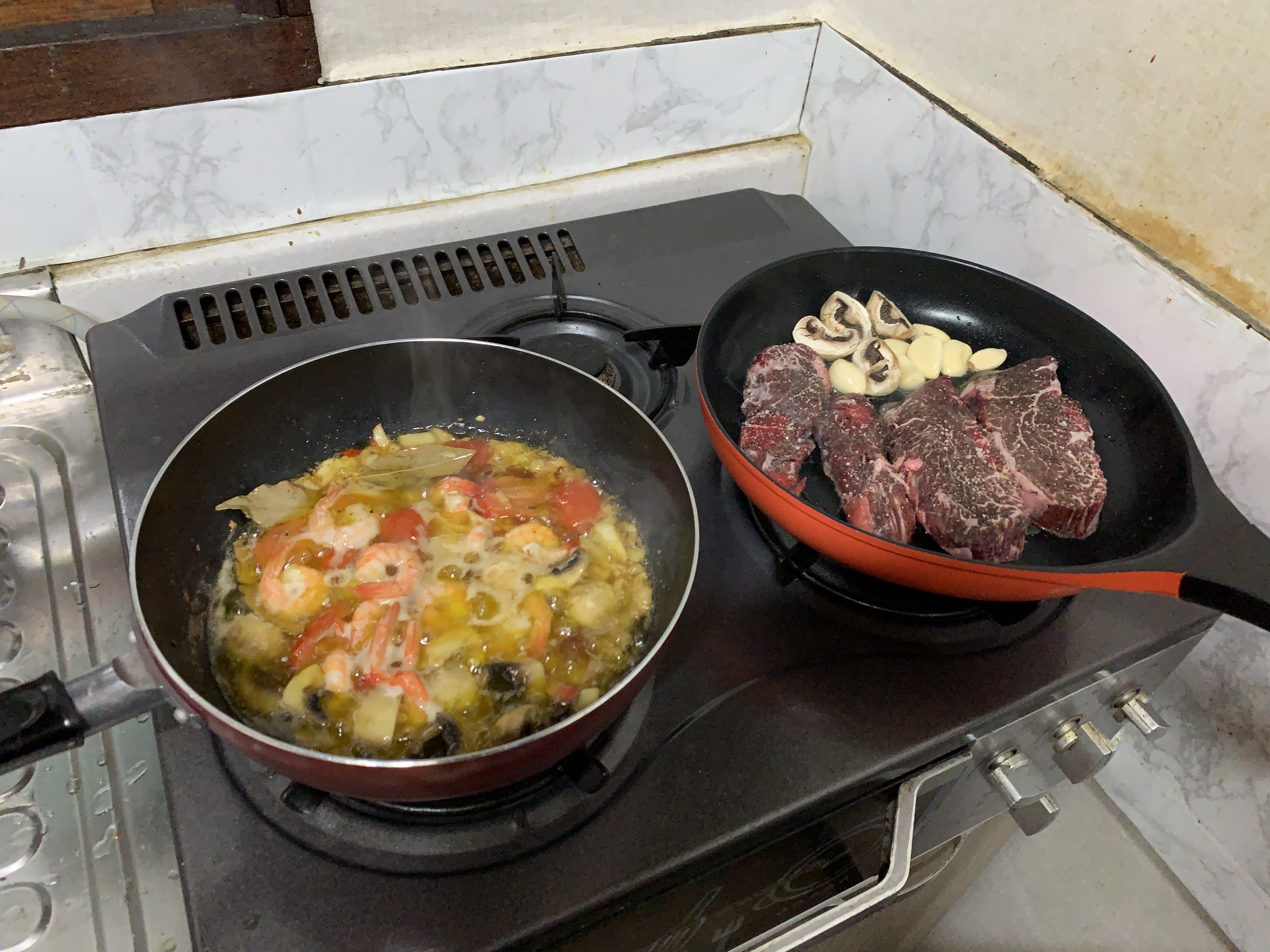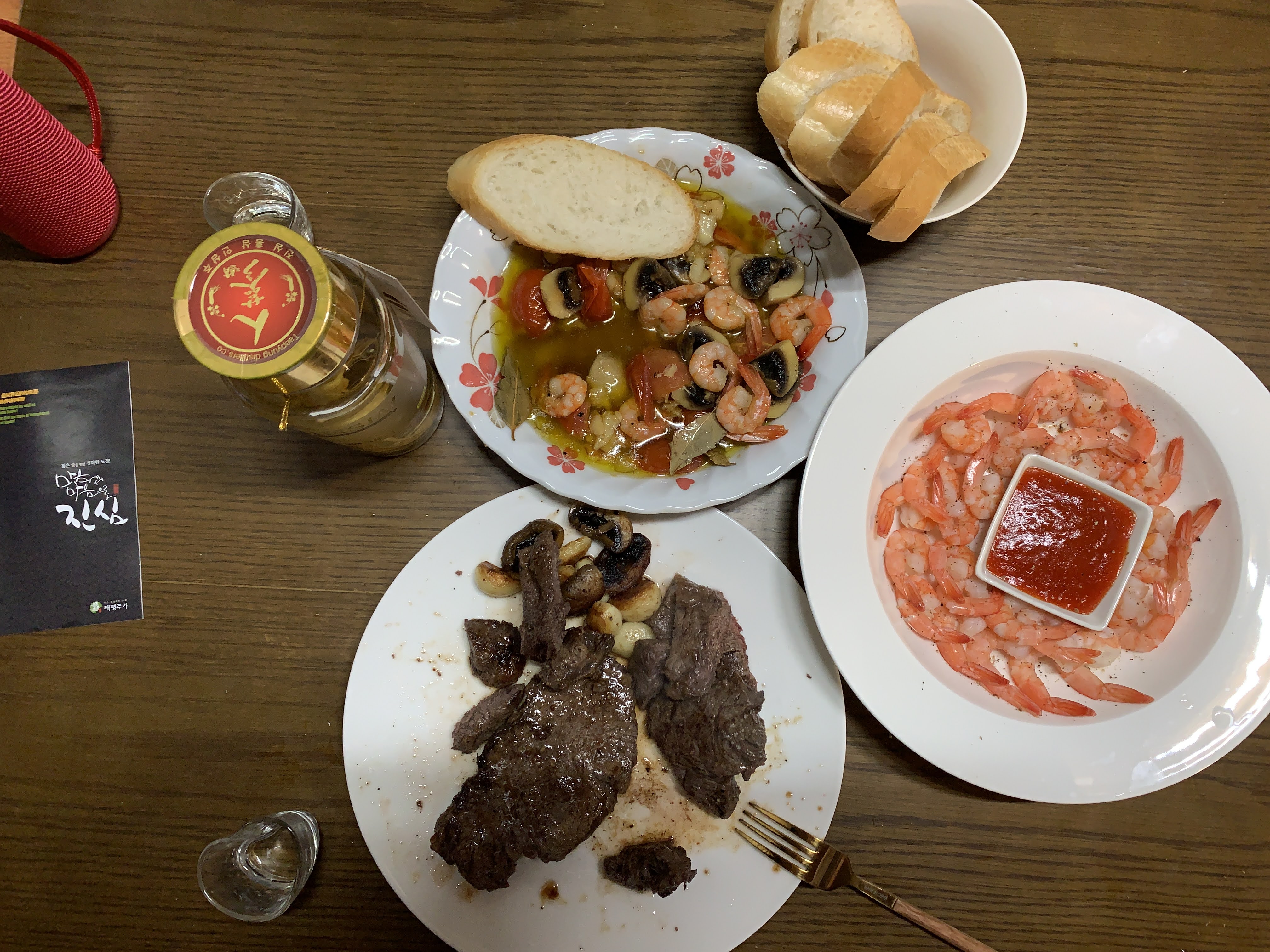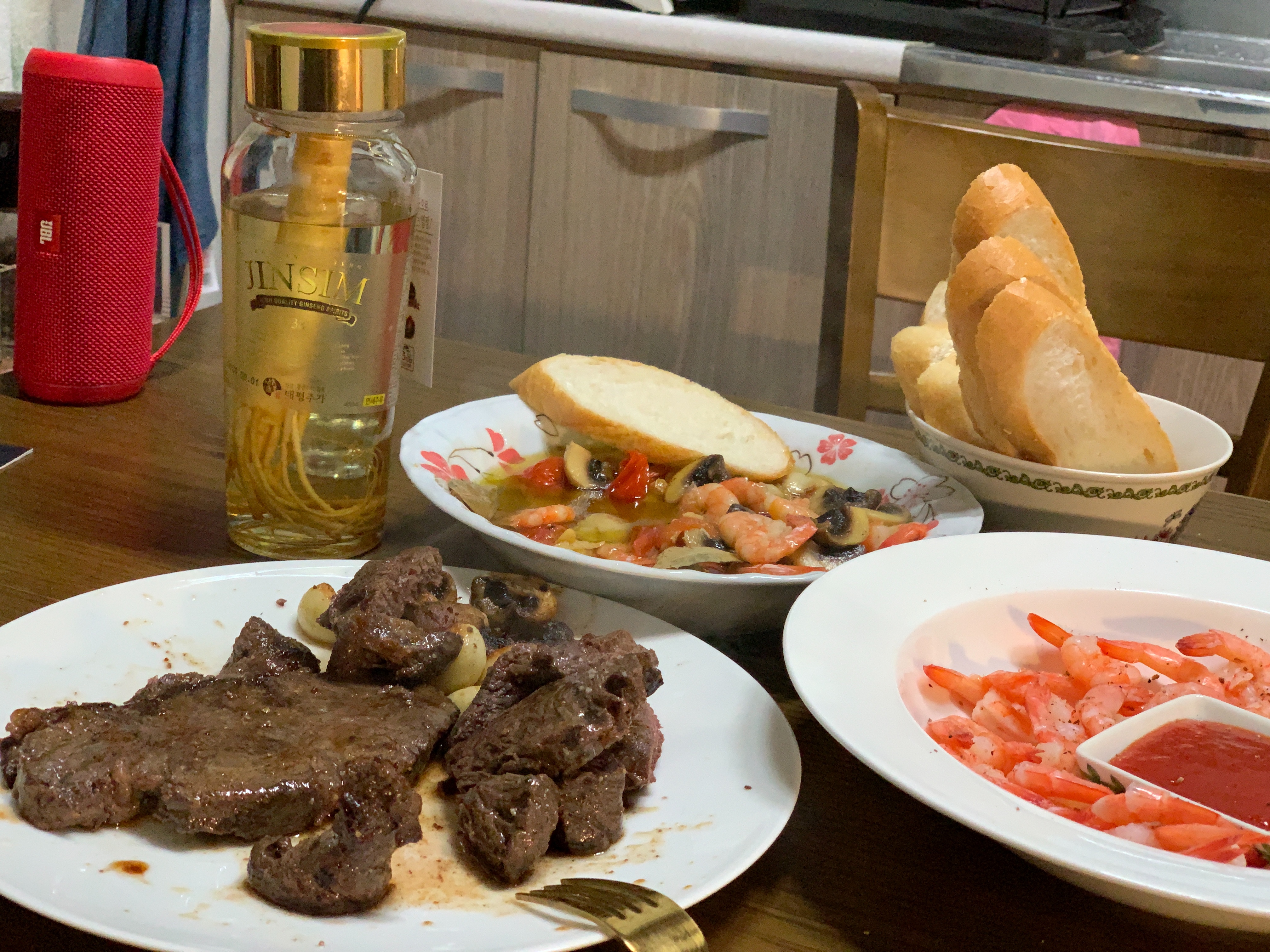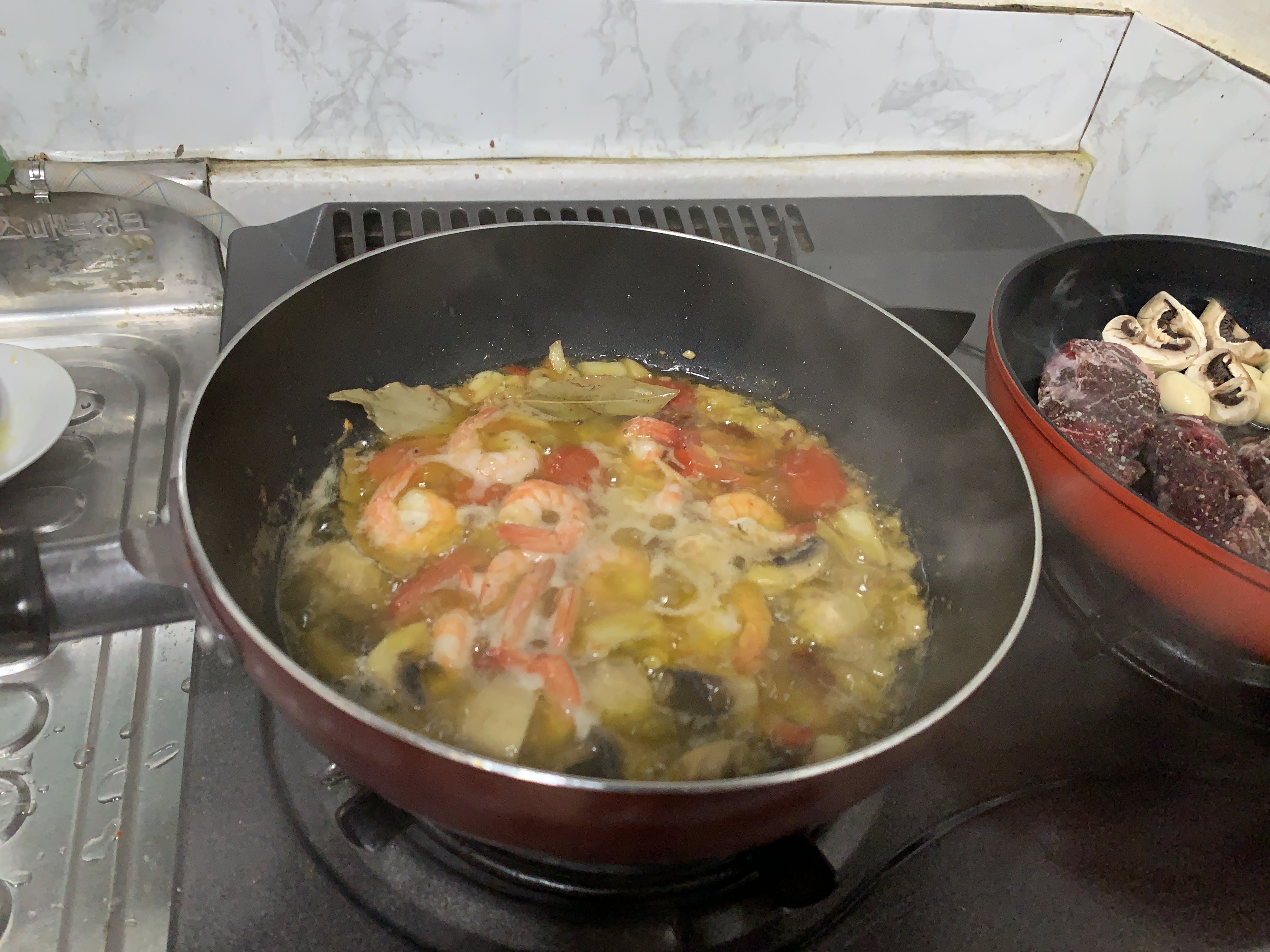 저희는 스테이크를 굽고 감바스에 한잔 하기로 했습니다.