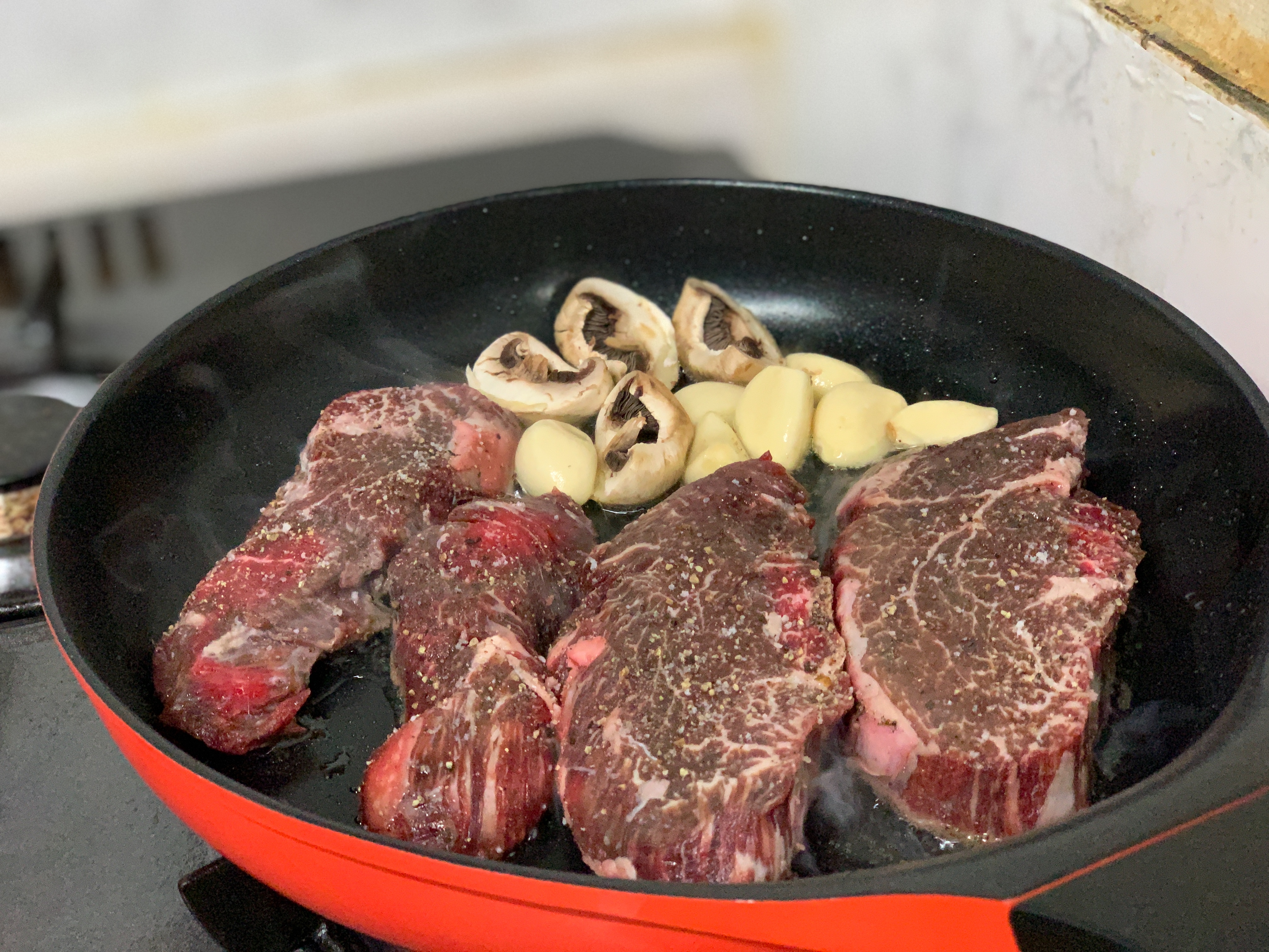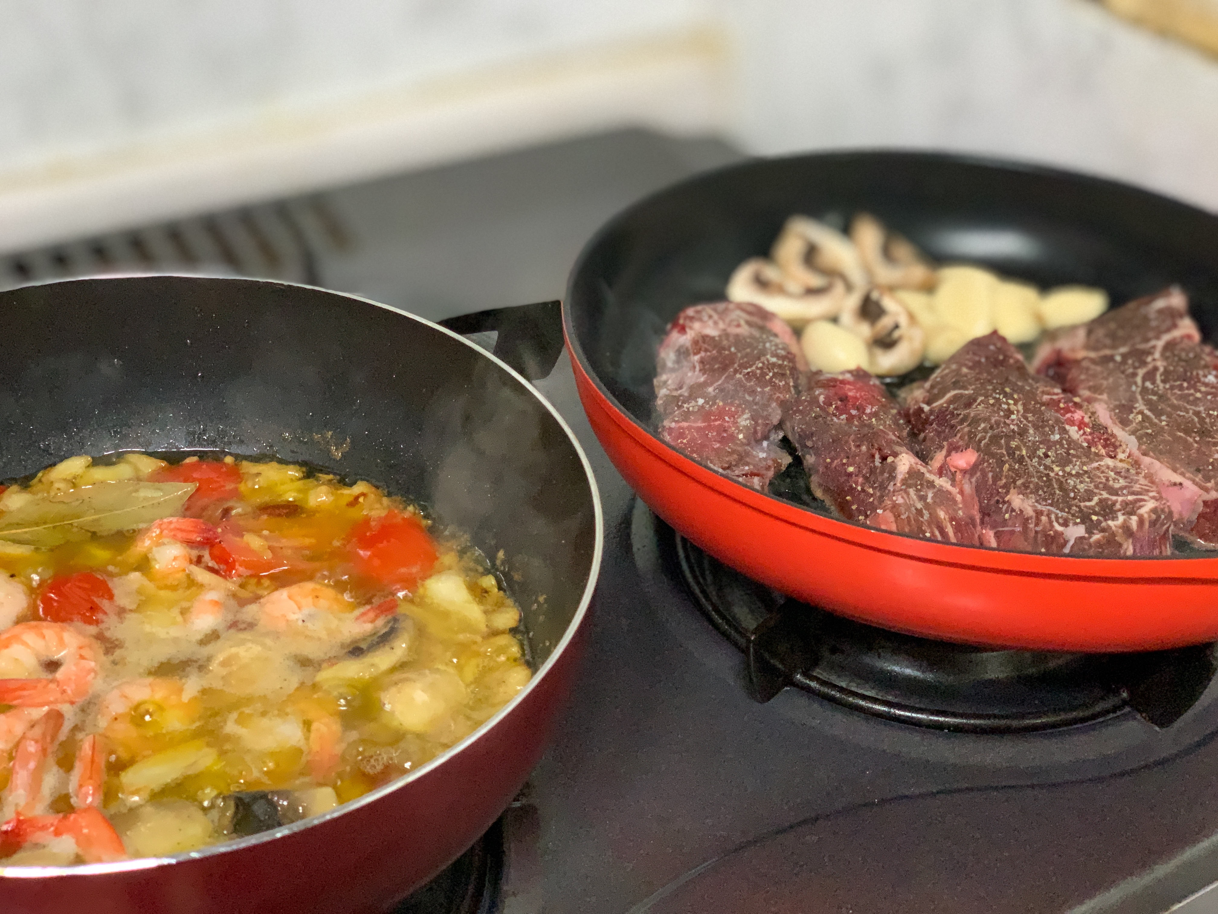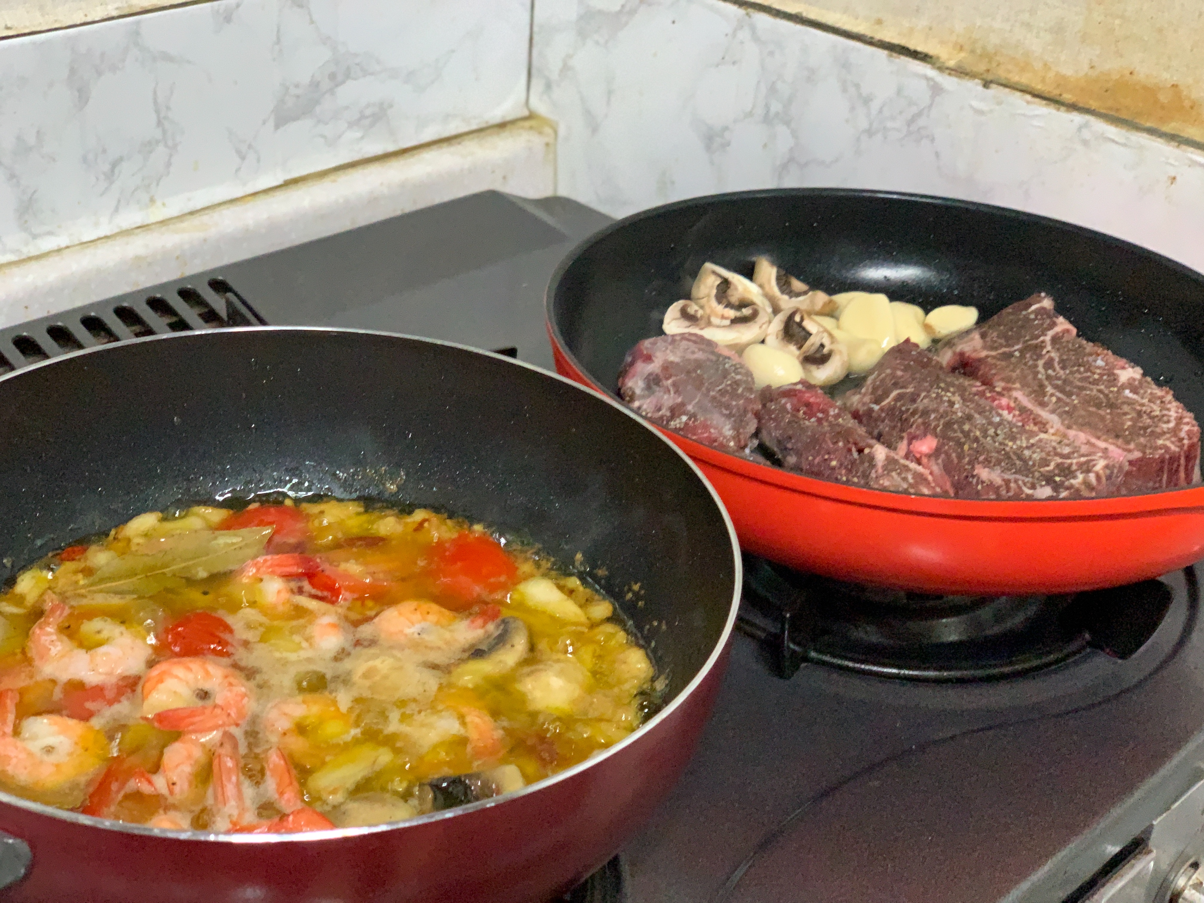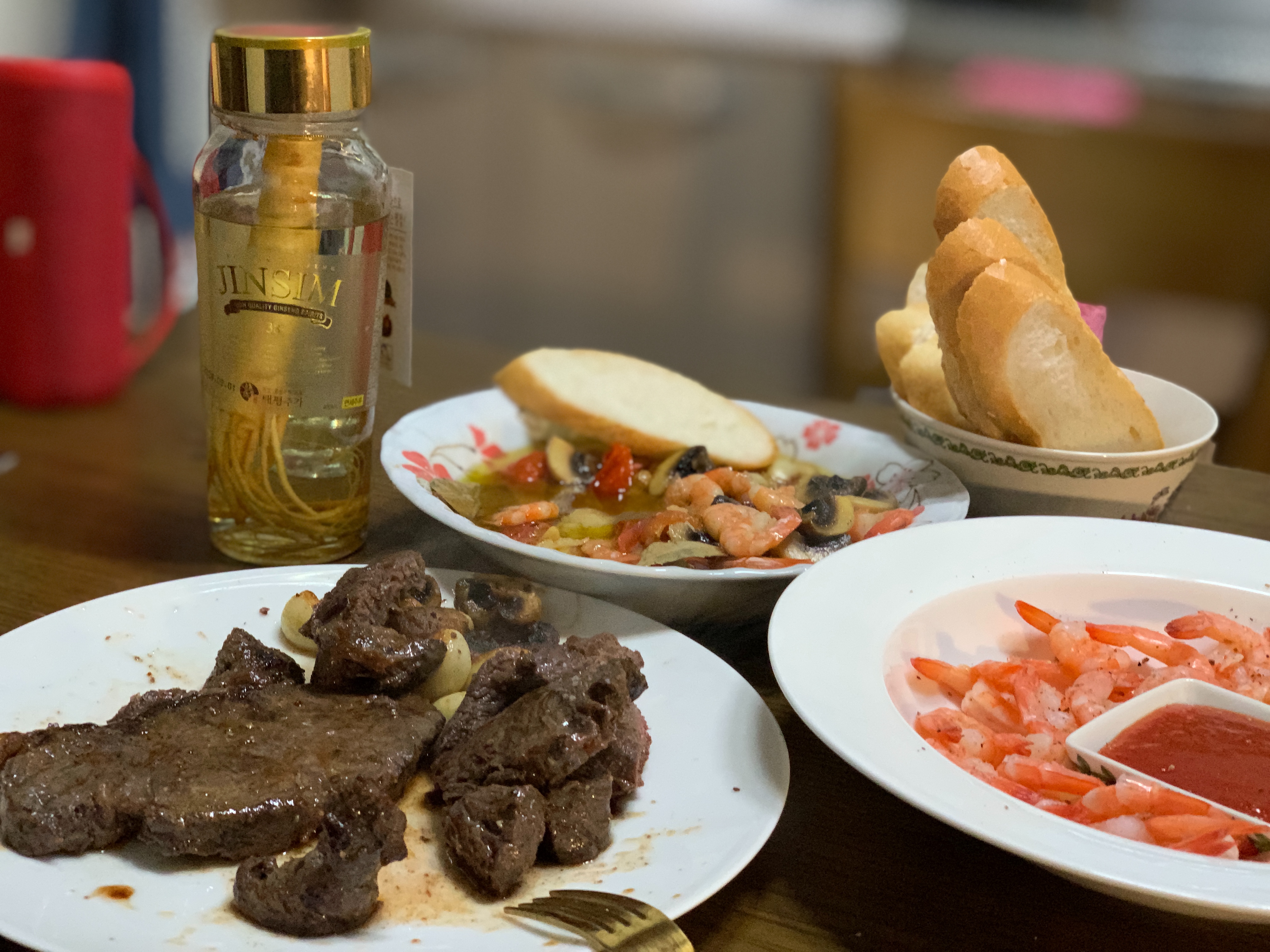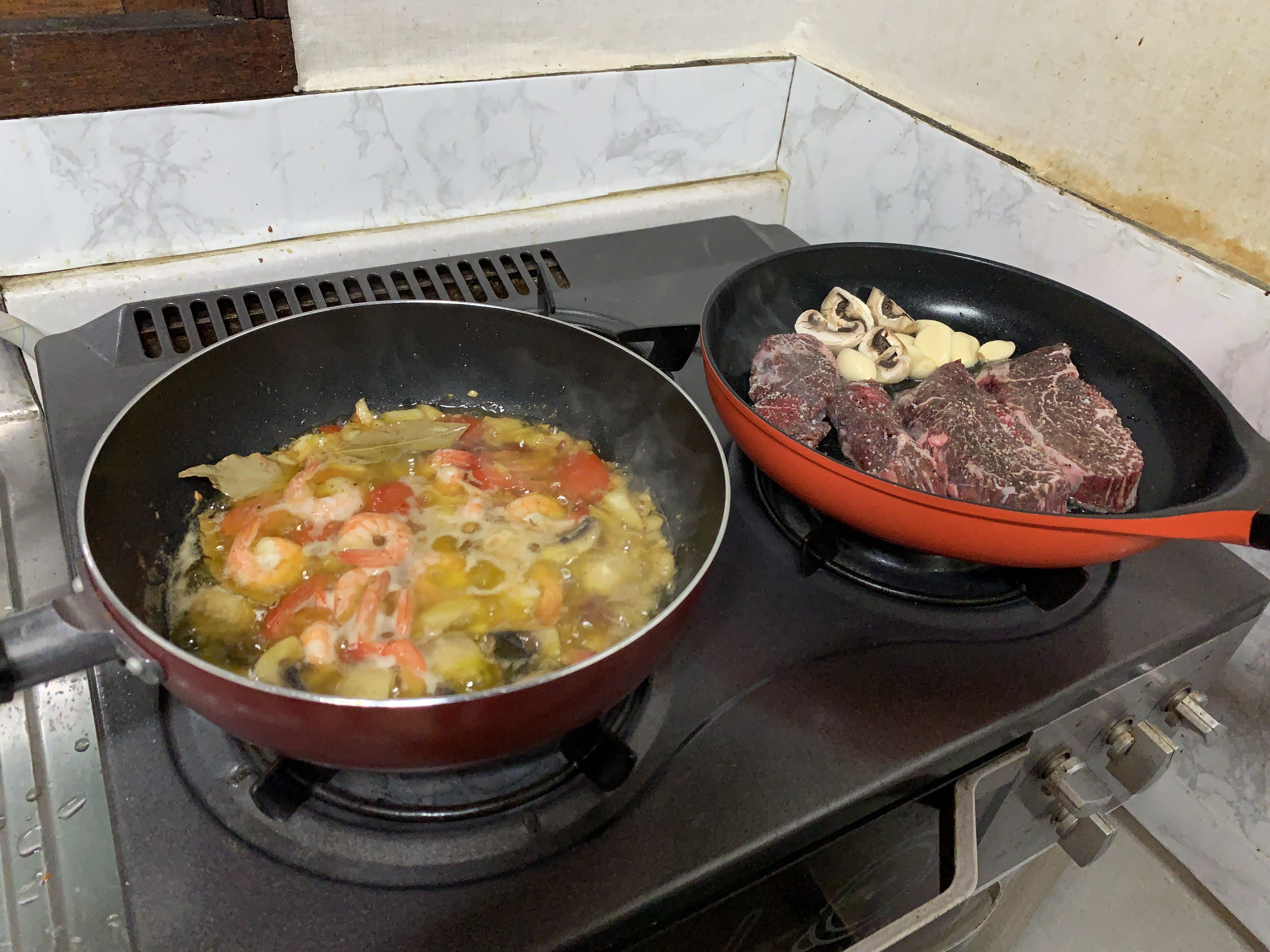 저희는 스테이크를 굽고 감바스에 한잔 하기로 했습니다.