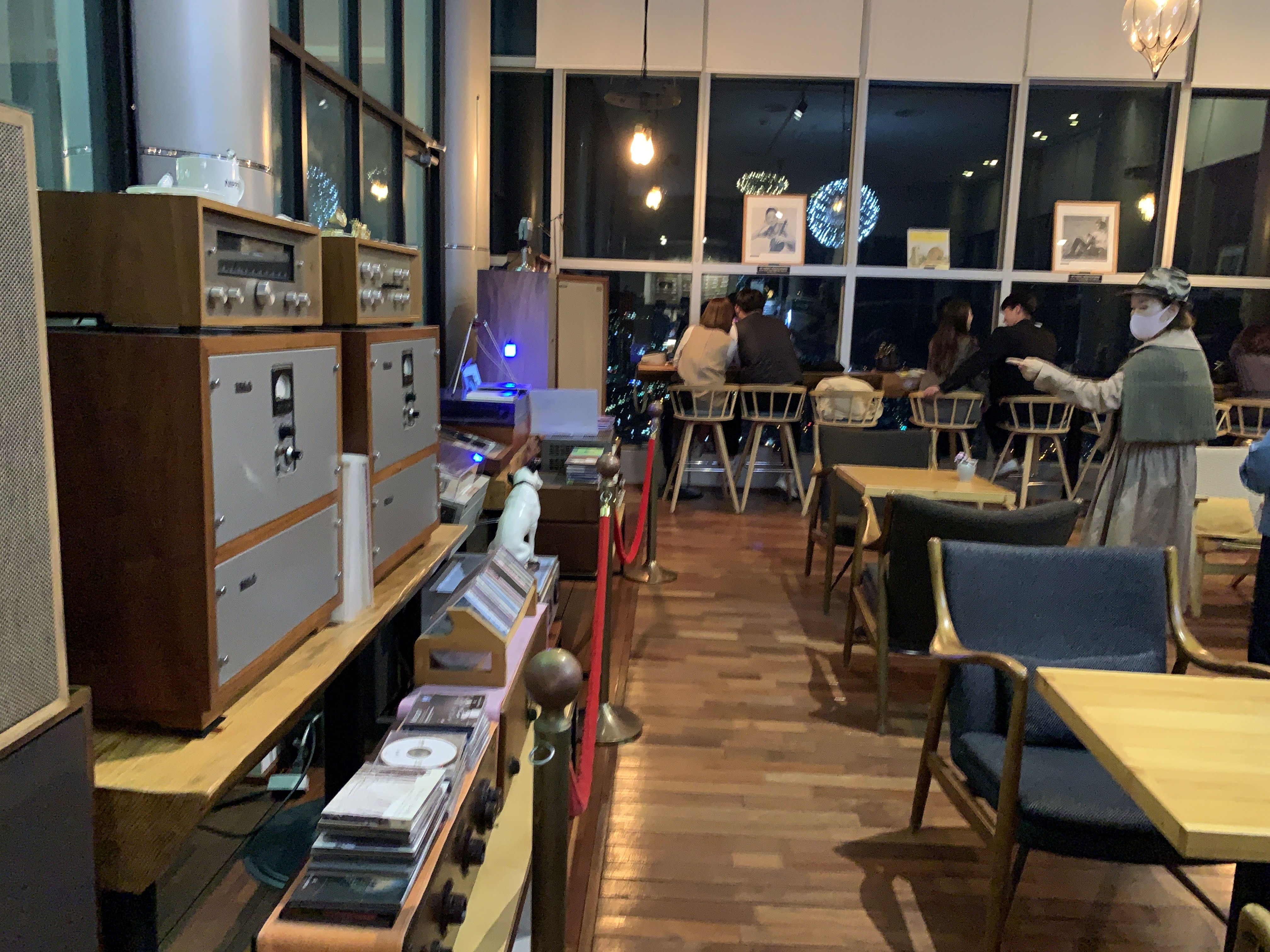실내는 이런 식으로 약간 클래식하게? 인테리어가 되어 있는데 옆에 쌓여 있는 엘피 기계와 스피커들이 정말 멋집니다.