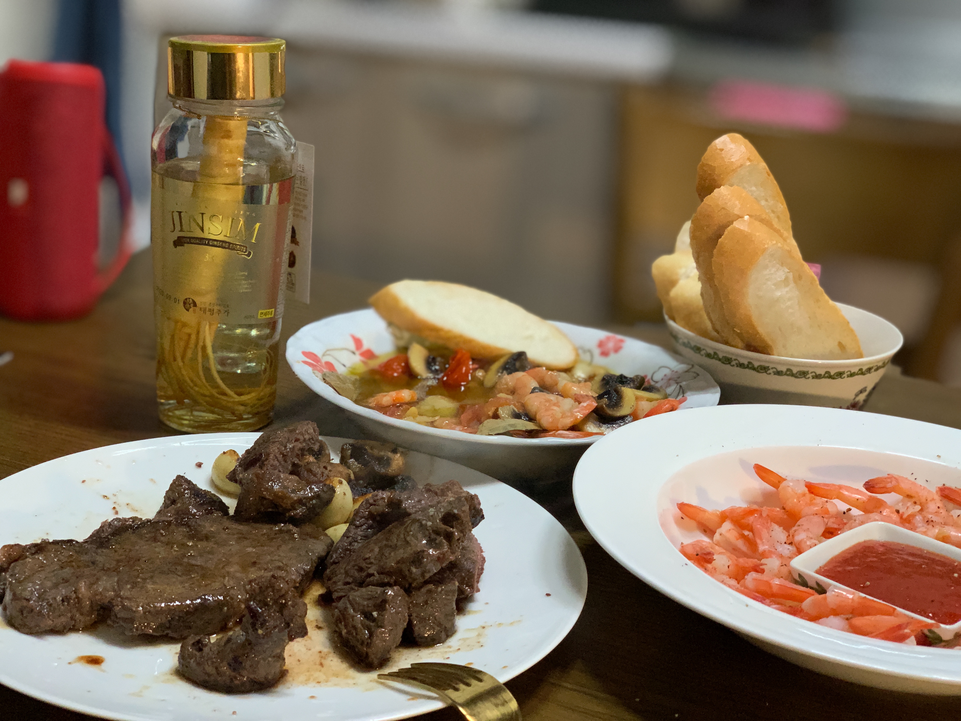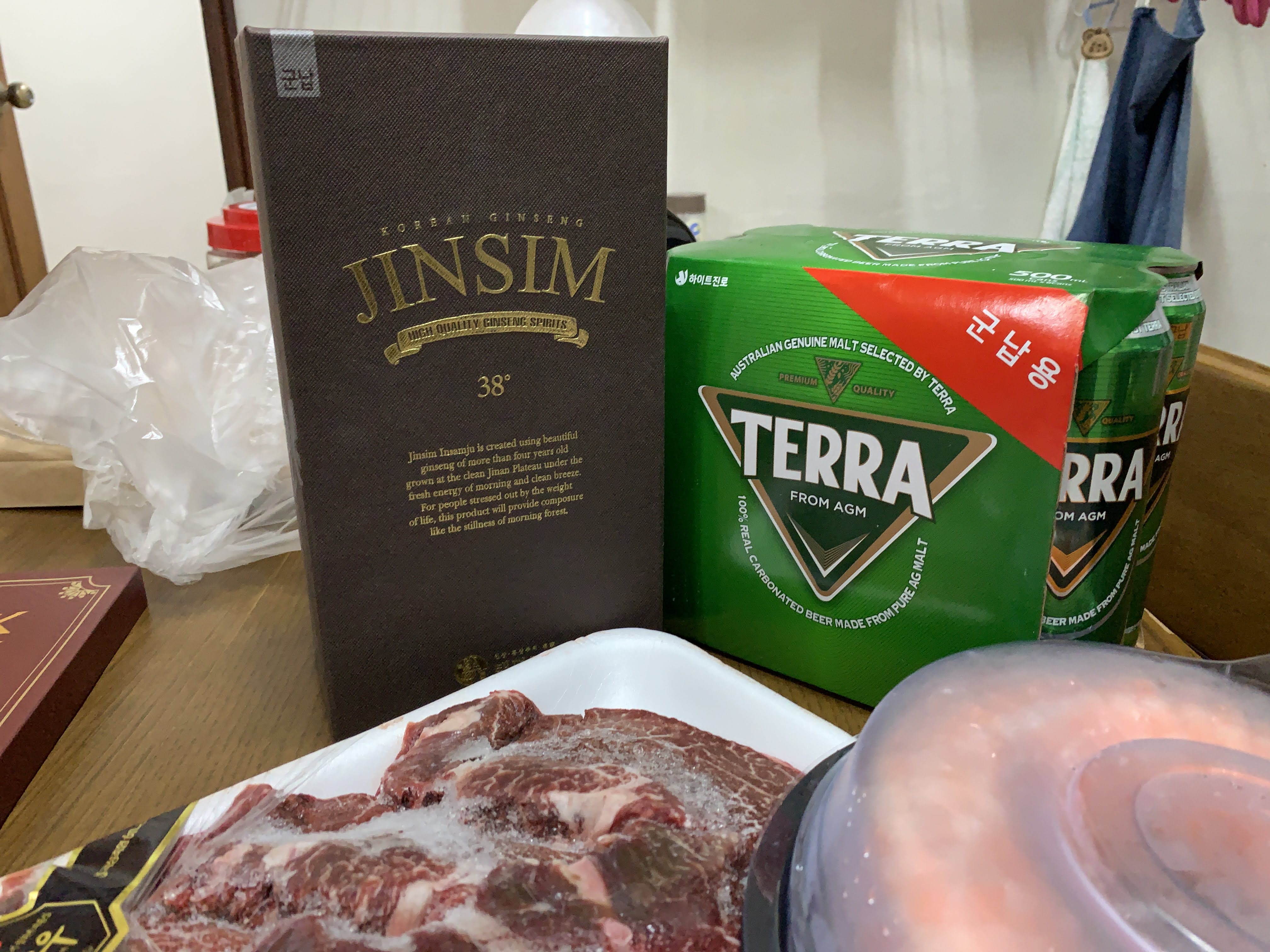 인삼주는 보기보다 도수가 상당히 셌습니다. 한 40도 정도? 위스키 정도의 도수라 저거 하나만 마셔도 충분히 취하더라구요. 저희는 딱 맥주 한 캔씩만 더 따서 마셨습니다.