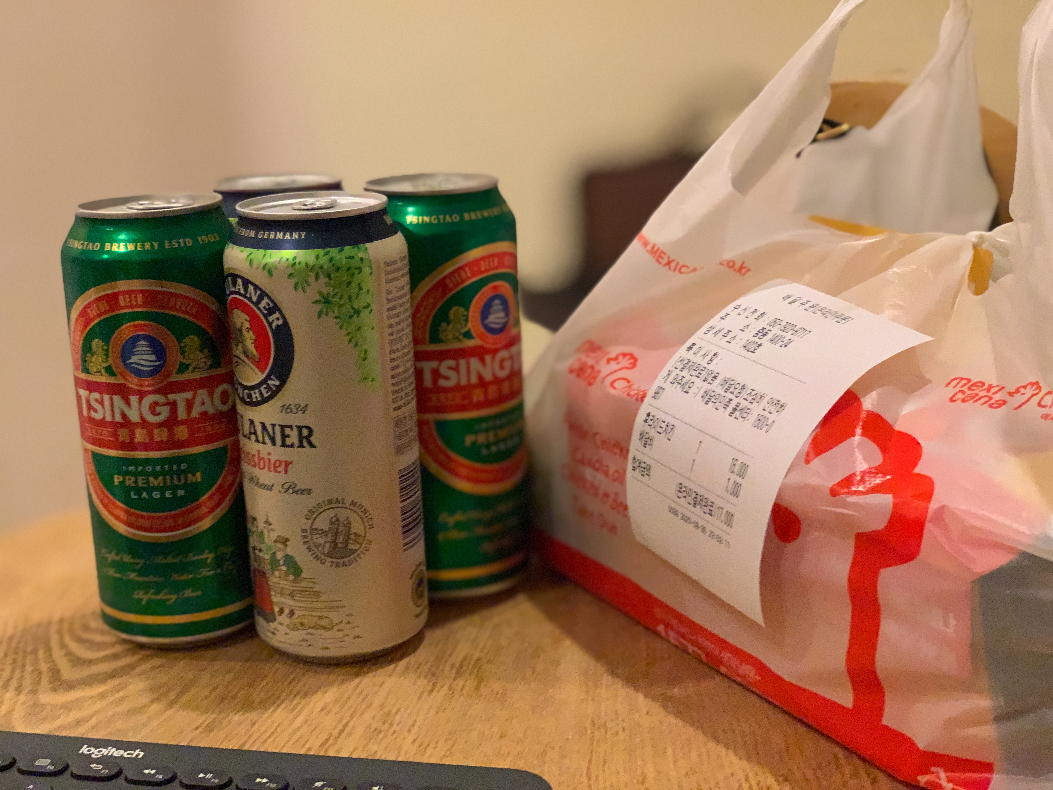 혼자 있다가 배도 고프고 심심해서 치킨 한 마리 시키고, 맥주 사와서 혼자 마시다가 잤습니다.