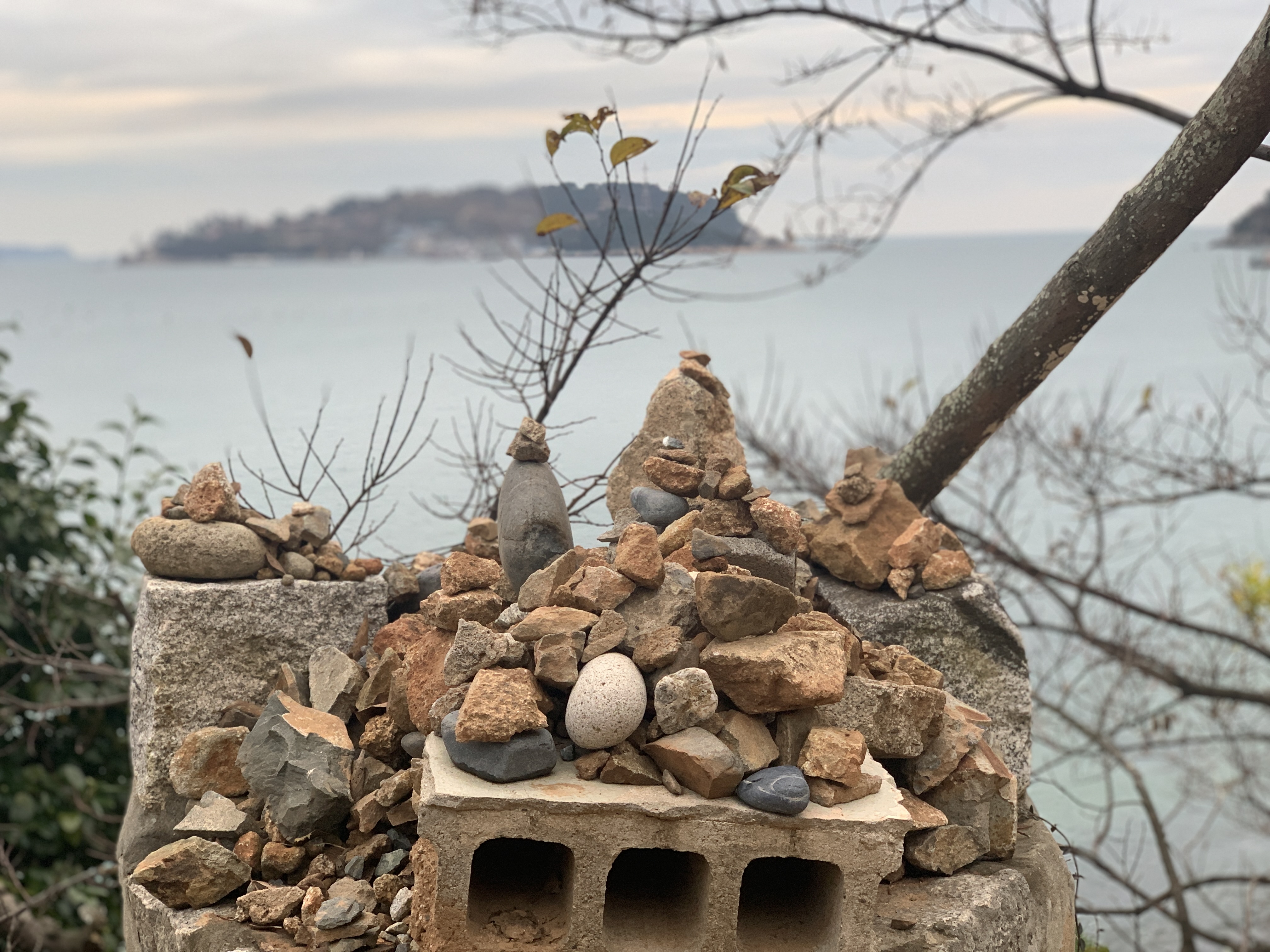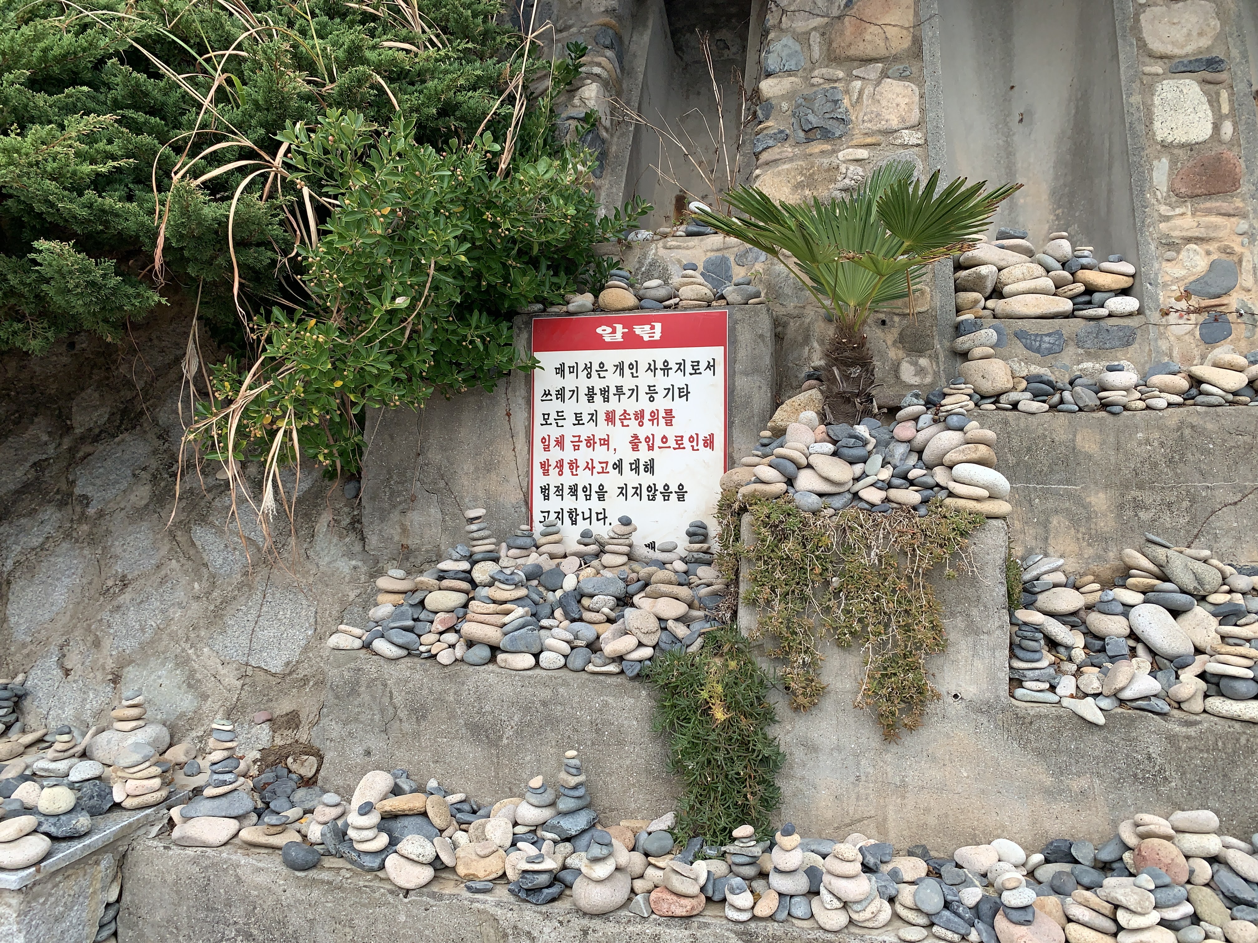사람들이 소원을 비는 돌멩이들이 쌓여 있네요