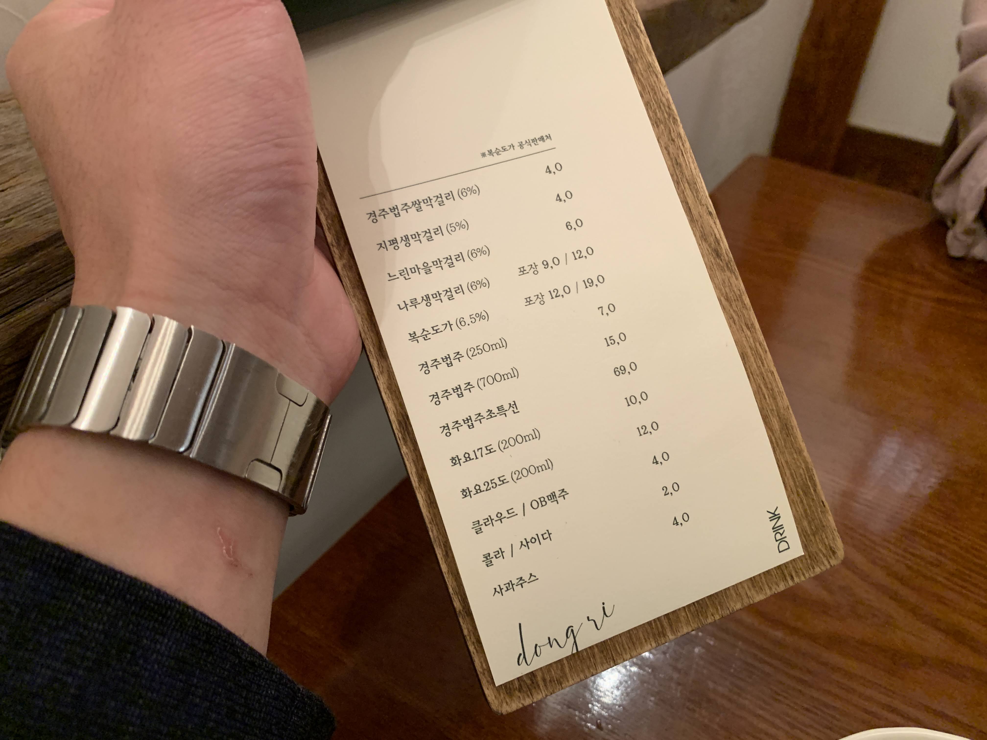 이건 술메뉴인데, 경주에 왔으니 경주법주 쌀막걸리 저거 한병을 시켜봤습니다.