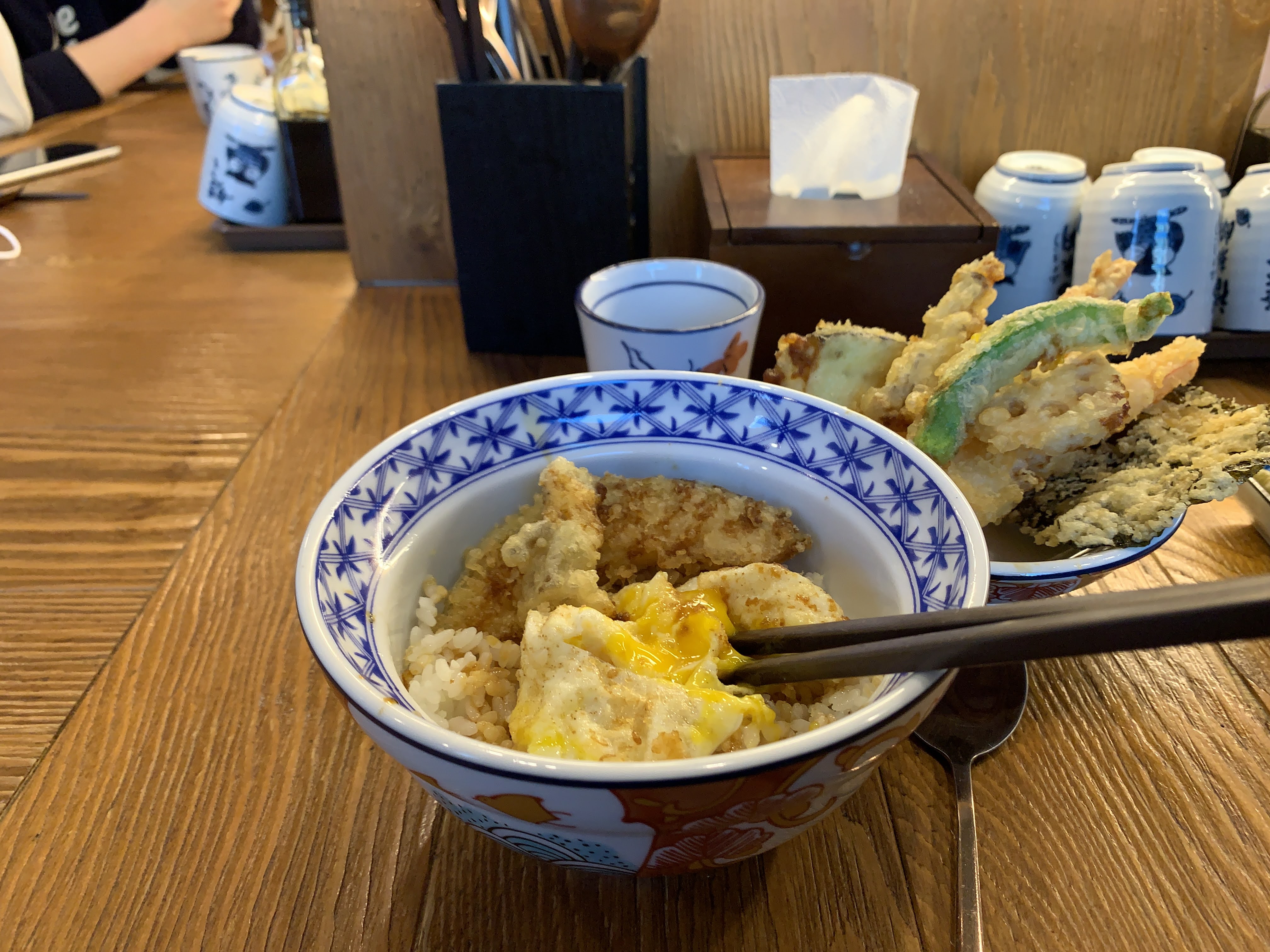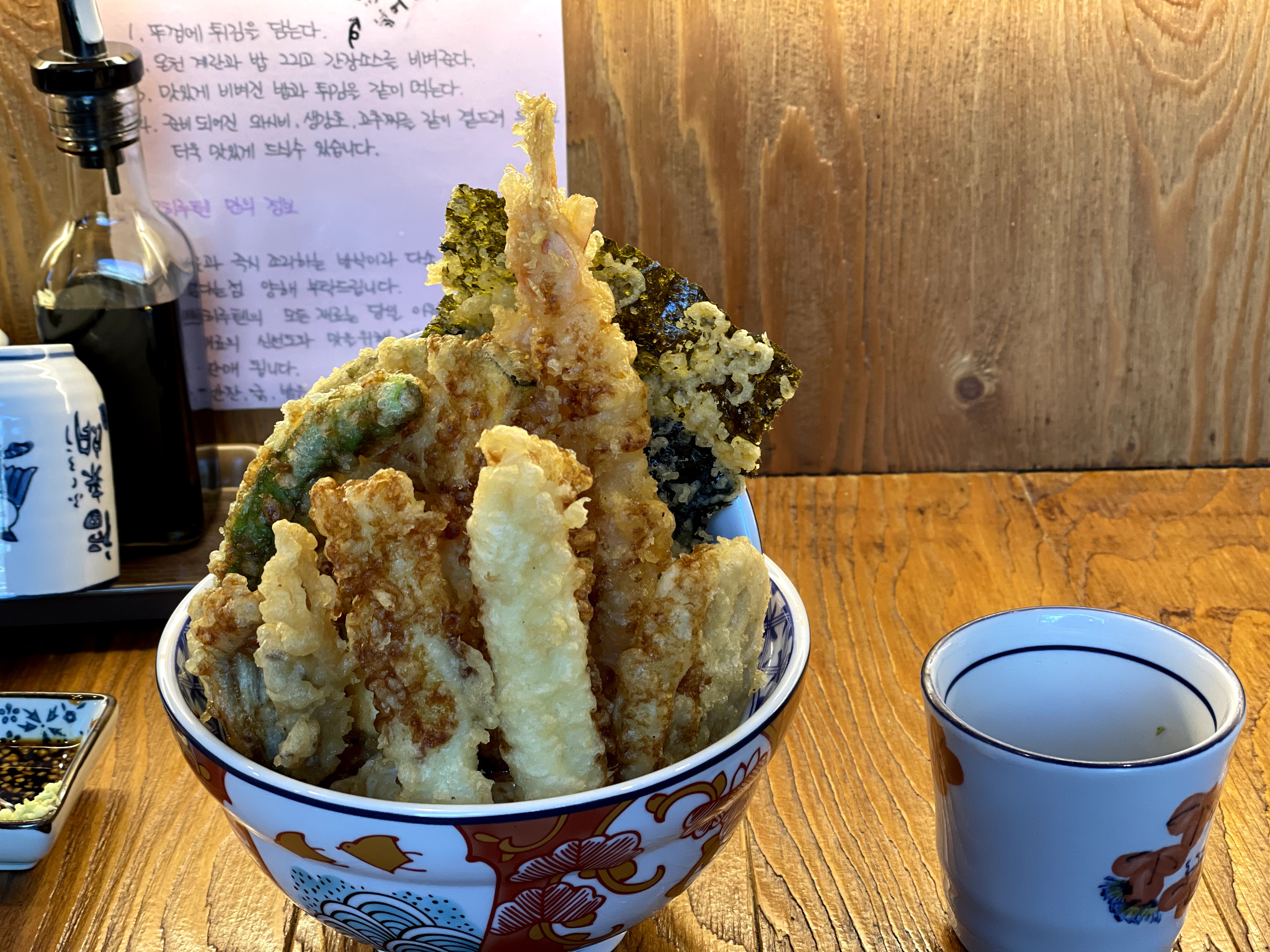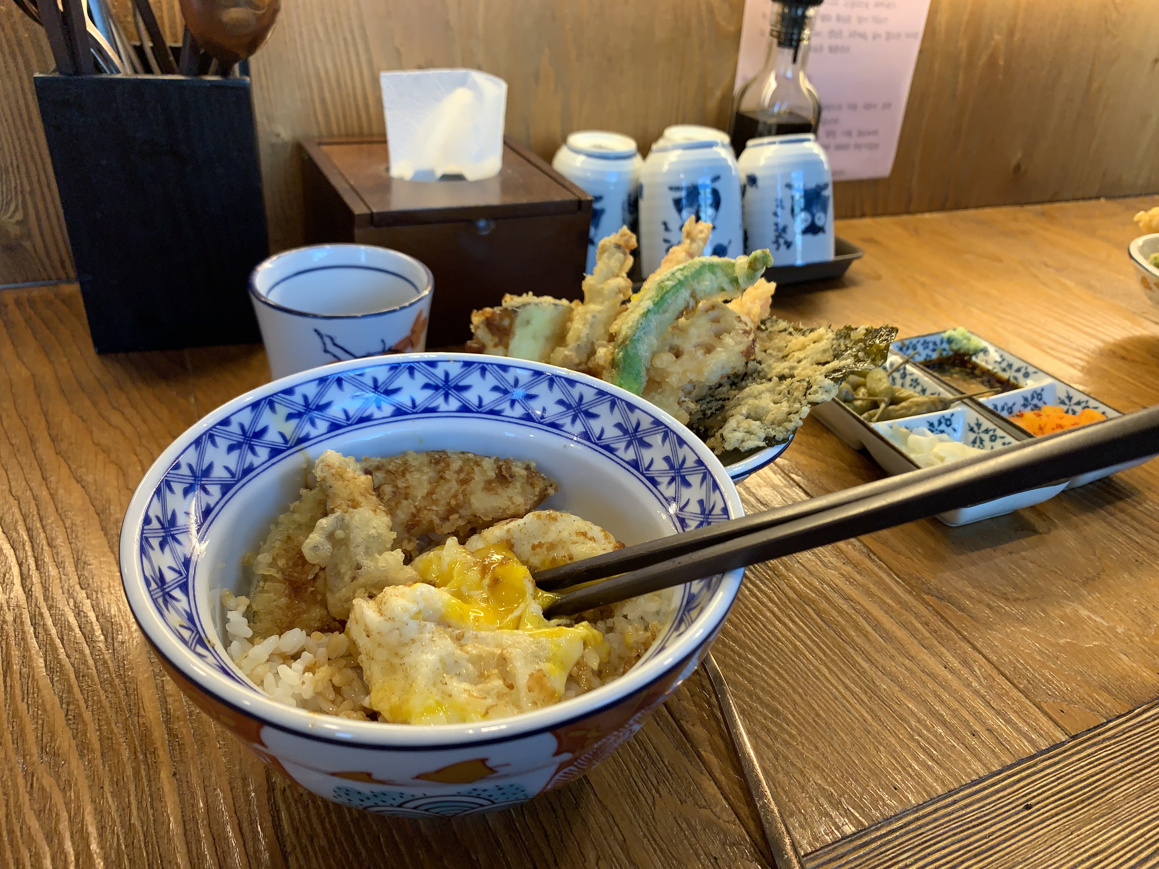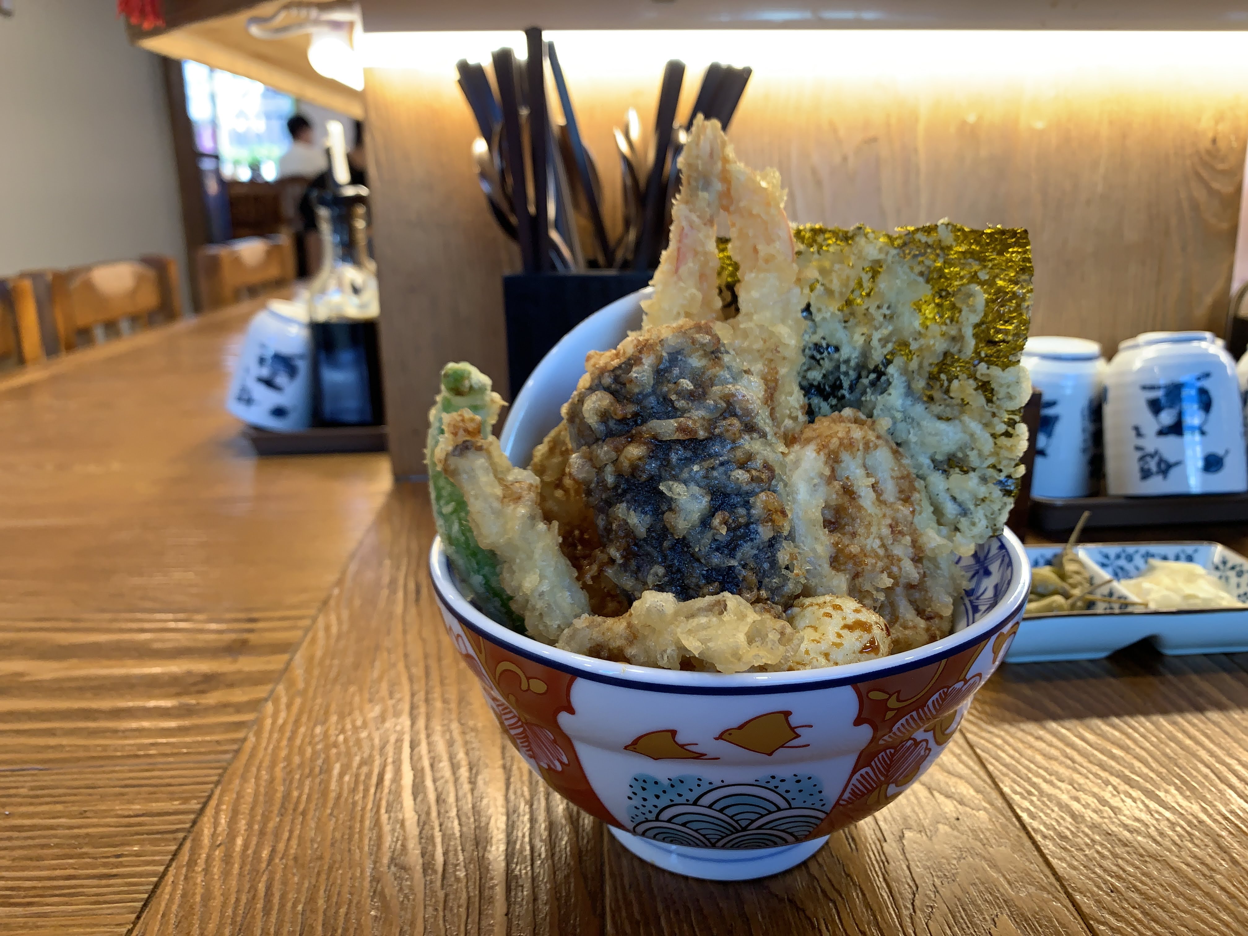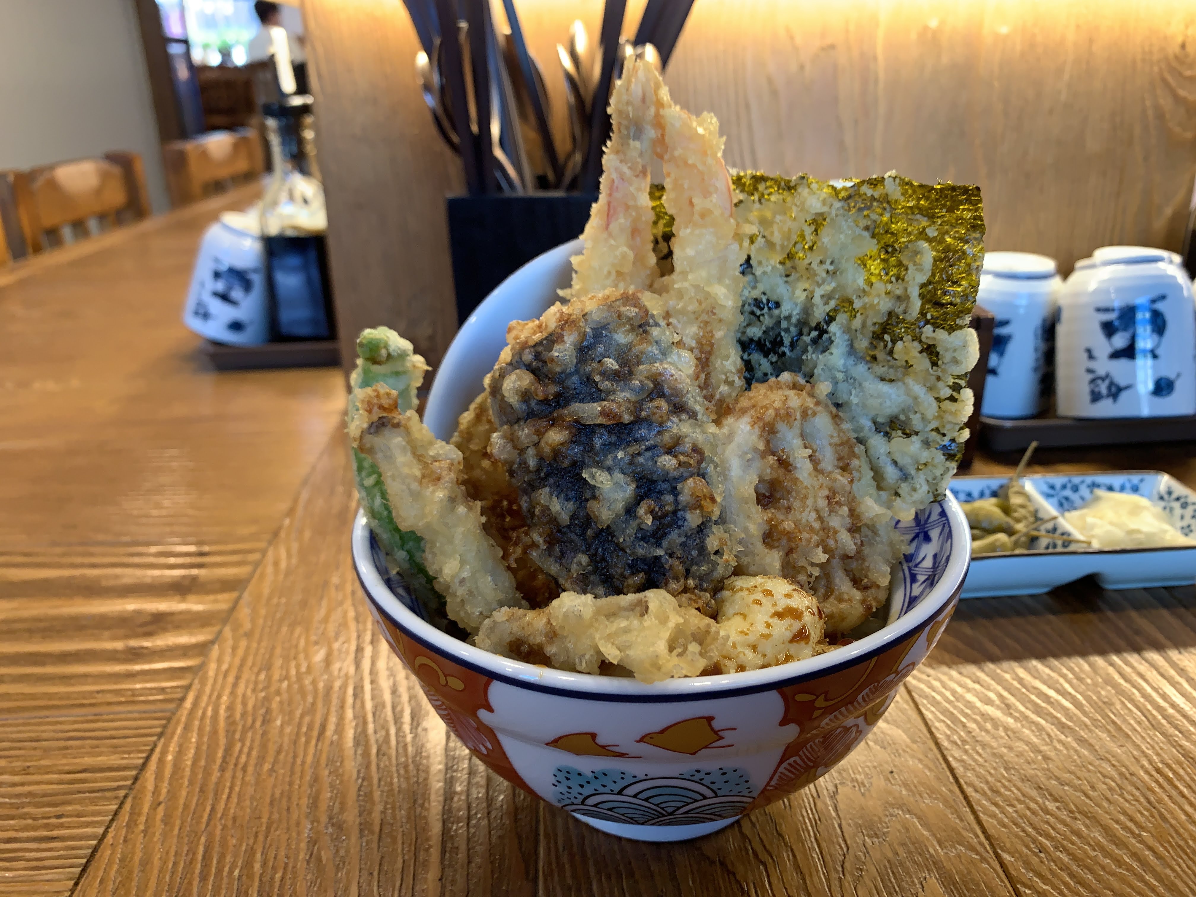 짠! 제가 시킨 텐동입니다. 뭐 고추튀김, 새우튀김, 김튀김 이런 것들이 들어가는데, 저는 텐동은 이런 야채튀김 먹는 맛이라고 생각해서 각종 야채를 주는 게 좋습니다.
