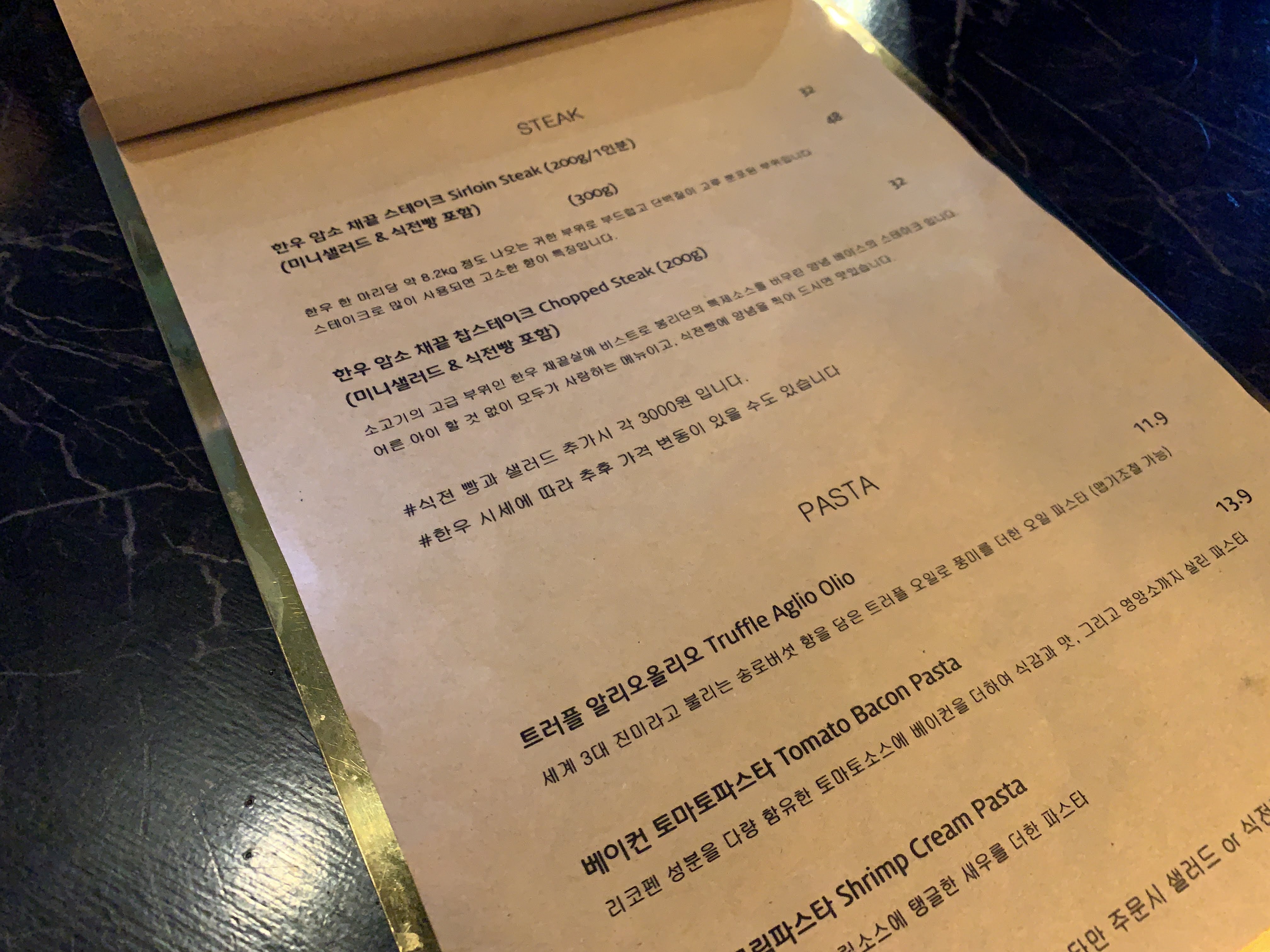 여기는 진짜 미친 가성비인 게 트러플 알리오올리오가 11,900원밖에 하지 않습니다. 개인적으로 스테이크는 조금 평범하고 가성비가 좋다는 생각은 안 들었는데, 트러플 알리오올리오는 정말 맛있고 가성비도 좋았습니다.