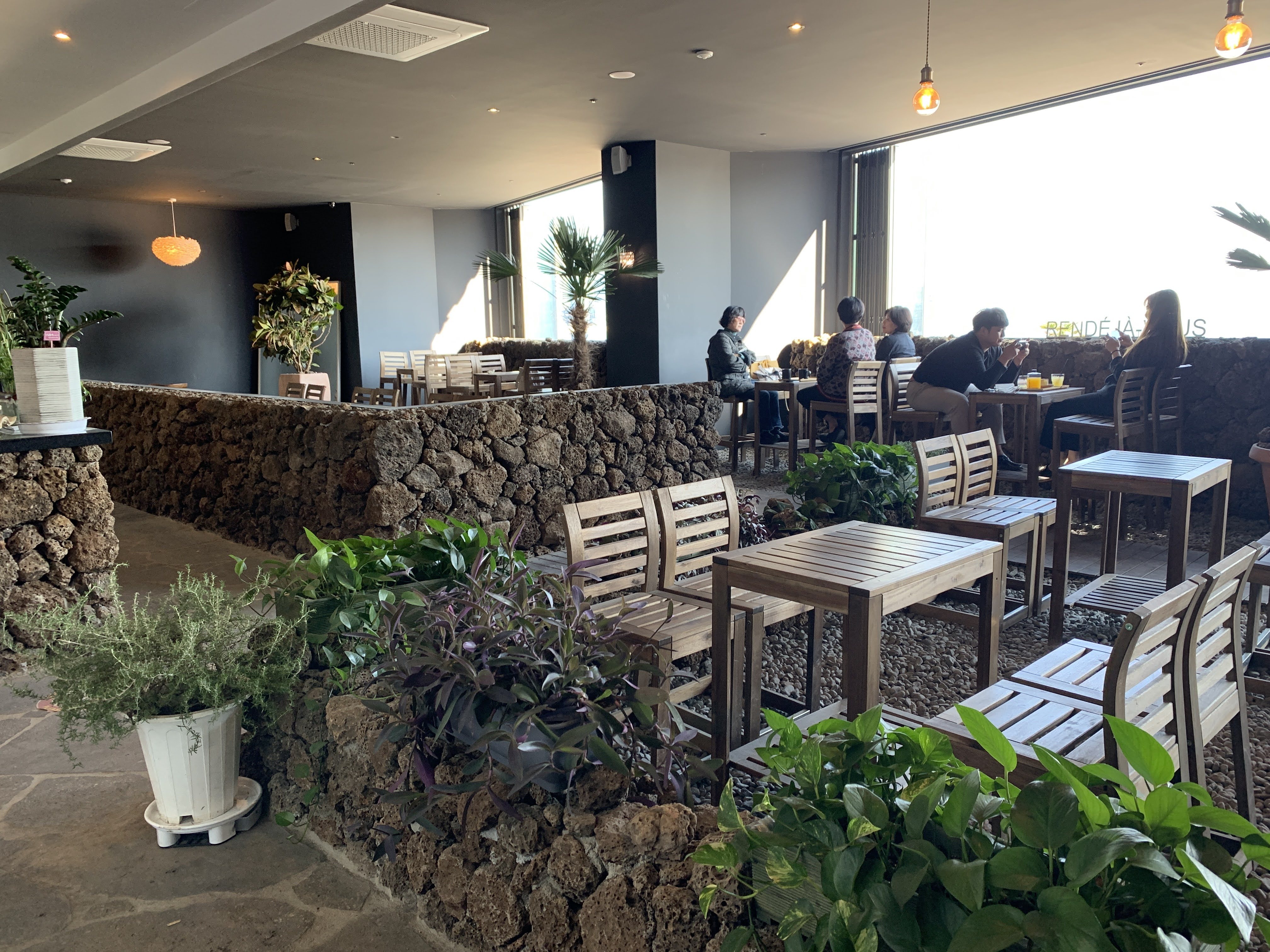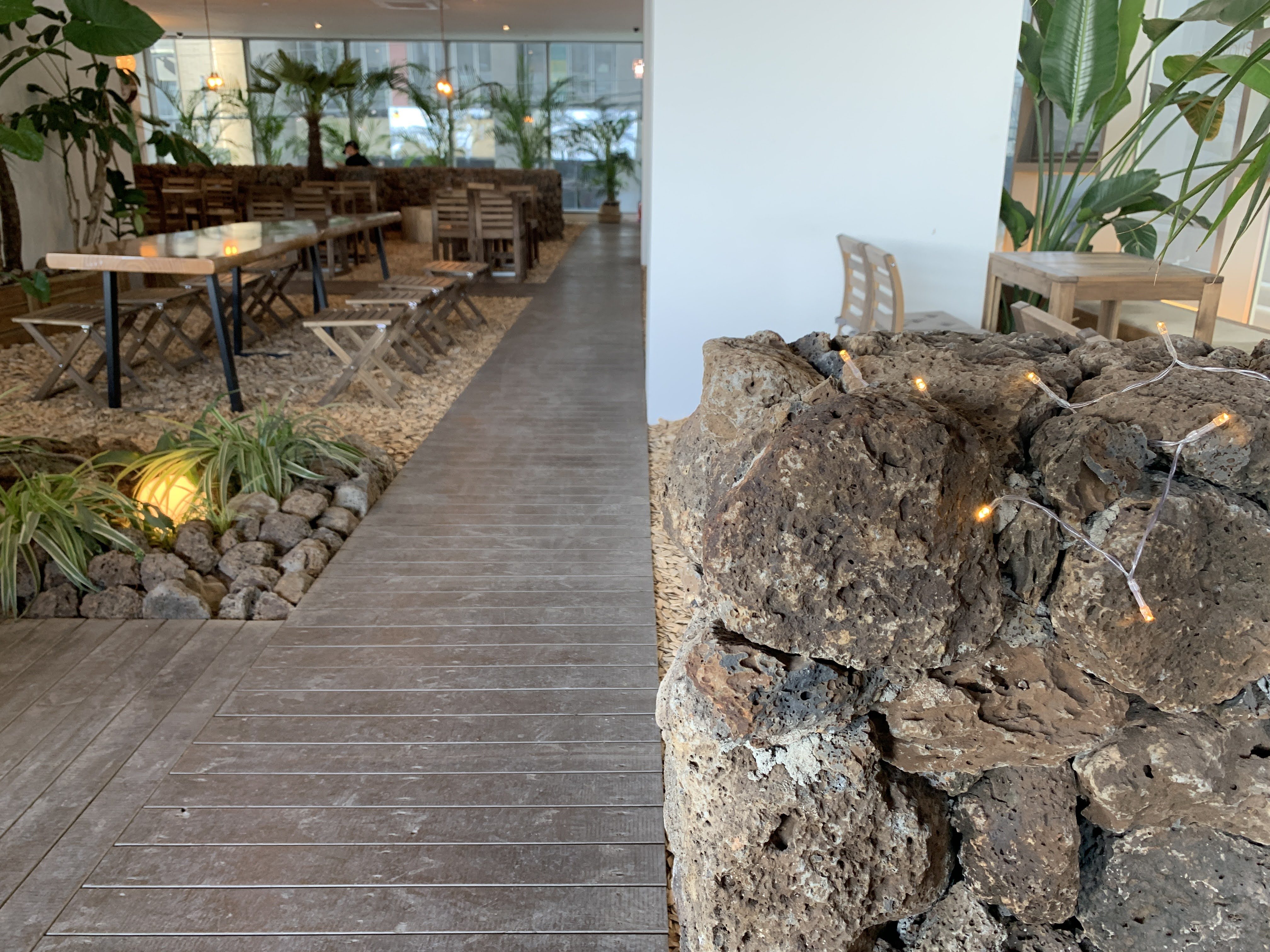 제주도에서 볼 수 있는 돌담을 이용해서 인테리어를 했습니다.