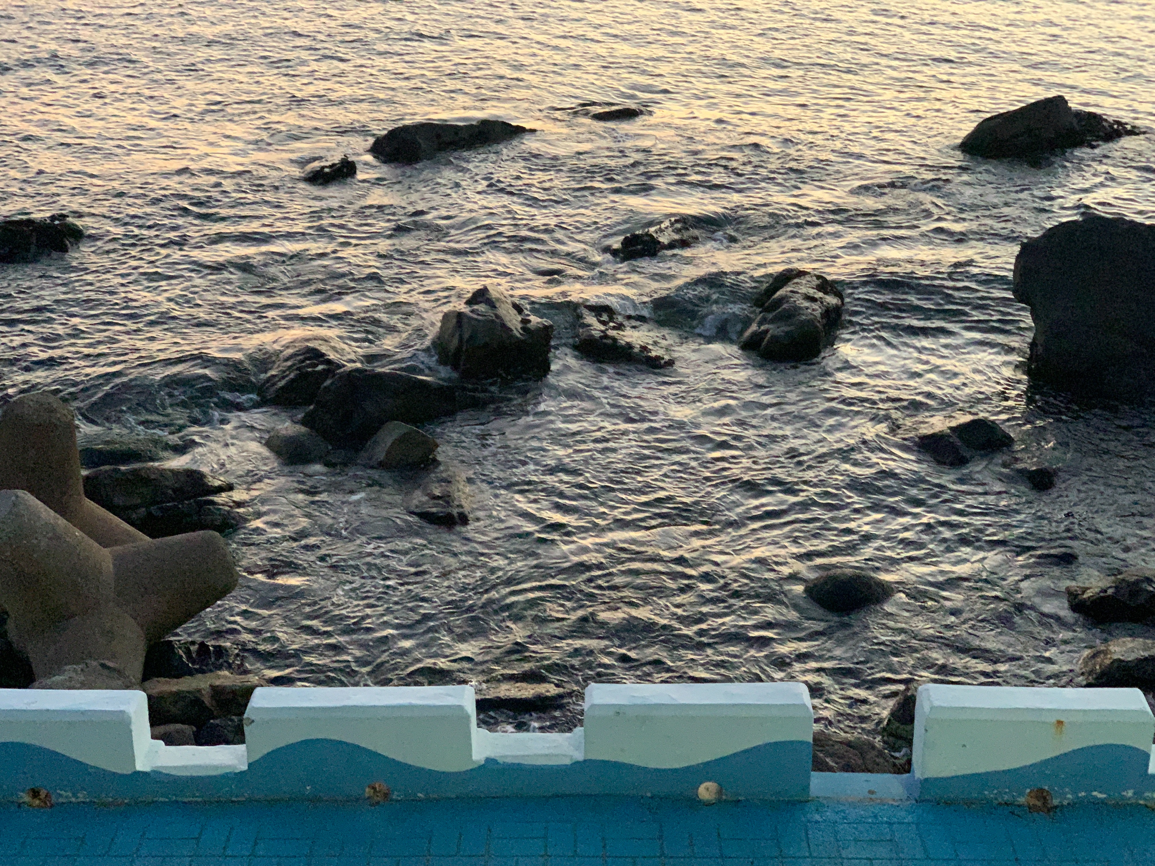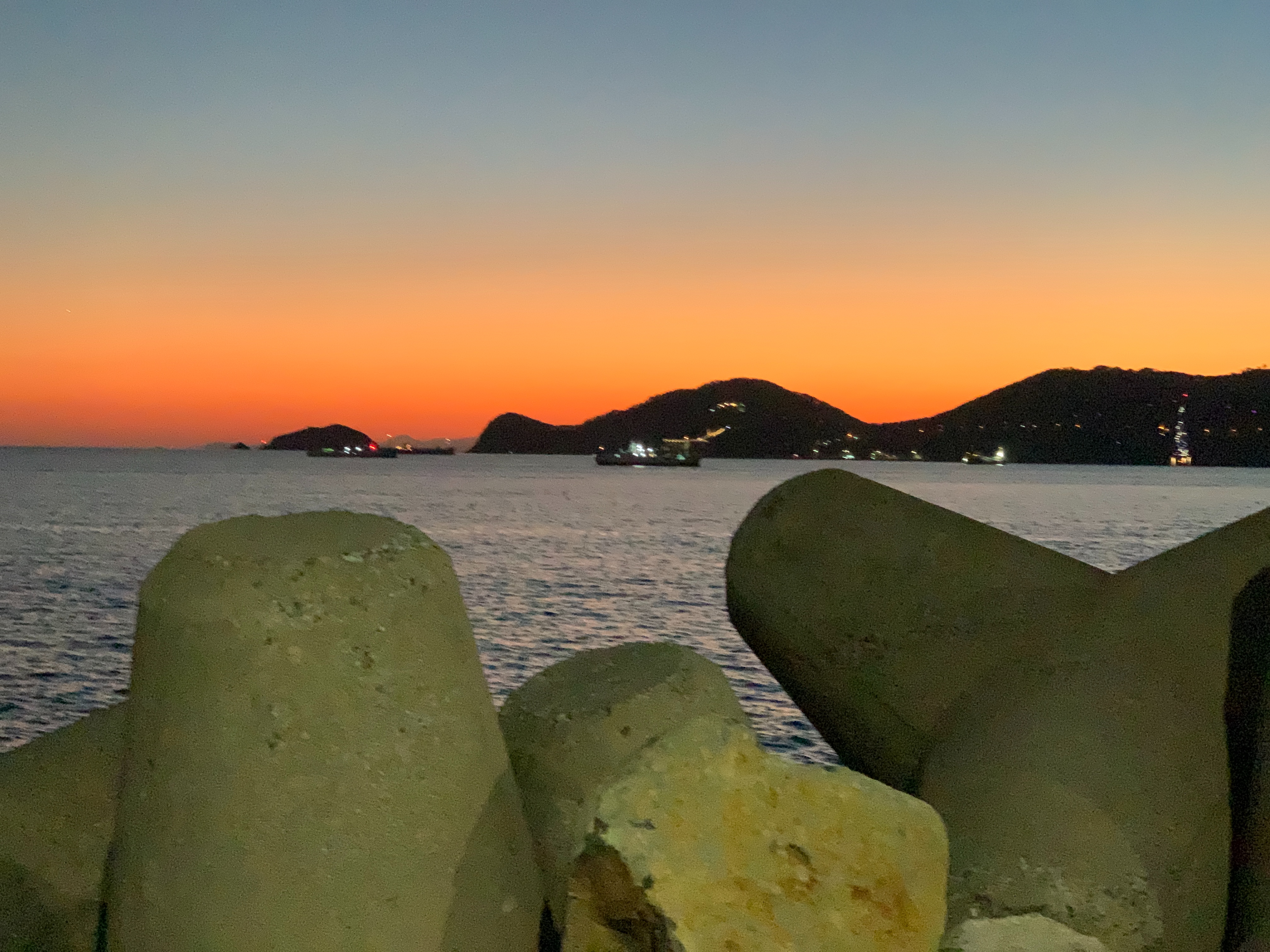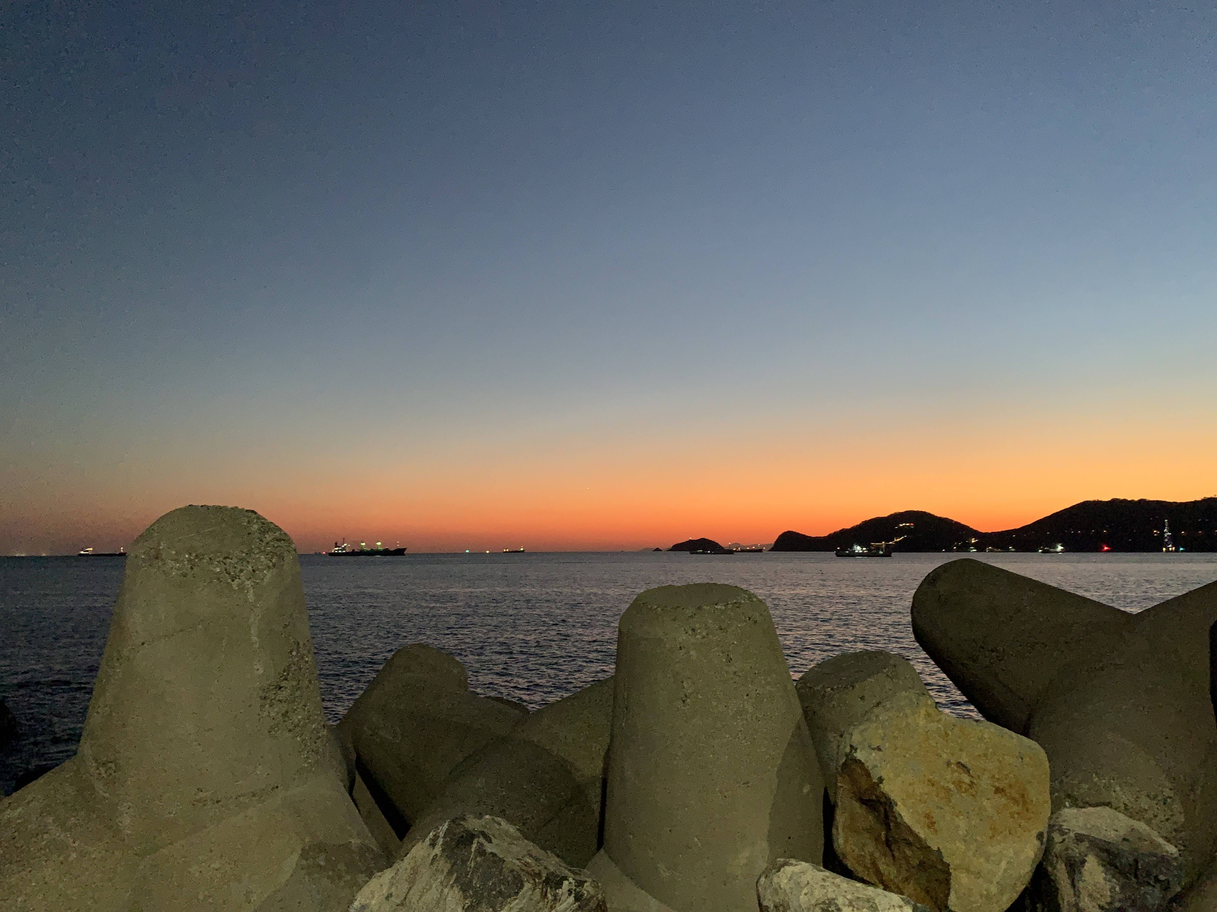 방파제 뒤로 지는 석양 모습. 아름답습니다.