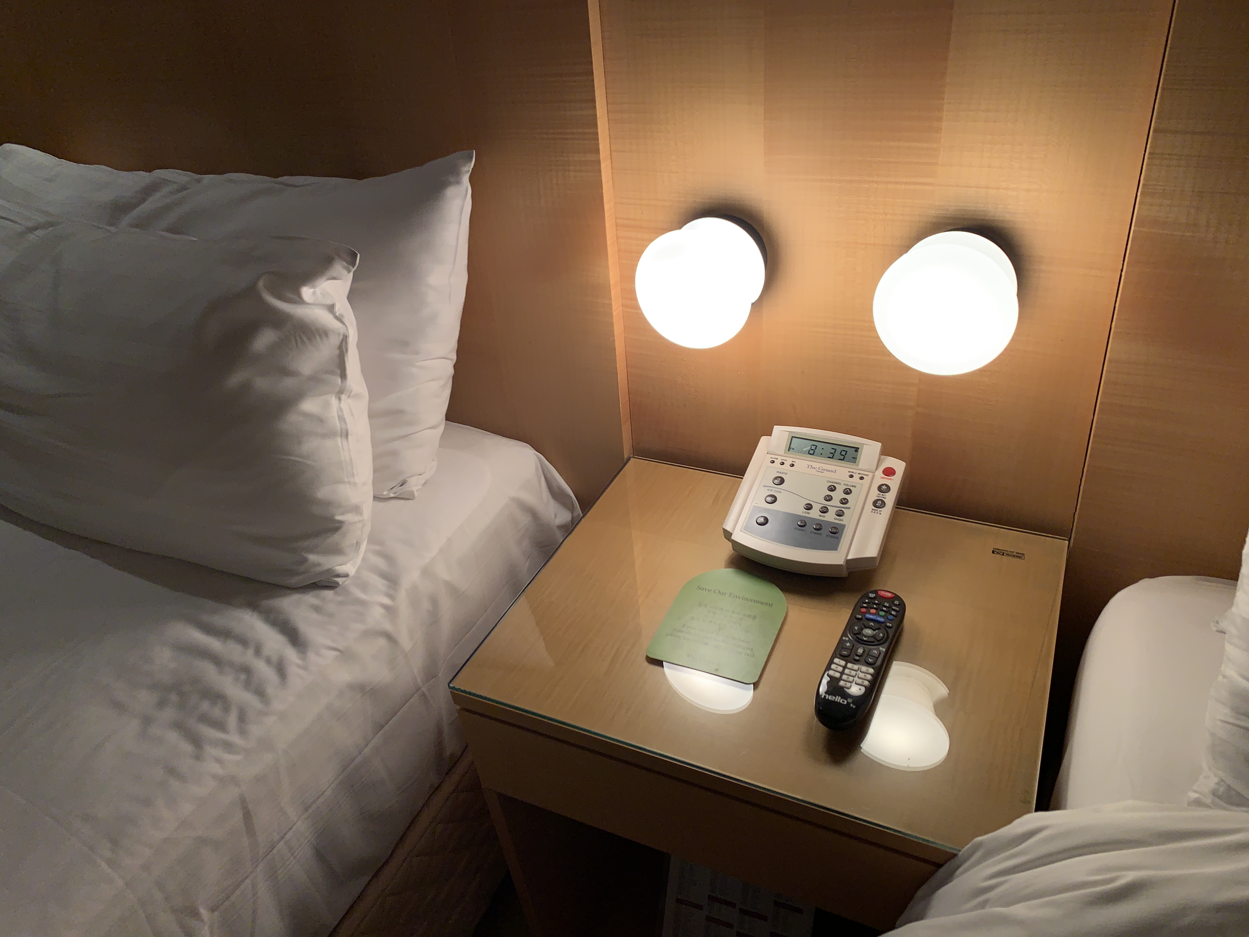 침대 사이에는 협탁이 있고, 저렇게 은은하게 조명도 있습니다.