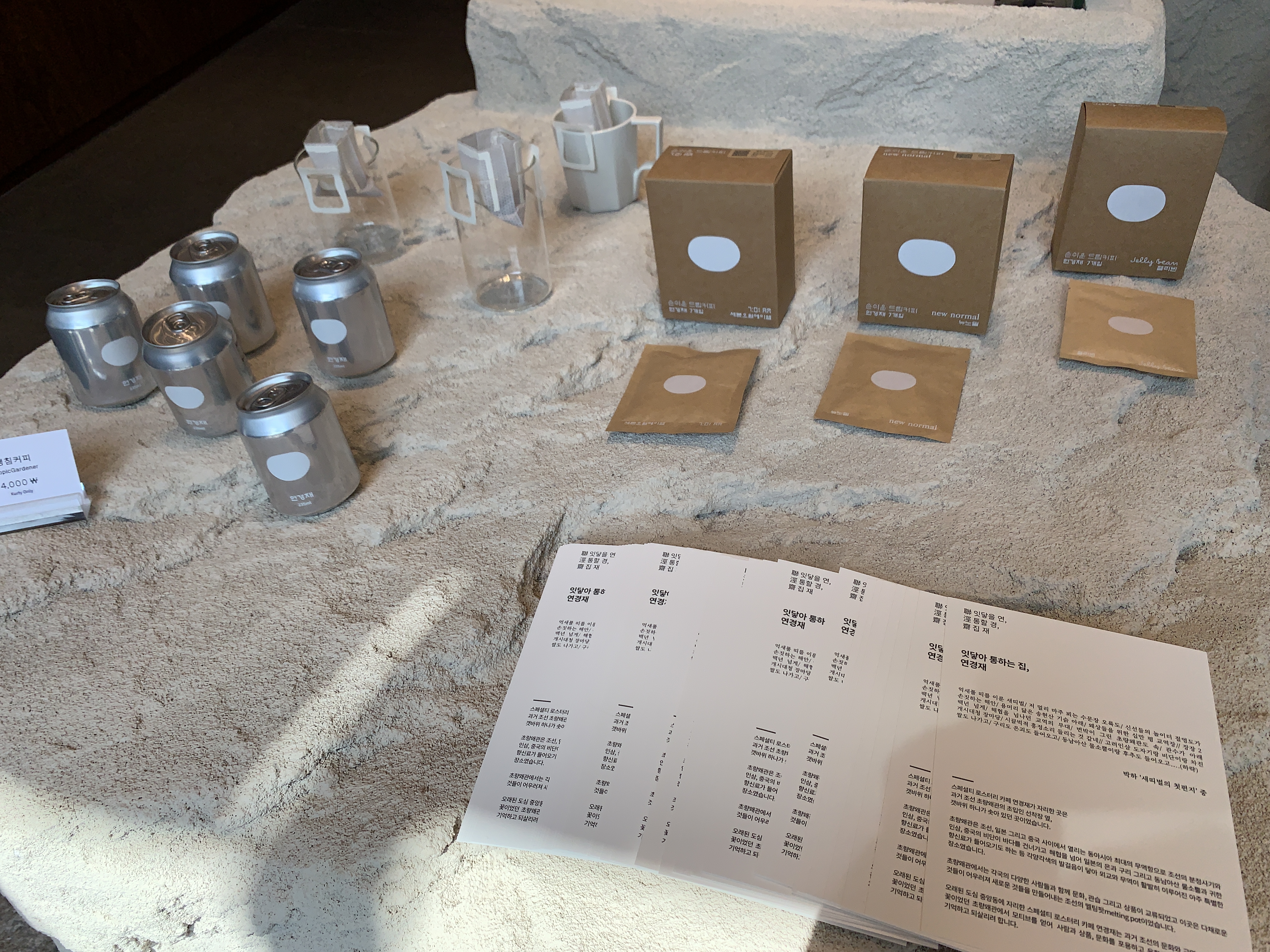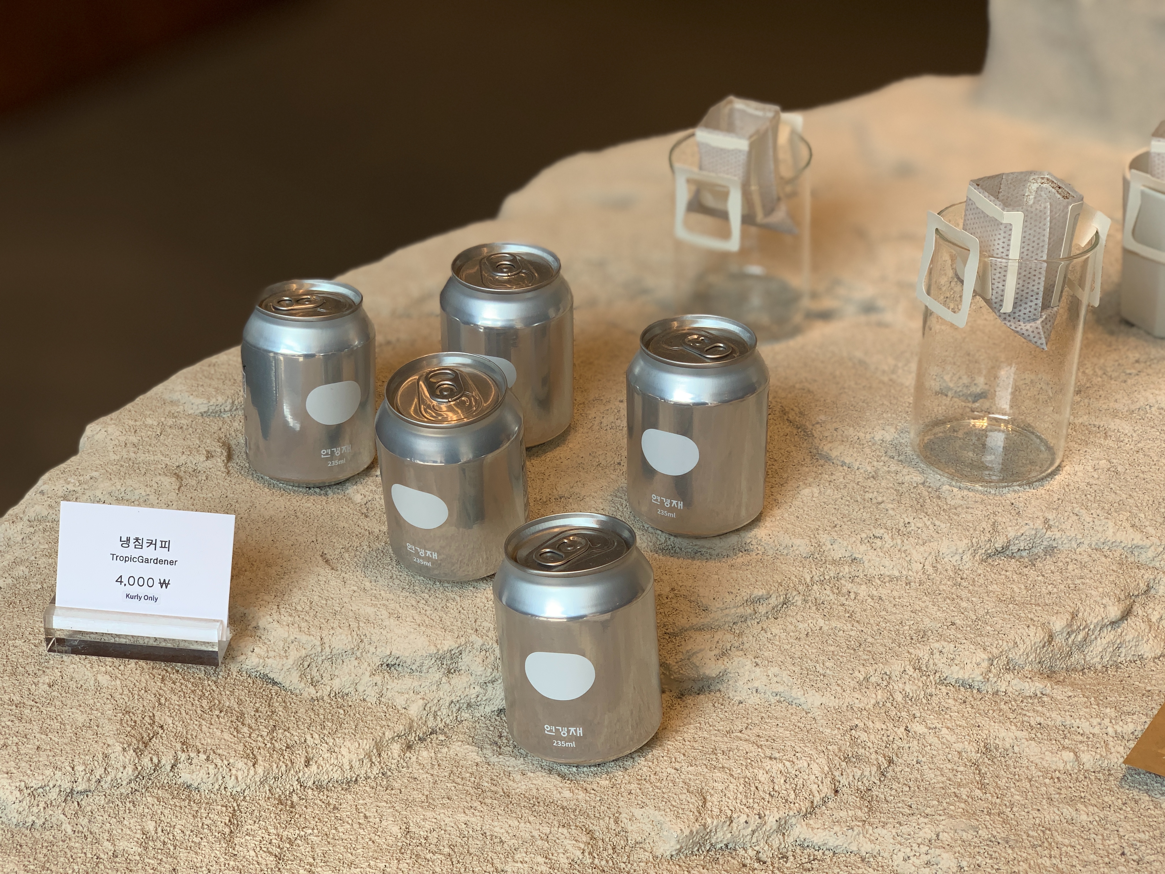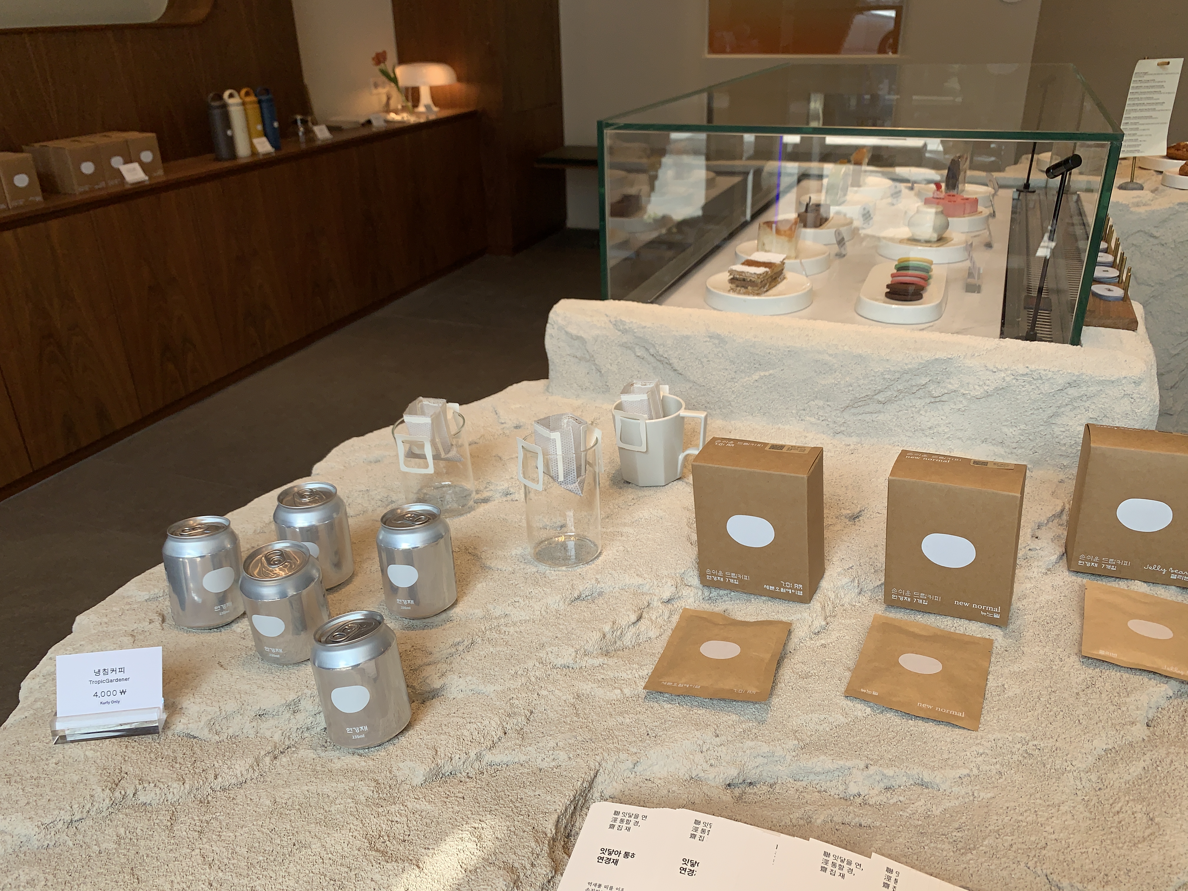 이 가게에서 판매하는 커피와 디저트가 이런 식으로 전시가 되어 있는데 모래사장 위에 커피캔이 올려져 있는 모습이 아기자기하니 귀엽습니다. 어디 여행온 느낌도 나고.